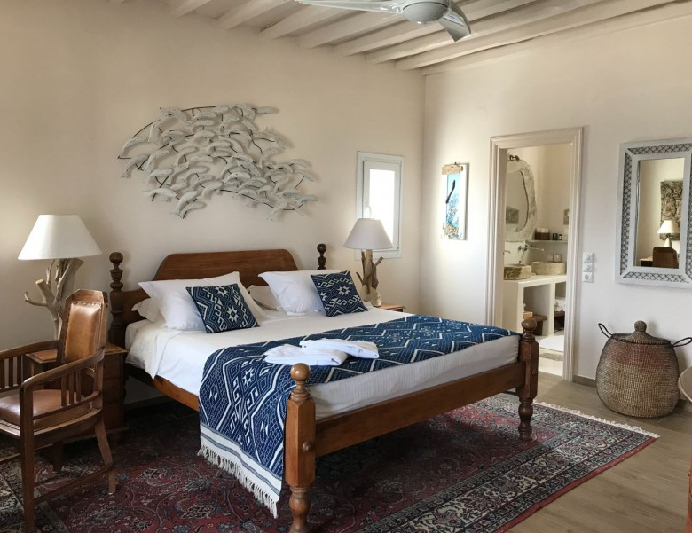 Here you will find the master bedroom which takes up the entire floor. it also has an ensuite bathroom. This room has a private balcony and spectacular, unobstructed views of the sea from west to east, the sunsets, as well as Mykonos town.