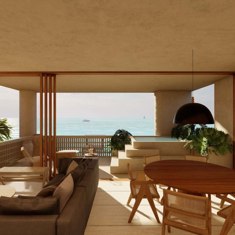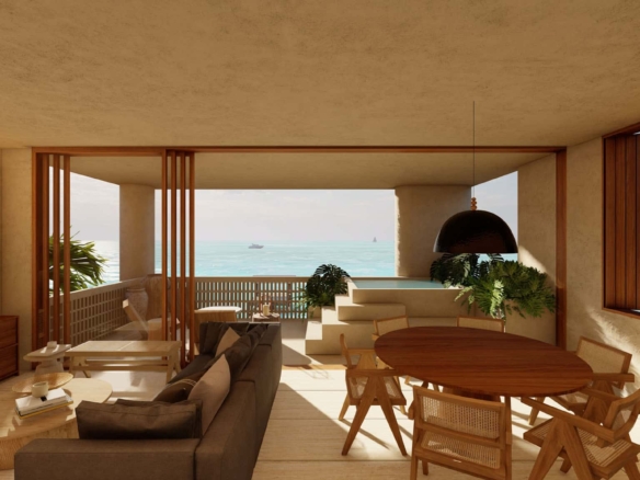 Discover the perfect blend of elegance and tranquility with this stunning 3-bedroom beachfront condo located in Bahia, a prestigious development in Tankah Bay, Tulum. Spanning 168.3 m2 (1,812 sq. ft.), this residence offers unparalleled ocean views and direct beach access, making it a true tropical oasis.