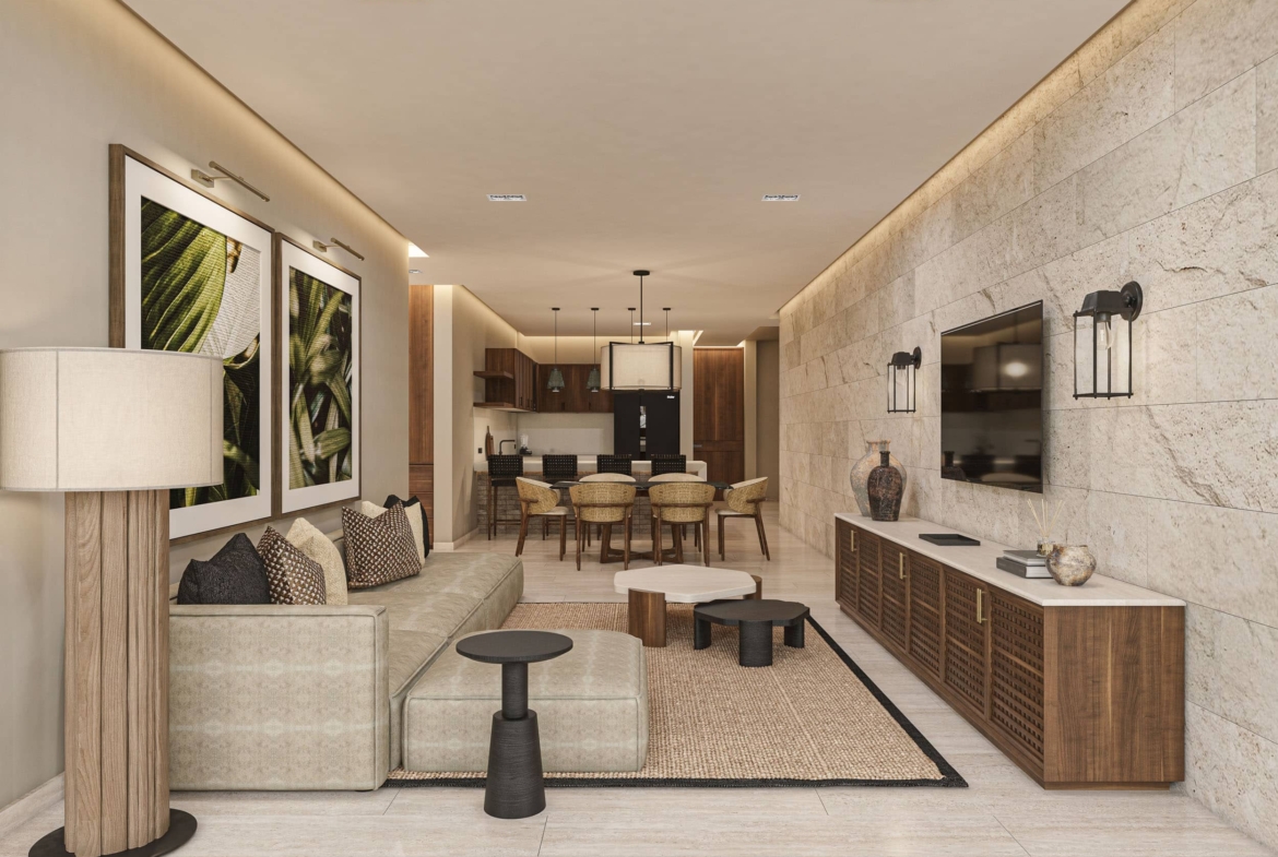 Spanning an impressive 3,749 square feet, this penthouse is designed for both comfort and sophistication. The interiors showcase a seamless blend of modern and traditional elements, featuring premium finishes such as stone-clad walls, exquisite woodwork, and natural materials that echo the charm of Yucatan. The master bedroom offers a tranquil retreat with a spacious walk-in closet, a spa-inspired ensuite bathroom, and a luxurious bathtub, while the secondary bedroom also includes an en-suite bath and ample storage. The open-concept living and dining areas are bathed in natural light, creating an inviting atmosphere that flows effortlessly into the state-of-the-art kitchen, complete with sleek granite countertops and high-end appliances.