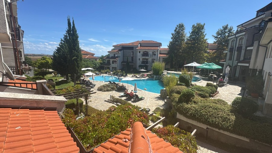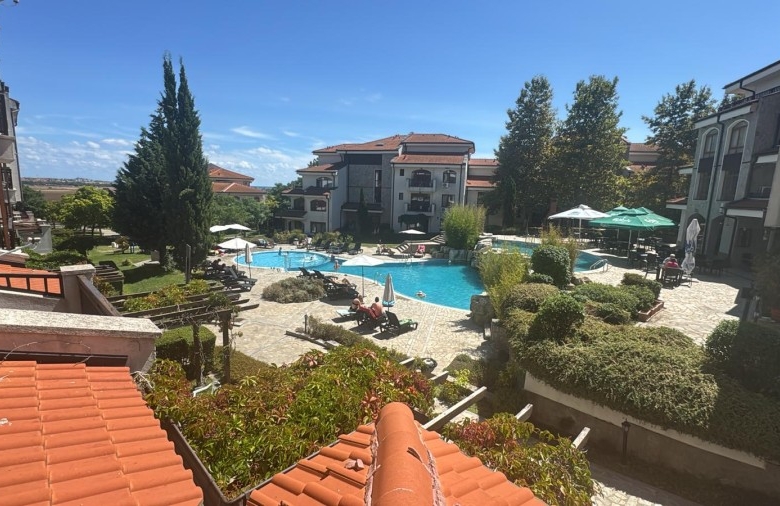 Bargain! 1 BED furnished apartment, 74 sq.m., in Vineyards SPA Resort ****, 2 km from the sea One bedroom apartment for sale in South-eastern Bulgaria nearby the village of Aheloy in short proximity to the most famous Black sea resort Sunny Beach. Vneyards SPA resort is nicely positioned on a hill with a beautiful sea panorama in the town of Kablesхkovo. The Black Sea is 2 km away and the Burgas Airport – 15 km / 15 min drive. The apartment has total living area of 73.7 sq.m. and it is situated on the second floor. It comprises: living-room with a kitchen area, 1 bedroom, bathroom with a WC and a balcony. The property is offered fully furnished and ready to use. Annual maintenance fee – 14 EUR/sq.m. The property is part of a holiday complex beautifully situated among the rich green pastures with beautiful panoramic views of the sea. All facilities are completed in a unique architectural style of the Bulgarian Revival architecture – red roof tiles, wood paneling, stone cladding. The complex has a good location, away from the noisy urban environment and at the same time just minutes away from the big cities. Closest destinations: Burgas airport – 14 km, Sunny beach resort- 10 km, Nessebar historical town – 10 km, Pomorie town (sea and spa resort)-10km, .Burgas city – 20 km. The nearest beach is just 2 km away. About Vineyards Spa Resort: It is nestled in a quiet, charming place, situated on the rolling hills in the valley of the river Aheloy, with incredible panoramic views of the sea. On its territory are perfectly combined 222 apartments, 34 villas, 4-star hotel with lush greenery. – 2 outdoor swimming-pool; – indoor heated pool; – SPA area; – restaurant; – pool-bar; – food shop; – beauty studio; – parking; – management office; – security