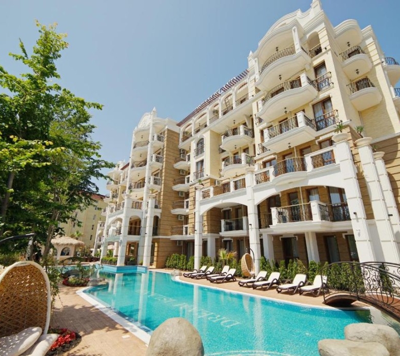 Bargain! 2 BED apartment in top class Harmony Suites 8-9 (Dream Island), Sunny beach We are glad to offer this luxury holiday complex “Harmony Suits 8 and 9 – Dream Island” in the biggest Bulgarian seaside resort – Sunny Beach. As all other predecessors, the modern apart hotel complex offers all-season pleasure in harmony with pure nature, comfort and warmth in the complexs original architecture. The complex offers high level of security, features an individual architectural style and comfortable living conditions. We offer unfurnished 2 BED apartment on the 3rd floor. Living area – 57 sq.m. The apartment is offered unfurnished and comprises of: – entrance hallway; – kitchen with living-room; – 2 bedrooms; – fully finished bathroom and toilet; – balcony with views to the surroundings. 800 m to the beach Maintenance fee – 20.4 EUR/sq.m. Dream Island is located near the Pine Grove Park and near the operating complexes Harmony Suites 1, 2, 3, and Harmony Suites 4, 5, 6 Monte Carlo. Proximity to the sea, parks and infrastructure makes this place attractive and comfortable for living and recreation. Harmony 8/9 offers many services to its owners and guests. One of the best advantages is the park near it. It provides quiet place for relaxing rest with children’s playground. Harmony Suites Spa & Wellness Club gives you a personal club card for using all the facilities in all complexes Harmony Suites and Harmony Palace. There are modern outdoor pools with hydrolysis and electrolysis system for water cleaning. Here is a full list of all other facilities: * Big green Pine park * 30 meter swimming pool for adults and children’s pool * Reception/Lobby * Chill out pool bar * Outdoor fitness center * Volleyball playground * Children’s playground * Outdoor Jacuzzi * Laundry * WI-FI * Satellite TV * Intercom * 24/7 Security and cameras The complex is beautifully designed. You can relax and unwind in the lobby bar, watching the flowing waterfall and a creatively designed pool resembling a river with islands.