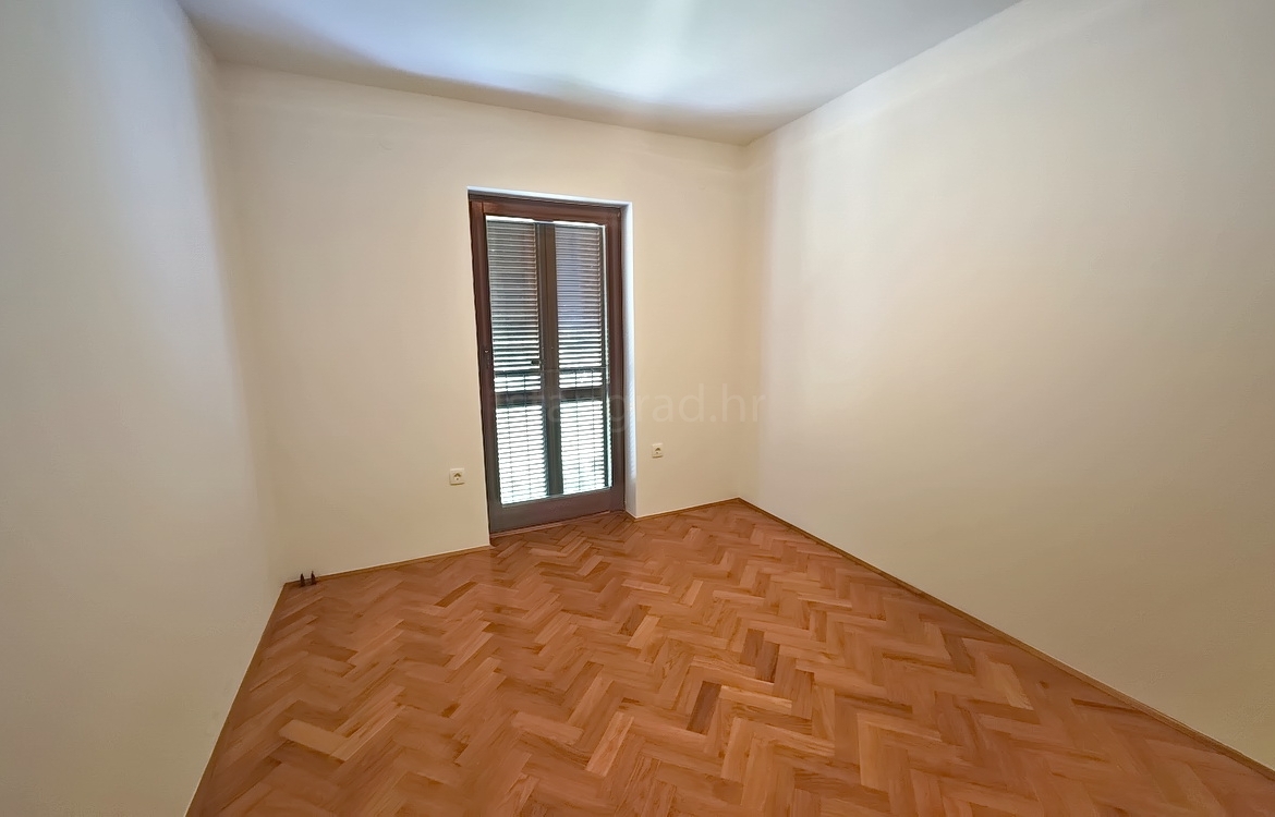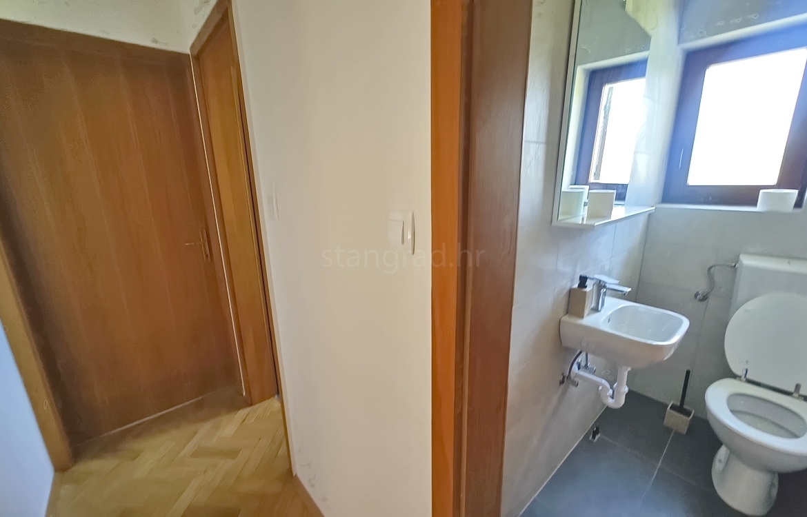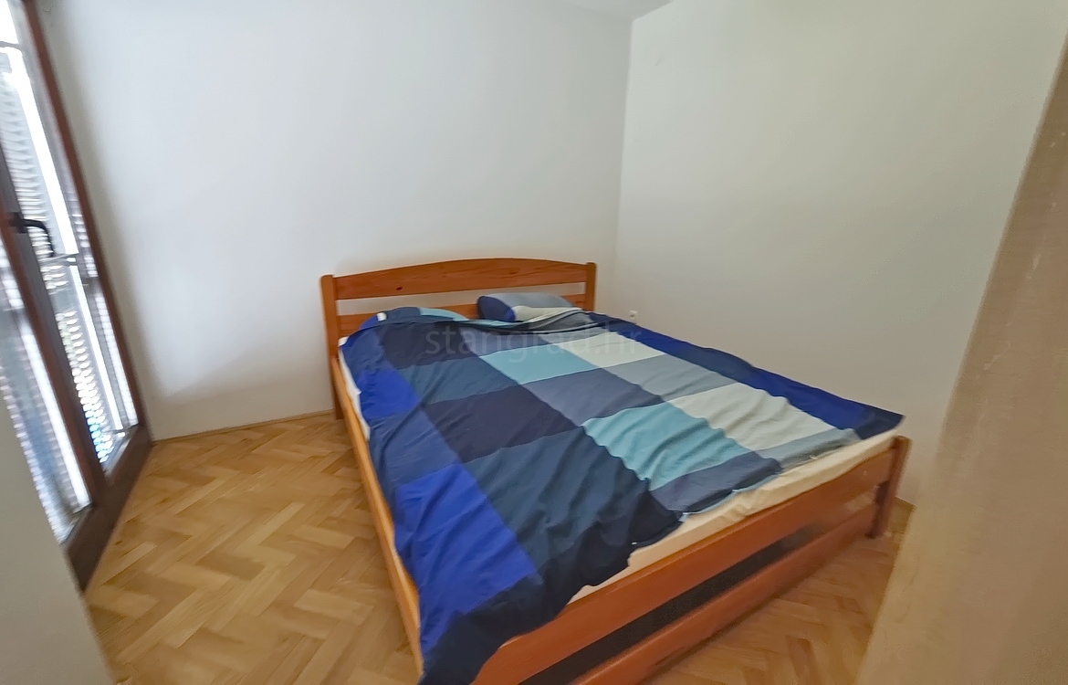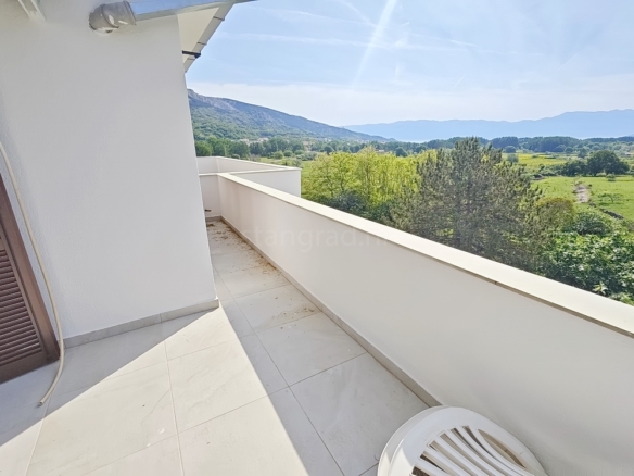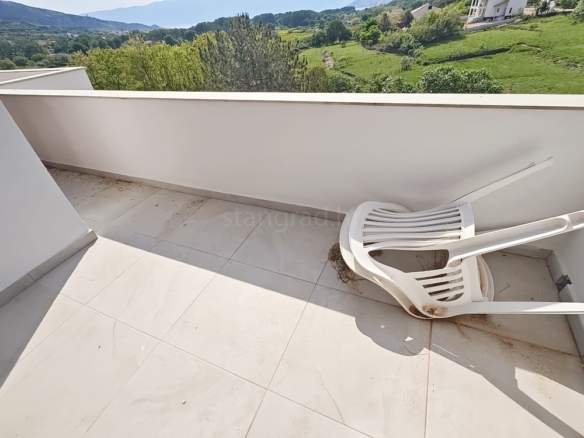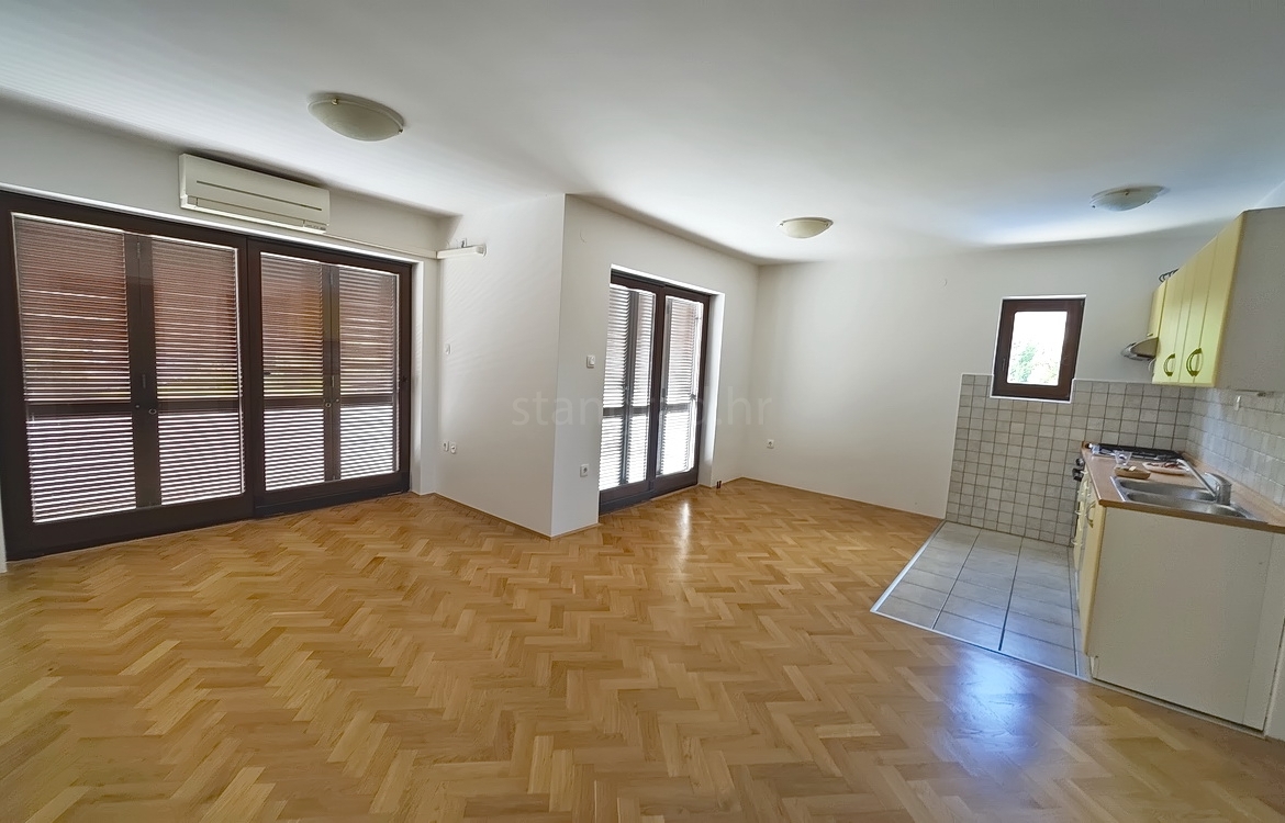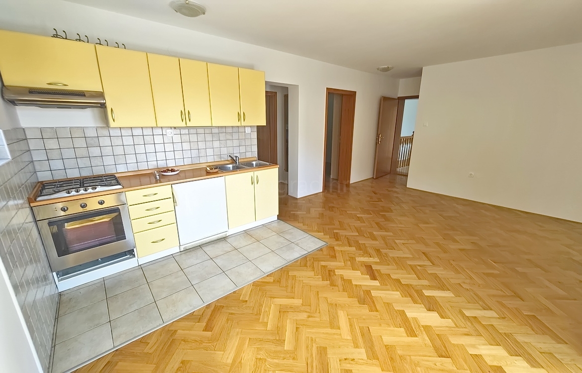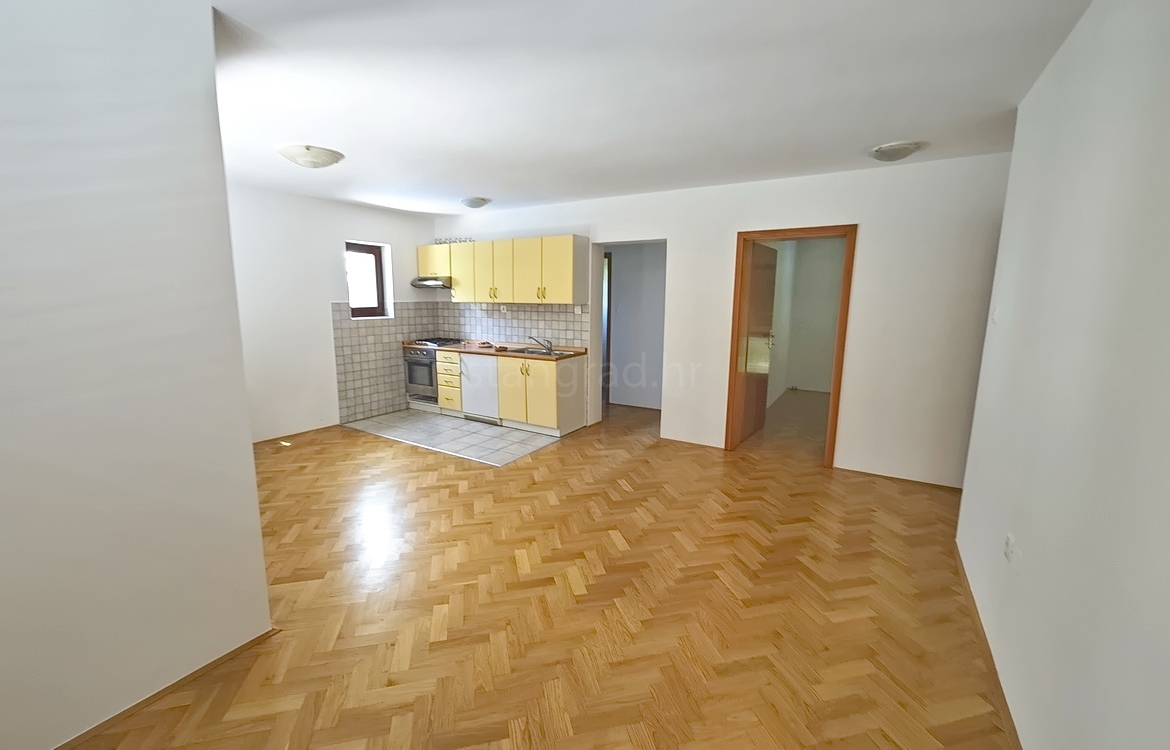 The apartment is located on the first floor of a well-constructed family house and spans a total of 55 m². The interior features an entrance hallway, a spacious living room with kitchen and dining area, two bedrooms, a bathroom, and a cozy terrace. The apartment is partially cleared of older furniture, giving the future owner the opportunity to furnish it to their own taste.