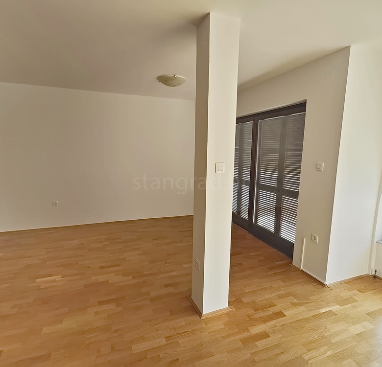 The apartment is situated on the ground floor of a high-quality residential building and spans a total of 69 m². The interior includes an entrance hallway, a spacious living room with a kitchen and dining area, two bedrooms, a bathroom, a loggia, and a terrace. The interior space of the property is partially cleared of previously used furniture.