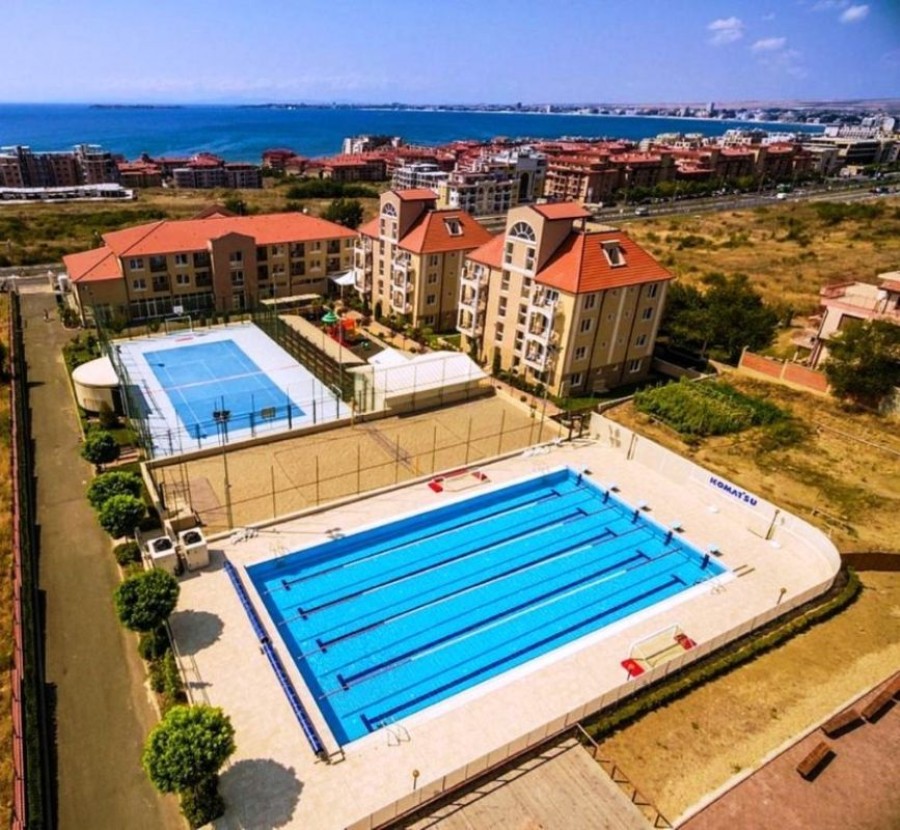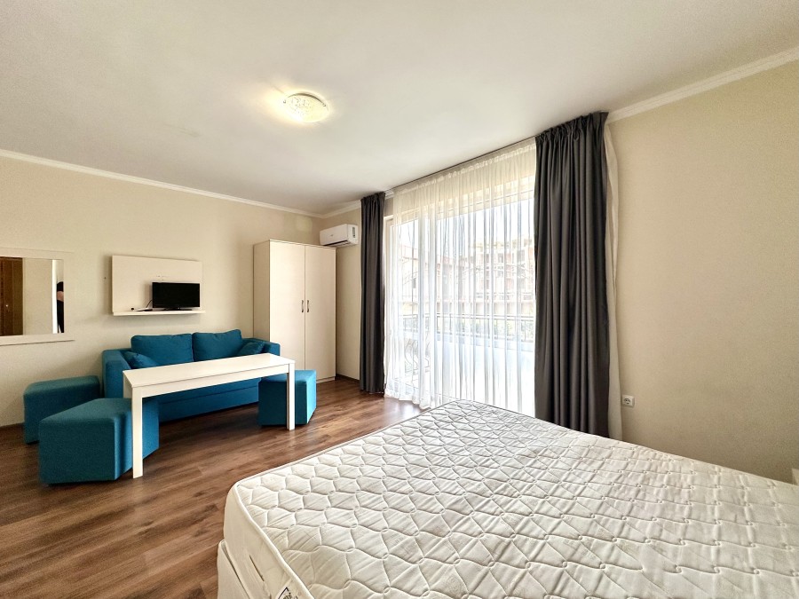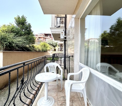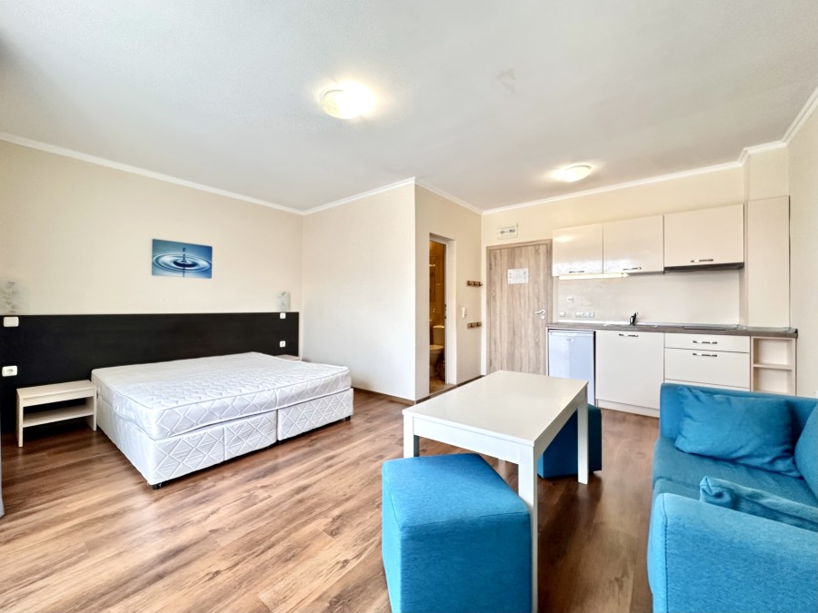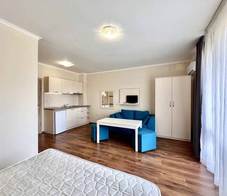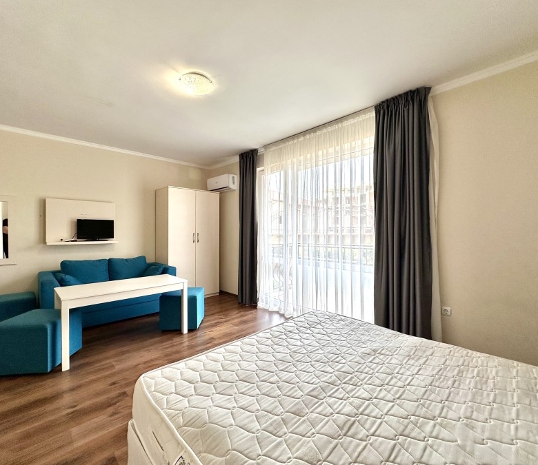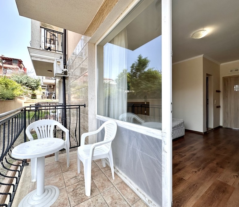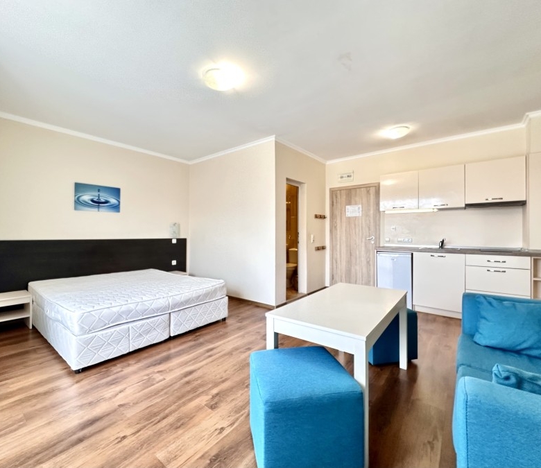 Beautiful ground floor studio, 42 sq.m., in Macon Residence, Sveti Vlas We offer a studio in the city of St. Vlas in the Apart Hotel Macon Residence Wellness and Spa. The property boasts of its excellent location, 5 minutes from the center of St. Vlas, 5 minutes to the Mercury supermarket, 7 minutes to the sea. Living area – 42 sq.m., located on the ground floor and comprising of: – hallway; – bedroom area; – bathroom and WC; – balcony The studio is offered with all the furniture and electric appliances. Excellent location for holiday rentals. Maintenance fee 504 euros per year. For your active relaxation the complex offers 4 swimming pools, sauna, Turkish bath, massage parlors, sports hall, fitness hall, sports grounds, and children playgrounds and slides. There is also a lobby bar, a restaurant, children’s pastry shop, and shopping area Excellent investment for living and renting out.