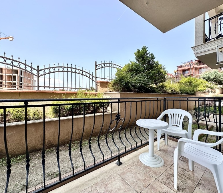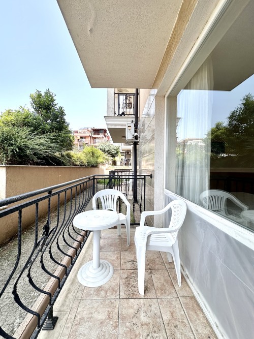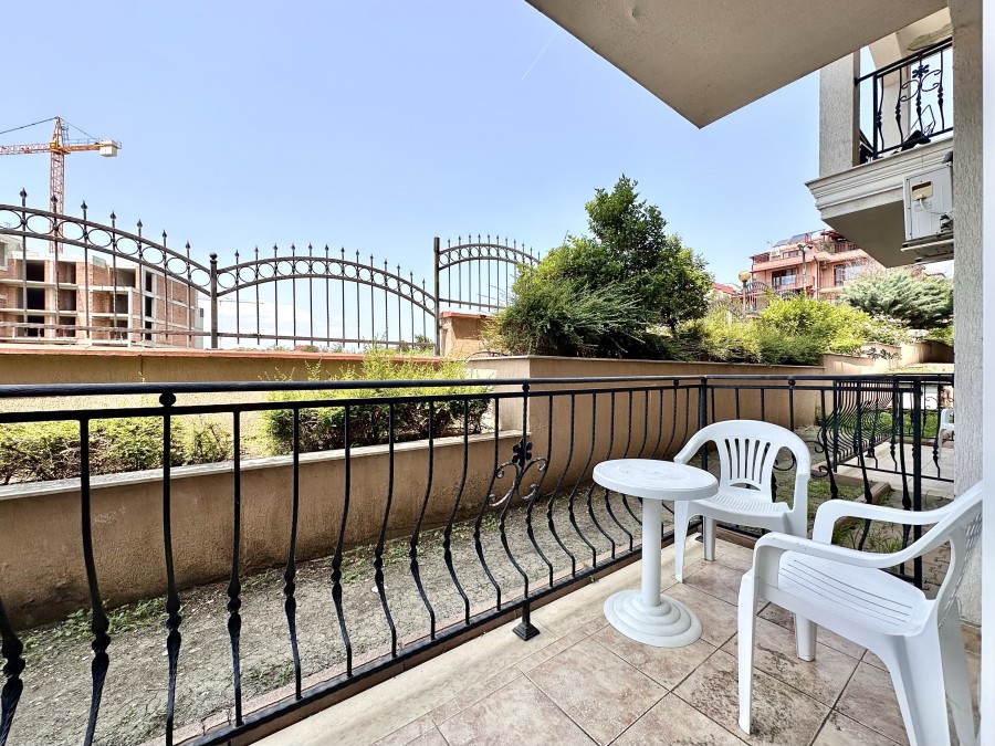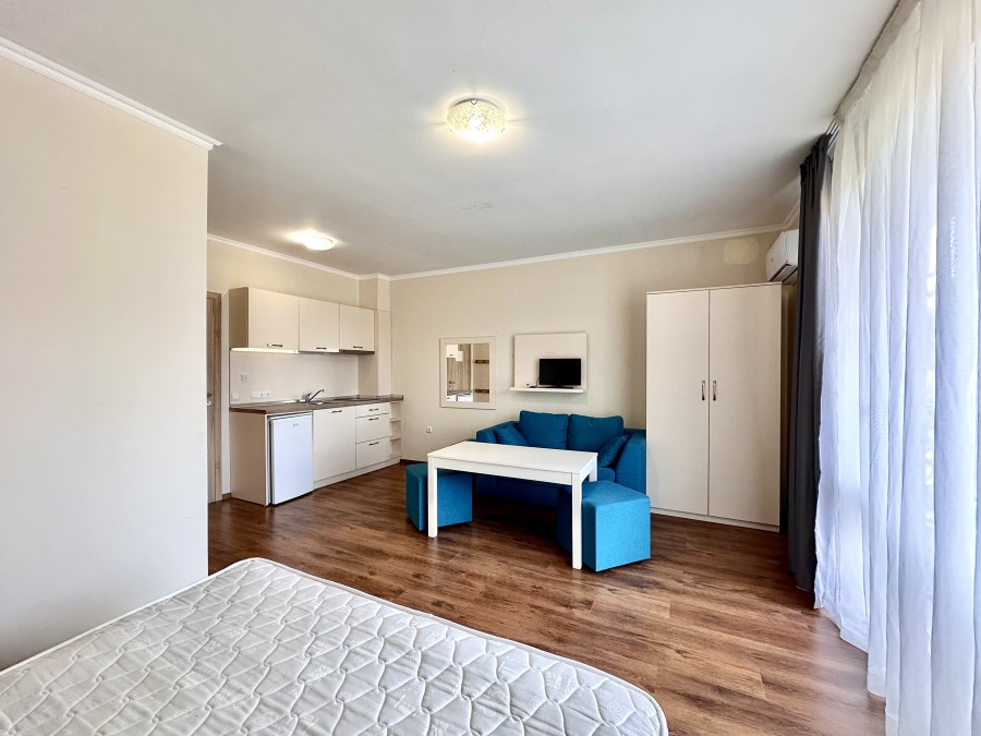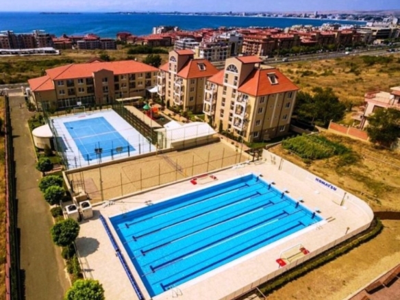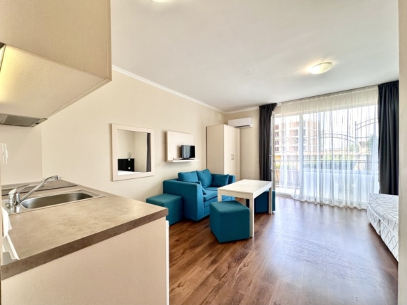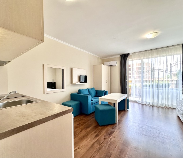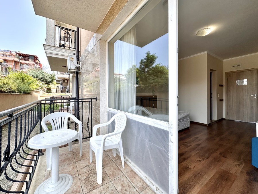 Beautiful ground floor studio, 42 sq.m., in Macon Residence, Sveti Vlas We offer a studio in the city of St. Vlas in the Apart Hotel Macon Residence Wellness and Spa. The property boasts of its excellent location, 5 minutes from the center of St. Vlas, 5 minutes to the Mercury supermarket, 7 minutes to the sea. Living area – 42 sq.m., located on the ground floor and comprising of: – hallway; – bedroom area; – bathroom and WC; – balcony The studio is offered with all the furniture and electric appliances. Excellent location for holiday rentals. Maintenance fee 504 euros per year. For your active relaxation the complex offers 4 swimming pools, sauna, Turkish bath, massage parlors, sports hall, fitness hall, sports grounds, and children playgrounds and slides. There is also a lobby bar, a restaurant, children’s pastry shop, and shopping area Excellent investment for living and renting out.