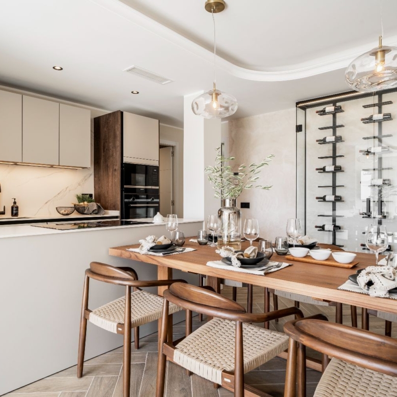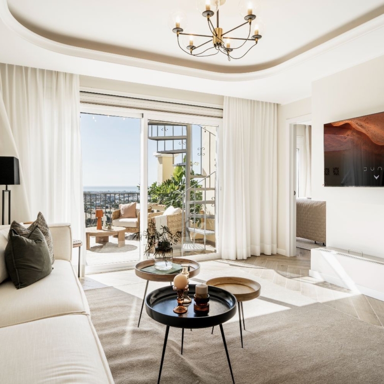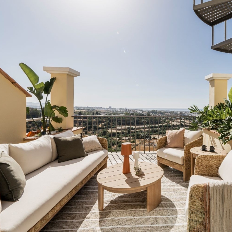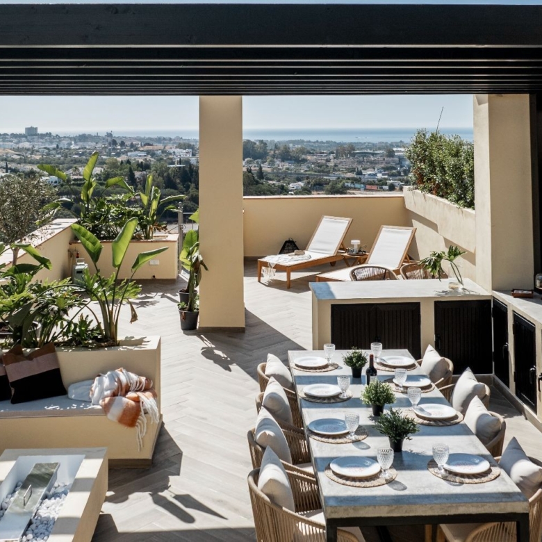 An immense terrace with a sea view. A solarium to soak up the Marbella sun. A balcony for enjoying coffee al fresco. The spaces in this penthouse in Benahavis are designed to maximise outdoor enjoyment on this coast that rarely sees clouds. It has been completely remodelled to ensure high-quality moments indoors, with a careful selection of materials and obsessive attention to detail. It features a spacious living-dining room with an open-plan kitchen and a dedicated space for storing fine wines. A large window leads to a balcony, and from there, a spiral staircase ascends to the upper floor, where a rooftop terrace unfolds with a solarium area and a pergola sheltering the barbecue area and living space around a gas stove for warming up cool nights. Back downstairs, the master suite is well separated from the other two bedrooms. Decorated in a contemporary style, it has a comfortable open wardrobe and an en-suite bathroom with exquisite materials. The second bedroom is also en-suite, with the unique feature of a glass ceiling in the bathroom, creating the effect of showering under the sky without feeling cold. The third bedroom is next to a well-appointed third bathroom, which also serves guests. The entire apartment is equipped with central air conditioning for both heating and cooling, and the bathrooms have the added luxury of underfloor heating. Additionally, it includes an elevator, a garage space, 2 storage rooms, and a small communal pool. Almost 7 minutes from the centre of San Pedro de Alcántara and 12 minutes from Benahavis, it’s perfect for being close to everything yet away from the hustle and bustle.