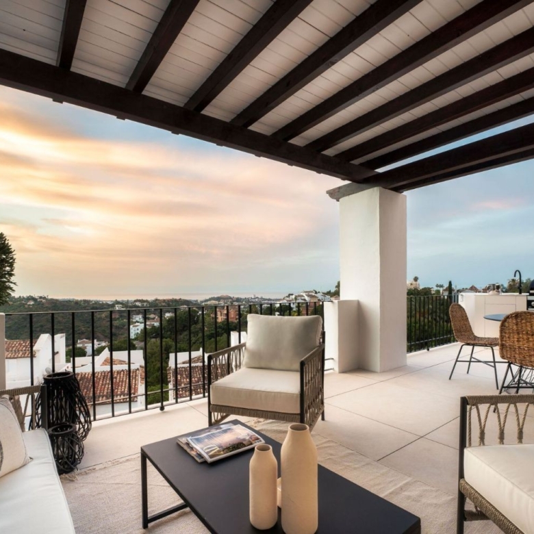 Welcome to Maison Blanc, a refined penthouse offering a harmonious balance of comfort and elegance. In essence, the name Maison Blanc embodies the elegance, harmony, and intriguing design elements that define the penthouse, inviting residents to experience a lifestyle of refined living and timeless beauty. This interplay of light and dark elements adds depth and visual interest, conceptualising harmony where opposites come together to create a cohesive and balanced whole. The floor plan is thoughtfully designed to optimise space and functionality, ensuring a comfortable living experience. Upon entering, you’ll find a spacious lounge area seamlessly connected to the well-appointed kitchen, perfect for both casual gatherings and quiet relaxation. The kitchen is equipped with high-quality appliances and stylish finishes, catering to your culinary needs. Maison Blanc features two ensuite bedrooms, each providing a private retreat for guests. Additionally, there is a convenient guest bathroom for added comfort. The highlight of the penthouse is the serene master bedroom, accompanied by a luxurious ensuite bathroom. Crafted with bespoke finishes and innovative storage solutions, the master closet provides a stylish yet practical space to organise and showcase your wardrobe. Step outside to the expansive terrace and enjoy the amazing views of the La Concha mountain and the Mediterranean Sea. This outdoor space is ideal for unwinding and soaking in the beauty of the surroundings.