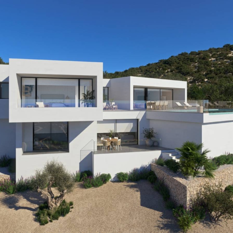 Luxury villa in Cumbres del Sol, Benitachell, Alicante The villa is distributed over three floors. Access to it is through the upper floor, with covered parking for two vehicles. The day area is located on this same floor. A large kitchen with a central island and equipped with top brand appliances, a spacious living room and a terrace with an impressive view of the Mediterranean Sea. The living room has a very warm and cozy design. It is a large room which can be divided into two areas for more privacy. On this same floor, there is the master suite with its own bathroom and private terrace to enjoy the good weather and the sea views from the privacy of being in your own room. On the ground floor there are two large bedrooms, each with its own bathroom and terrace where you can enjoy the outdoors. There is also a small lounge on this same floor where you can read, relax or meditate. The terrace area crowned by an infinity pool will allow you to enjoy the sun and spectacular views. An ideal place to have an aperitif, enjoy a barbecue with family and friends or simply take a nap in the sun. The design of this house combines a genuinely modern architecture in a stylish and functional way. In its facade, characterized by large geometric figures created based on straight lines and in the shape of cubes, the color white predominates, giving the villa a very elegant and minimalist design. Its garden, 100% Mediterranean in style, has stone walls that help to integrate the complex into the environment. Property ID: VA-78931 Price: €2,221,850 Property Size: 569 m2 Land Area: 1000 m2 Bedrooms: 3 Bathrooms: 4 Property Type: Villa Property Status: For Sale
