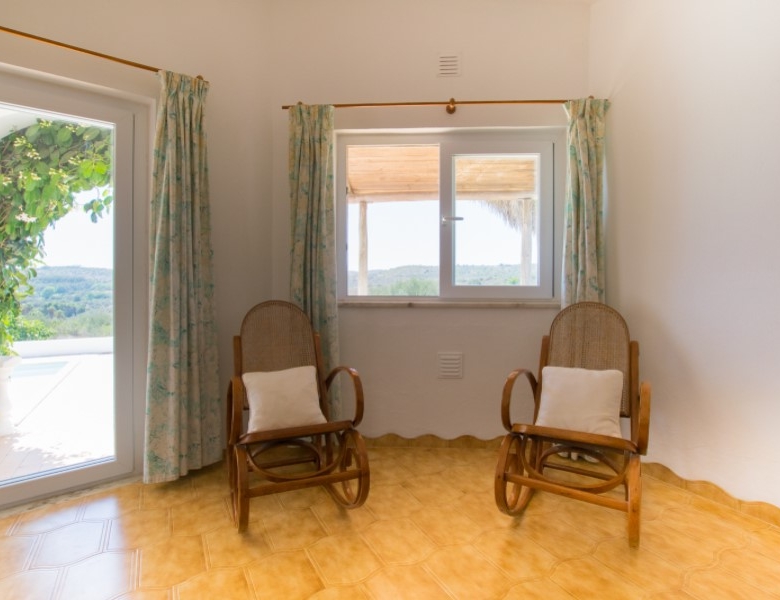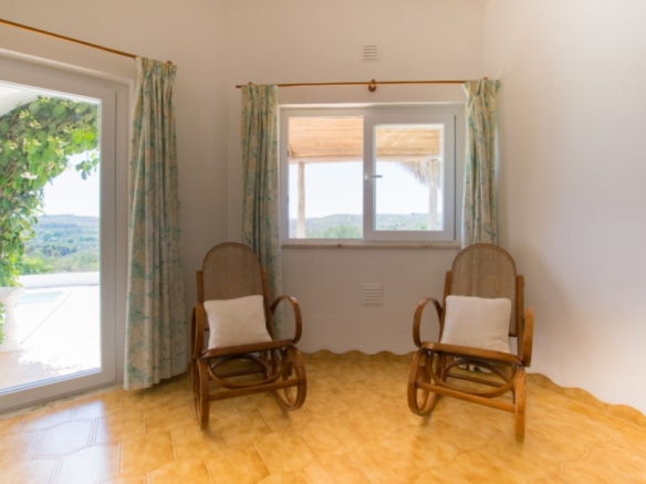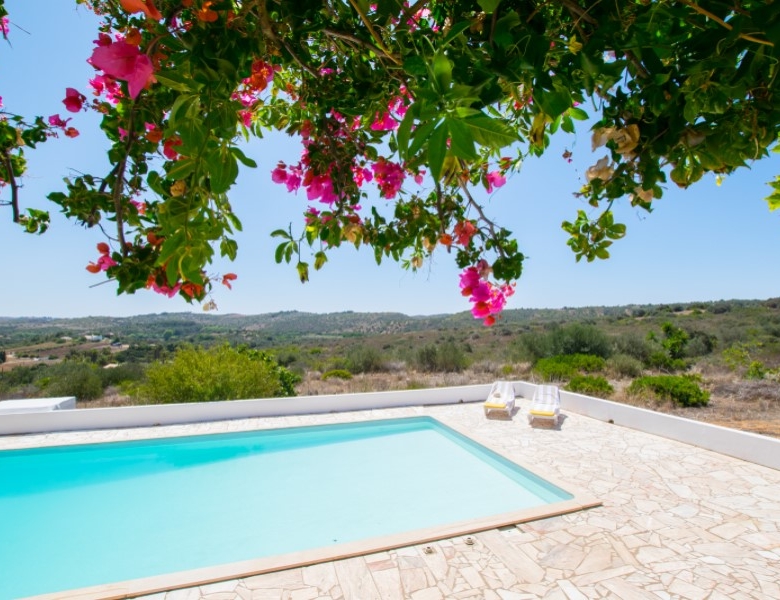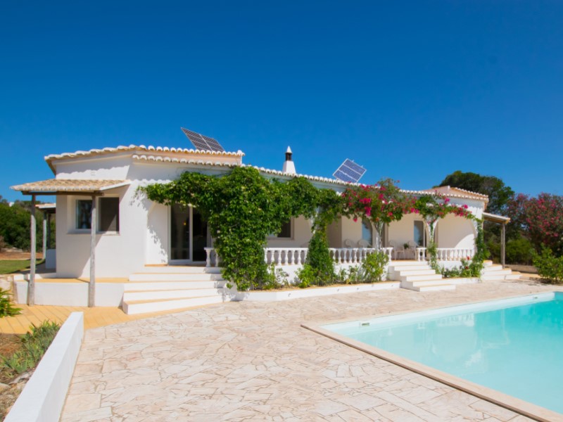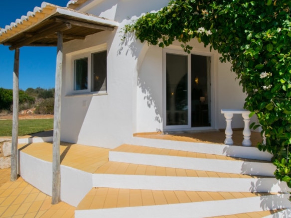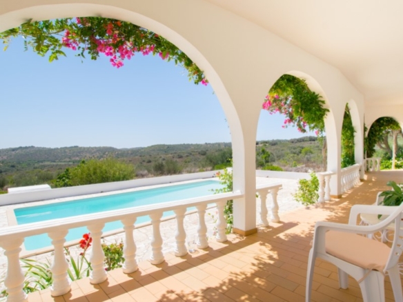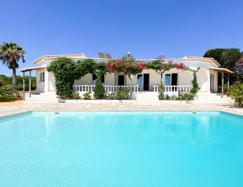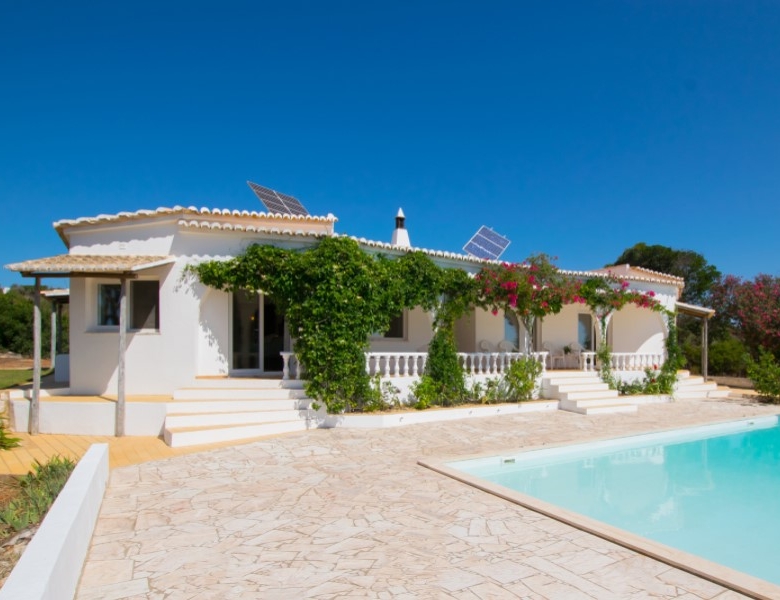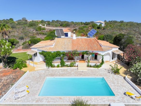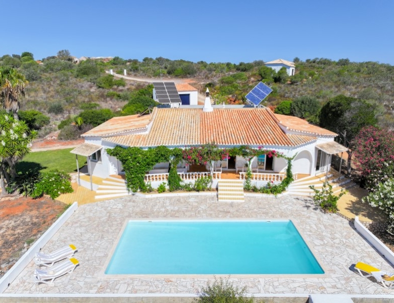 Experience the beauty of the Western Algarve with this stunning 5-bedroom villa with a pool nestled in 42,000 sqm of private land offering panoramic views and proximity to white sandy beaches. Upon entering the villa we are welcomed by a bright rustic kitchen with locally sourced peach marble worktops. The kitchen flows beautifully into a large open lounge area, where you are met with the most breathtaking countryside views out onto a curved balcony, spanning the length of the property and perfect for alfresco dining. The light and spacious lounge area embraces a central wood-burning fire, highlighting the magnificent high ceilings adorned with decorative chestnut wood beams. The south wing is accessed via two hallways leading off the lounge and kitchen and offers 3 large bedrooms; the first is a good-sized room with beautiful views over-looking the pool and beyond, the second offers a lawn and countryside view through French windows leading to the outdoors and the third, ‘the master bedroom’ a bright and sunny room with direct access to the balcony and a stunning vista across the valleys. A large shared bathroom caters to the south wing, also finished with locally sourced peach marble. Adjacent to this, there is a convenient separate guest WC. The North wing is accessed via a short hall leading off the lounge area providing two further bedrooms, also spacious with high ceilings and both with access to the outdoors. A shared bathroom is located between the two bedrooms. Outdoor steps lead to the property rooftop, where the most amazing 360-degree star gazing can be enjoyed, as well as spectacular views towards to Praia da Luz, reaching as far as the Monchique mountains. From the swimming pool, one is captivated by the magnificent far-reaching views and at the same time enjoys absolute privacy. With plenty of space to relax, exercise, or remote work whilst being surrounded by nature in a tranquil setting, this location sums up idyllic outdoor living. The villa features sustainable amenities like a private water supply and solar/wind energy. Features Outside Garden Interior features Other: Fitted wardrobes Energy & utilities Energy consumption rating: D Emissions rating: D Property ID: golden2201 Price: €1,950,000 Property Size: 250 m2 Bedrooms: 5 Bathrooms: 3 Property Type: Villa Property Status: For Sale