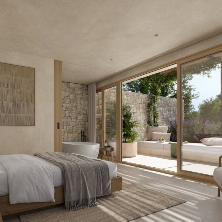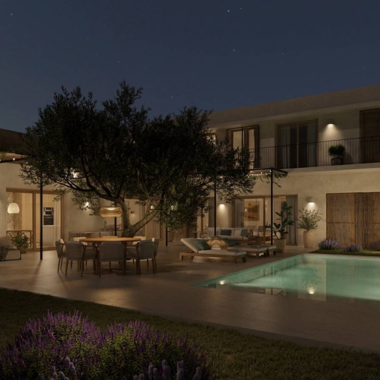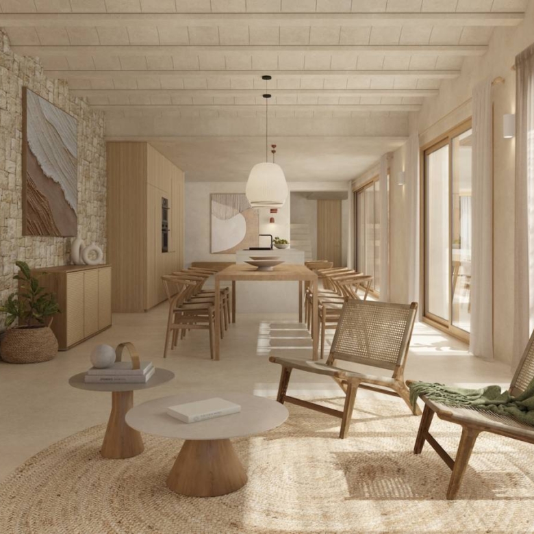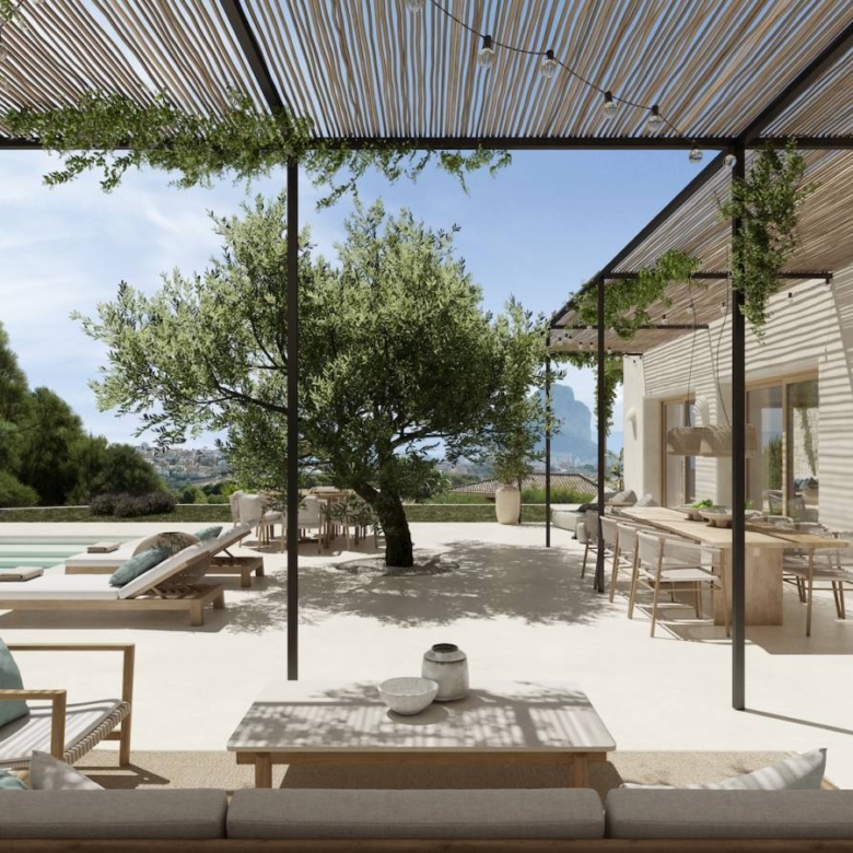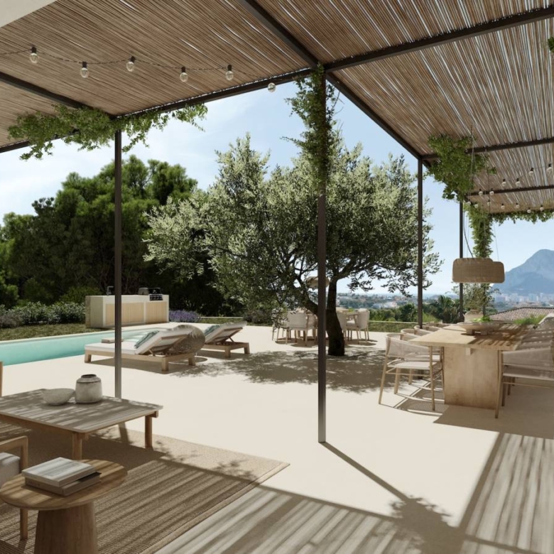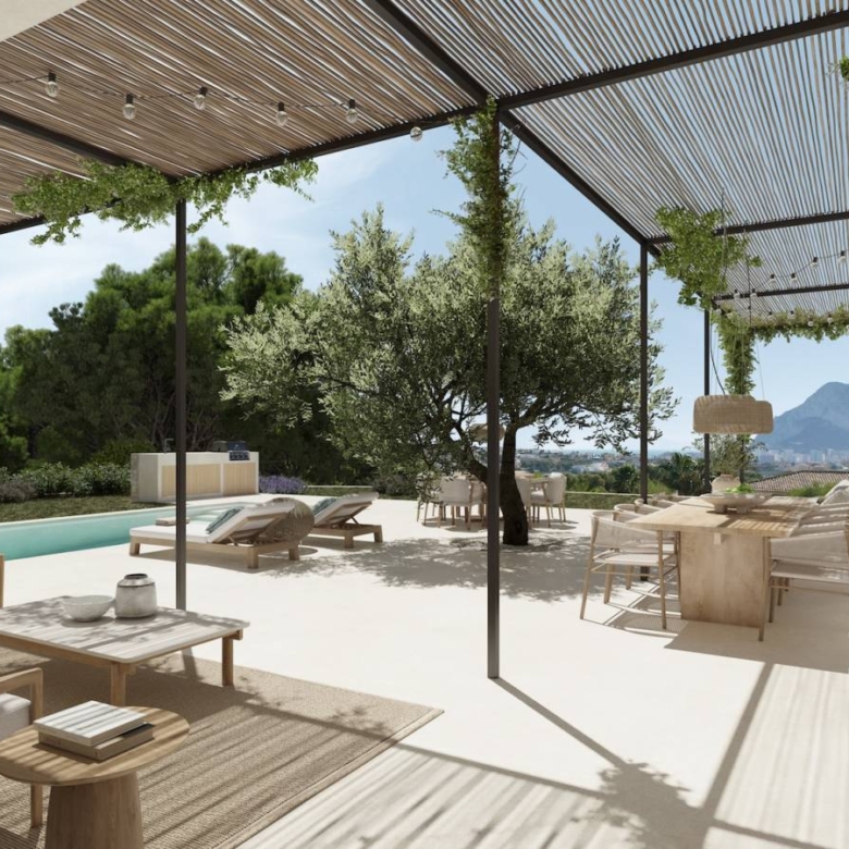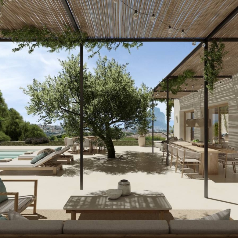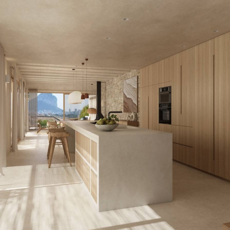 Luxury villa for sale in Calpe, Costa Blanca Contemporary home located on a sloped plot of 1,079 m2 facing southeast. The location and design harmonize with the topography, minimizing earth movement and respecting the natural landscape. Ground Floor: The east wing houses the kitchen, dining area, and living room, all with access to Mediterranean porches. The south wing features a spacious living room and an English courtyard enhancing cross ventilation and light. The master suite is located on this floor, with access to a private terrace overlooking the sea and forest. Upper Floor: It accommodates two bedrooms, three bathrooms, and a living area convertible into a third bedroom. This area has a continuous balcony with views of the sea and Penon de Ifach, and access to two terraces facilitating cross ventilation. The L-shaped design maximizes interior space and capitalizes on views of the sea and Mediterranean forest. The structure integrates with the slope, appearing as a single-story from the adjacent upper level. This design creates an open central space that blends with the rustic landscape, providing a sensation of living in a Mediterranean forest despite the urban setting. The architecture combines advanced technology with a style resonating with Mediterranean culture, promoting a strong connection between indoor and outdoor spaces. Light and shadows play a crucial role, allowing nature to feel part of the home. Features: * Status: Project with license* Plot: 1,079 m2* Built area: 349 m2* Auxiliary area: 326 m2* Total area: 675 m2* Bedrooms: 3 + 1* Bathrooms: 5* Large windows with wooden frames and bamboo blinds.* Mediterranean porches providing shade.* Interior cladding of natural clay and exterior mortar.* Continuous microcement floors and vaulted ceilings in some areas.* Landscaping with endemic plants and pots of culinary and medicinal herbs. Property ID: GH-307794 Price: €2,450,000 Property Size: 349 m2 Land Area: 1079 m2 Bedrooms: 4 Bathrooms: 5 Property Type: Villa Property Status: For Sale