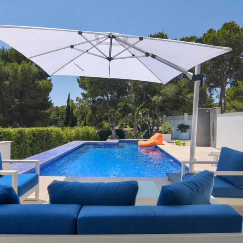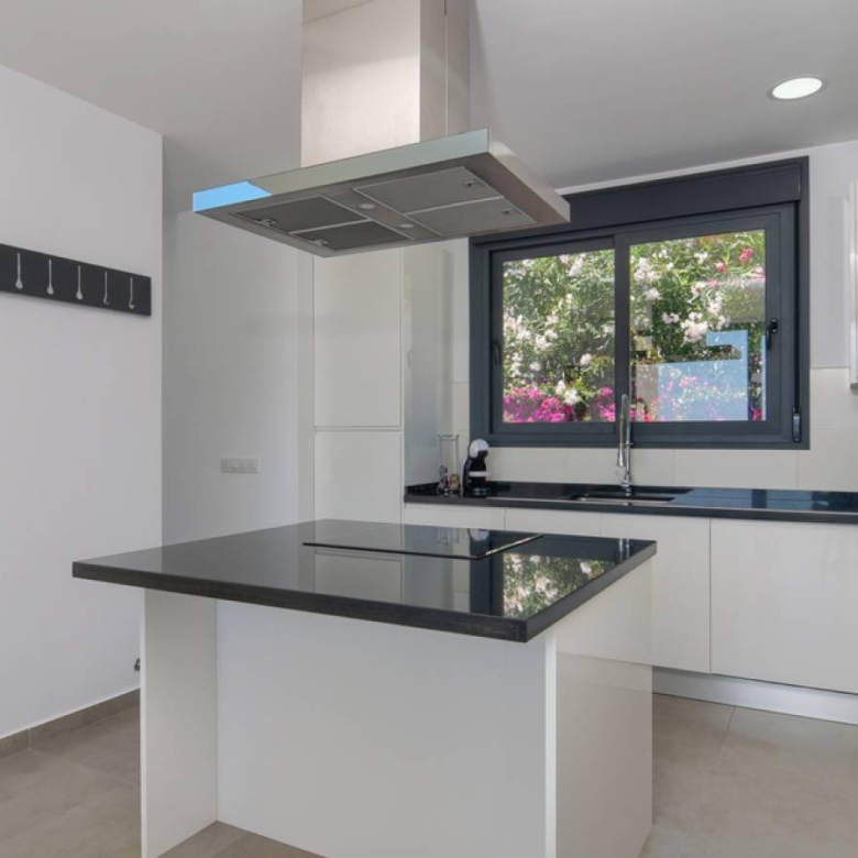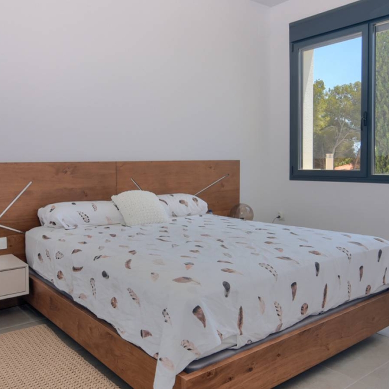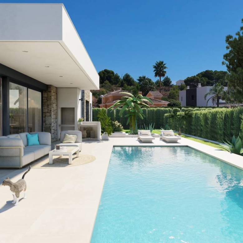 New build villa in Calpe, Costa Blanca The house has been planned on one floor, which makes this project practical and comfortable. The entire plot is fenced and has a hedge of cypresses inside, which provides privacy and a pleasant environment. From the main entrance of the house we access a hall, from which on the left we access the day area, consisting of a living room with a dining room and an open kitchen with an island. From the living room we can access the outside, where we have a covered porch area with a barbecue and a large terrace with a 40m2 pool. On the right side of the house is the sleeping area, with 4 bedrooms: the master bedroom with en-suite bathroom and dressing room, another bedroom with en-suite bathroom and two other bedrooms that share a bathroom. There is also a laundry area. Outside there is a parking area with a sail-shaped pergola for two cars. This project is located in one of the residential areas preferred by all the residents of Calpe, due to its proximity to the town center, the beaches and at the same time for being a quiet but safe area, since it is located on the outskirts. From the center of the city. Property ID: GH-307406 Price: €990,000 Property Size: 453 m2 Land Area: 800 m2 Bedrooms: 4 Bathrooms: 3 Property Type: Villa Property Status: For Sale