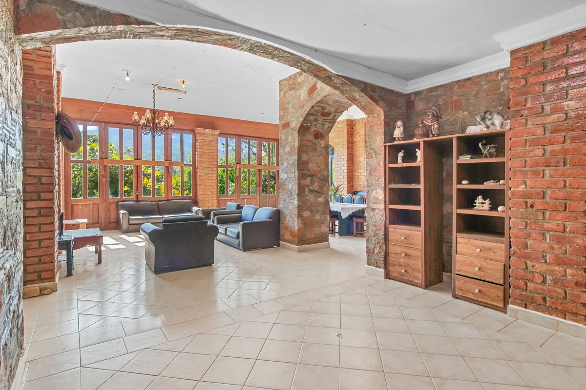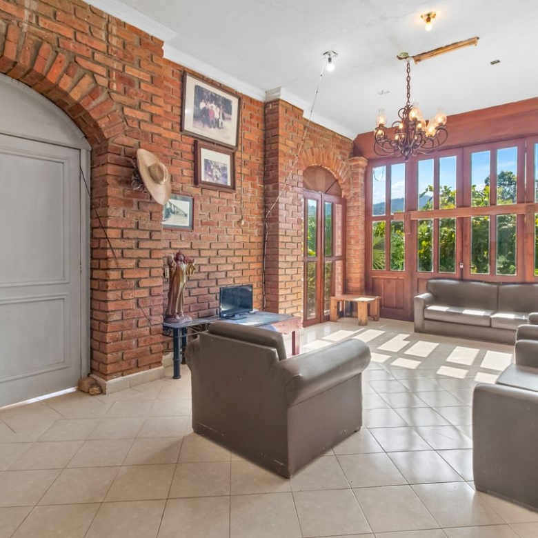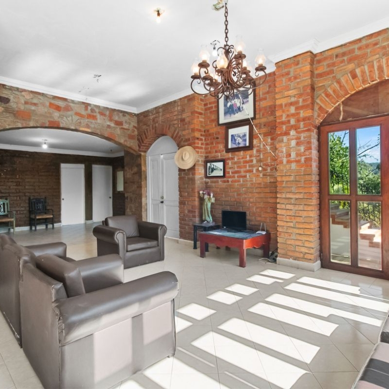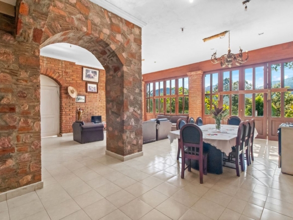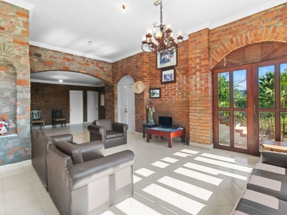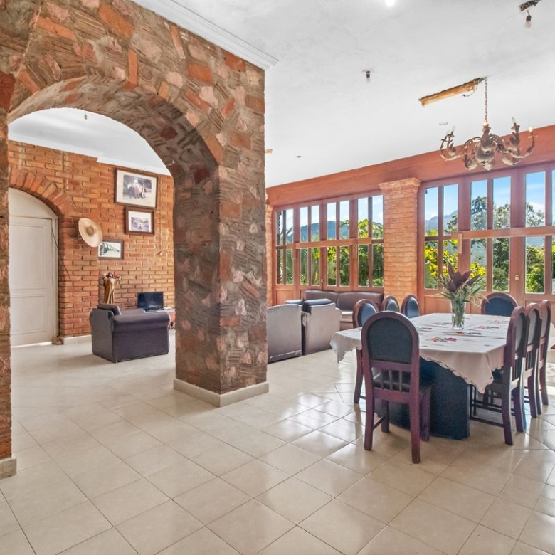 Casa de Campo with solid construction with finishes in “ old wall ” of stone and brick, surrounded by vegetation and fruit trees, a few steps from the river. Solidly built country house with mixed stone and brick rustic wall finishes, surrounded by vegetation and fruit trees, just a few steps from the river. Possibility to build up another level or two. The main house has 3 bedrooms and 2 full bathrooms, plus an adjacent building ideal for workers with 2 bedrooms and 1 full bathroom. Enjoy the tranquility and mountain views. Constant water supply from a common well. Two kitchens: one inside and one outside with a griddle for freshly made tortillas.