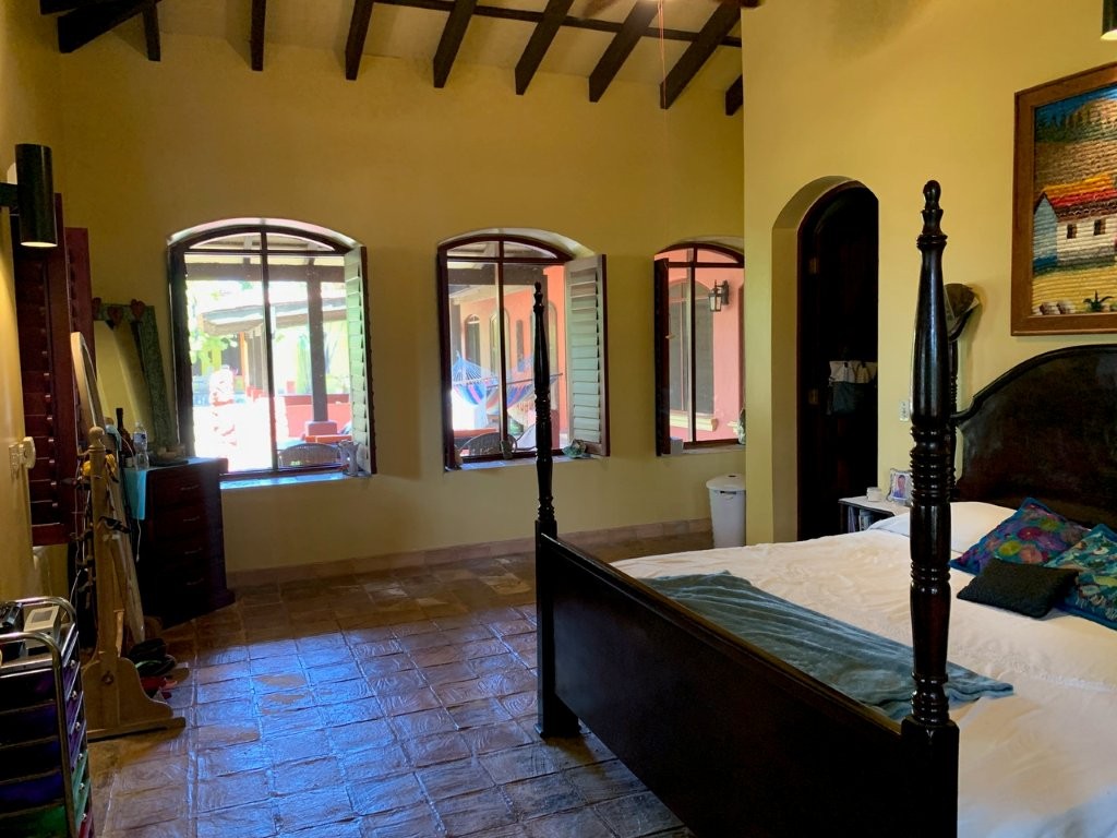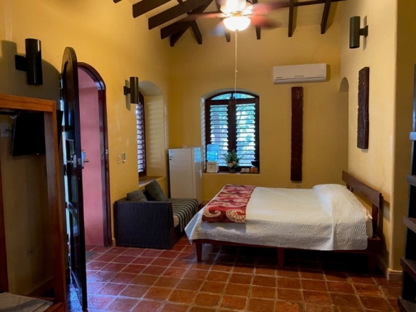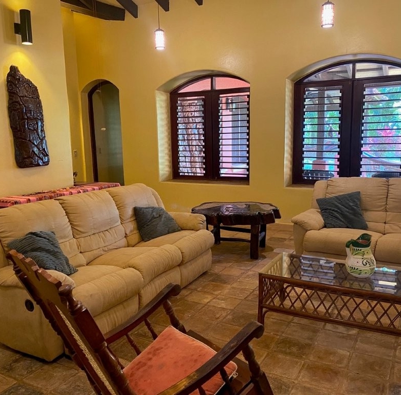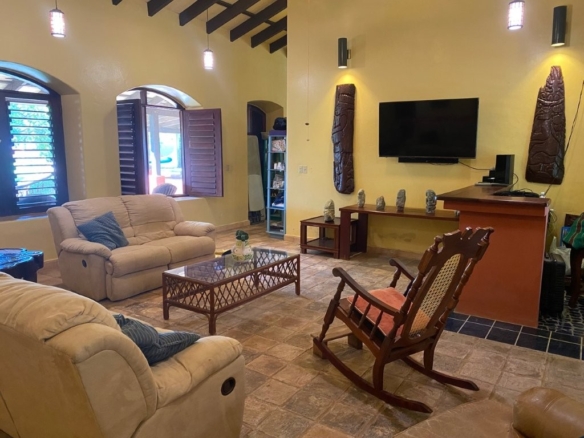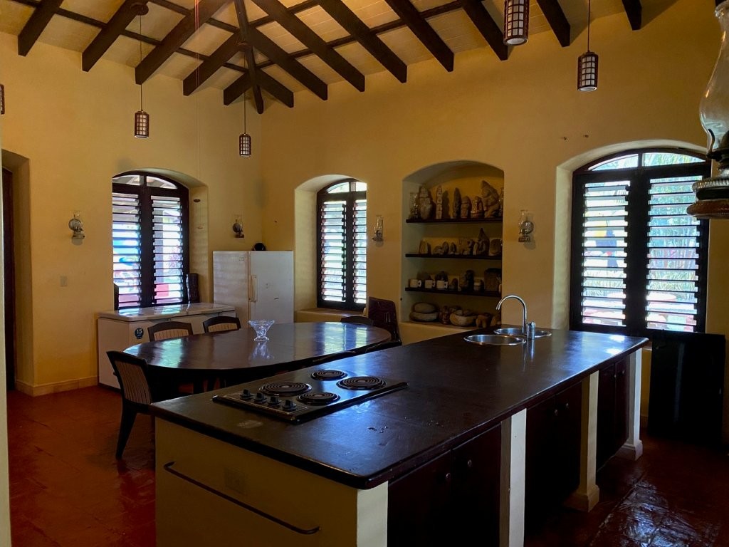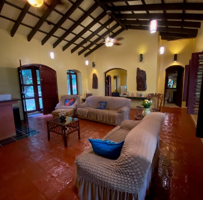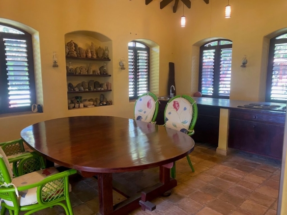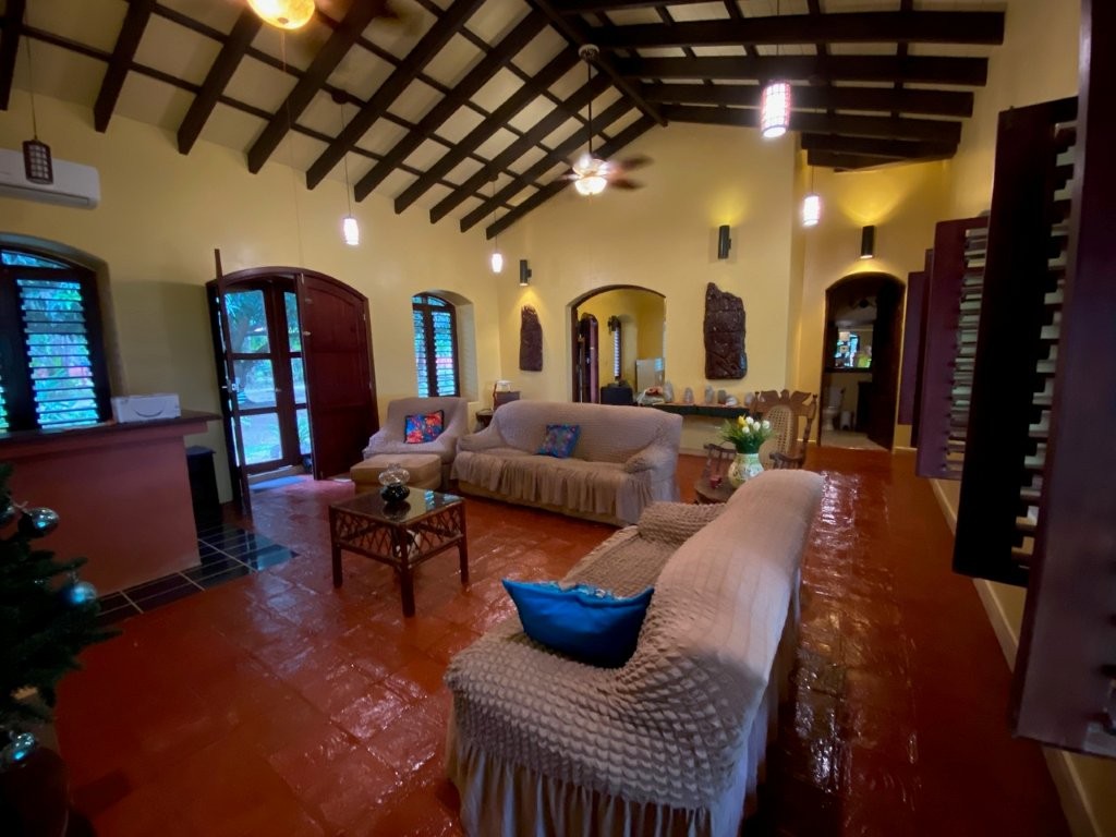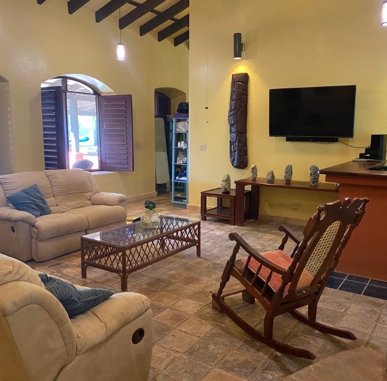 * Large Adobe Personal Home: A stunning main residence featuring impressive 20-foot high ceilings with open mahogany beams, two spacious bedrooms, three bathrooms, and two expansive patios, all overlooking the beautiful Caribbean Sea. Its Spanish Adobe construction and 9-foot mahogany doors exude authentic charm and durability.
