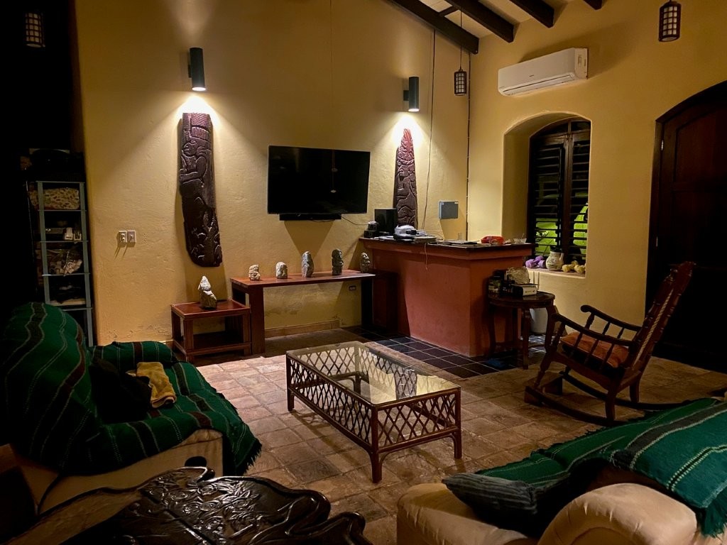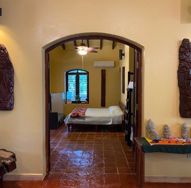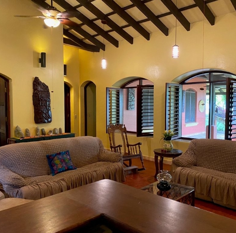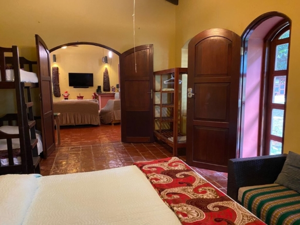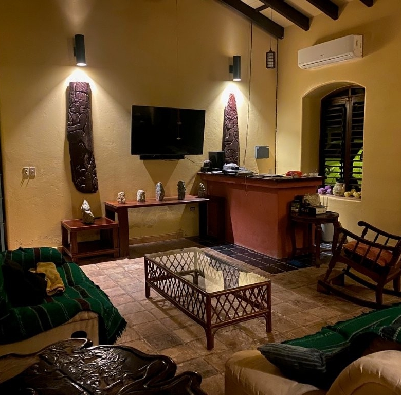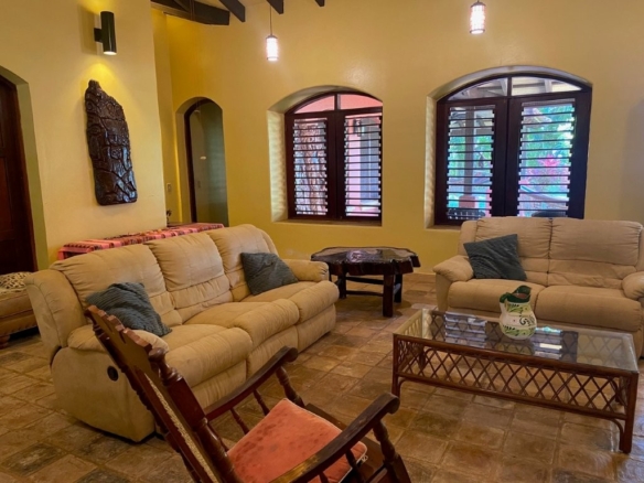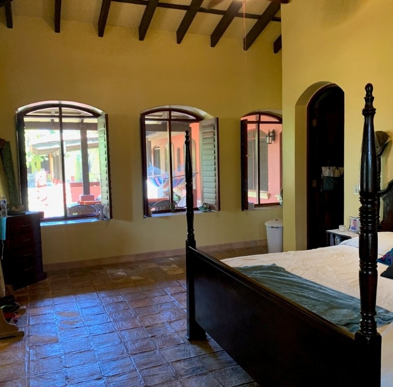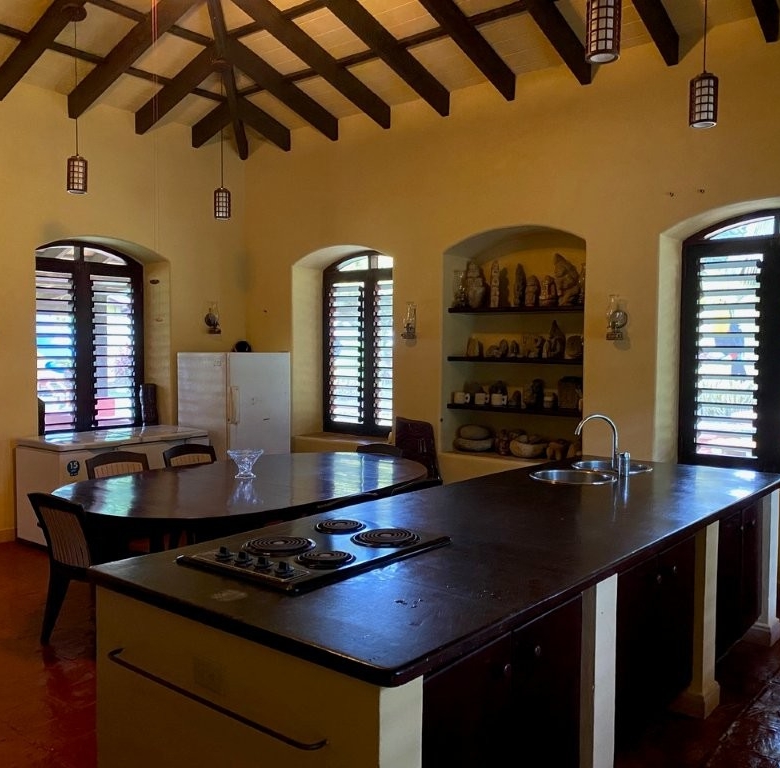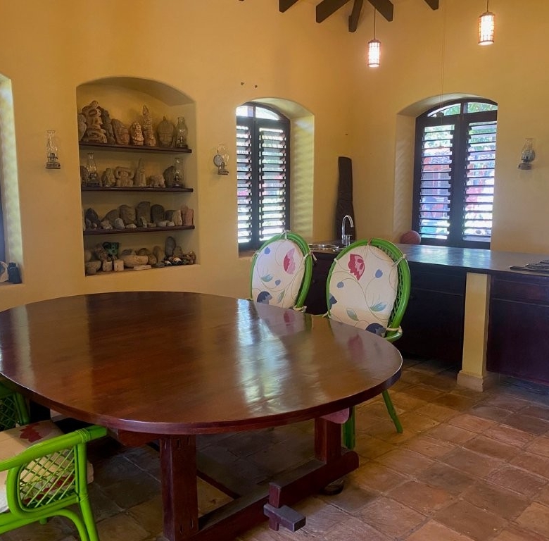 * Large Adobe Personal Home: A stunning main residence featuring impressive 20-foot high ceilings with open mahogany beams, two spacious bedrooms, three bathrooms, and two expansive patios, all overlooking the beautiful Caribbean Sea. Its Spanish Adobe construction and 9-foot mahogany doors exude authentic charm and durability.
