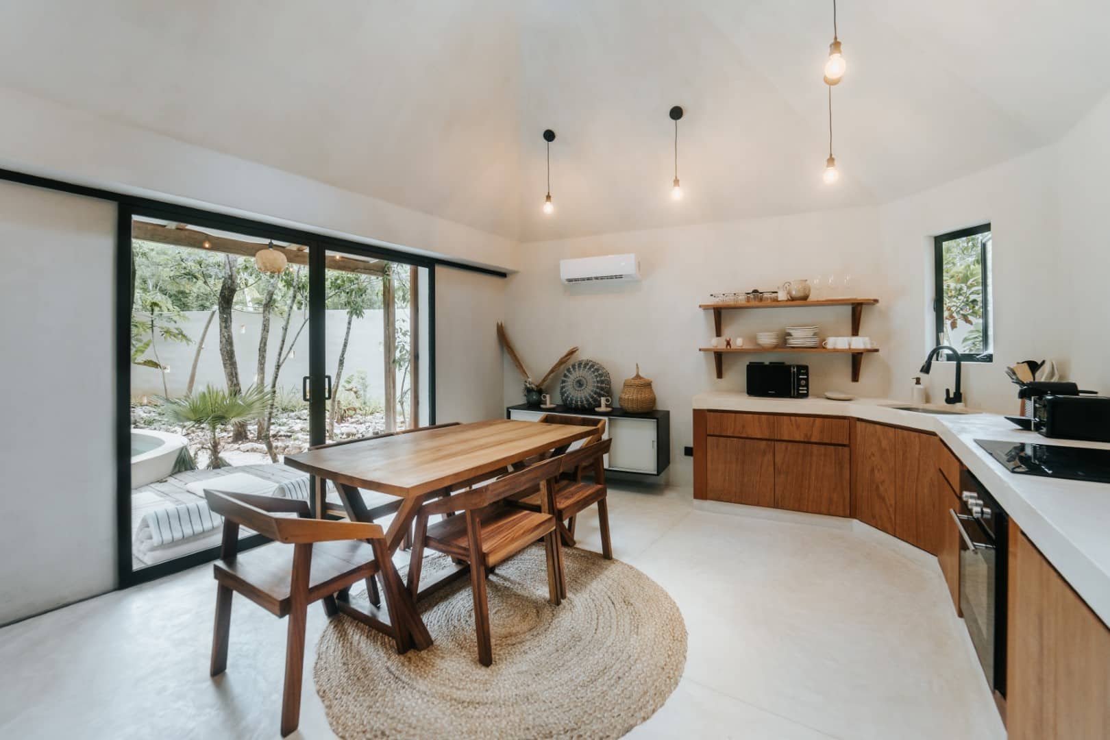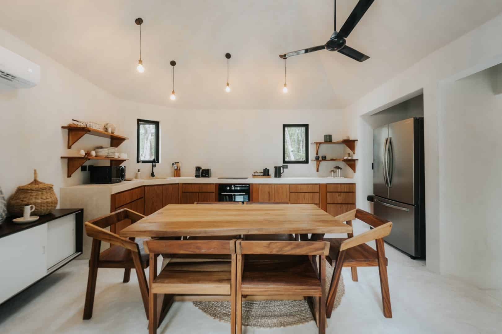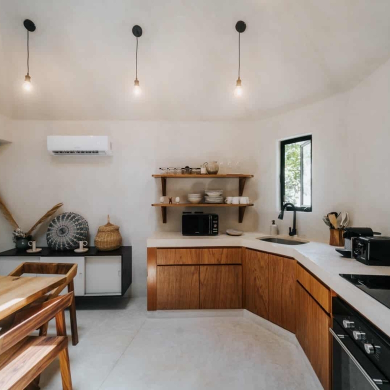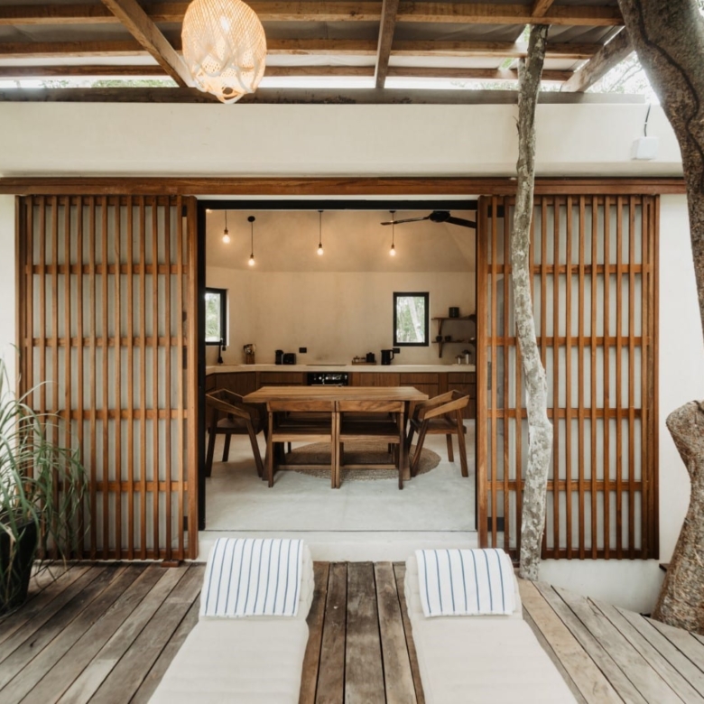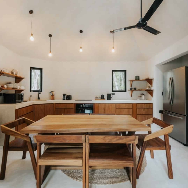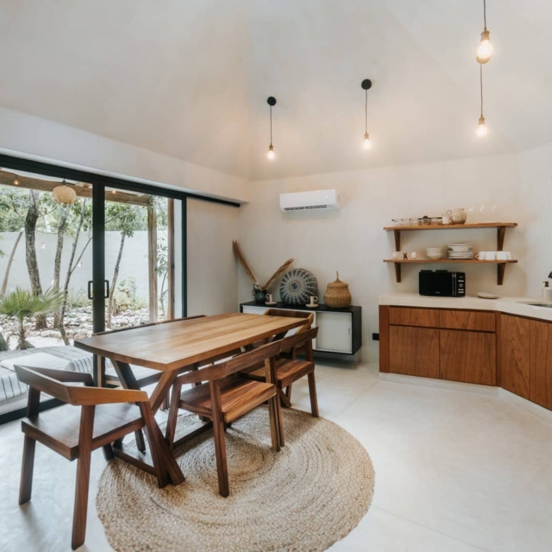 Step inside and you’ll find furnishings unlike anything mass-produced. Custom pieces are built by Tulum artisans using sustainably sourced wood from nearby farms. Every table, every bench, every light fixture tells a story—of heritage, of material, and of hands that still honor the craft.