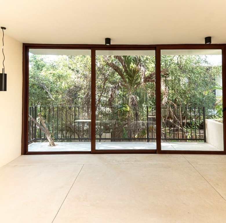 The open-concept living area seamlessly blends modern elegance with natural charm. A spacious kitchen island, premium travertine countertops, and effortless access to the private garden and pool make entertaining a delight. A lush oasis awaits outside, complete with a sparkling pool for cooling off under Tulum’s warm sun.