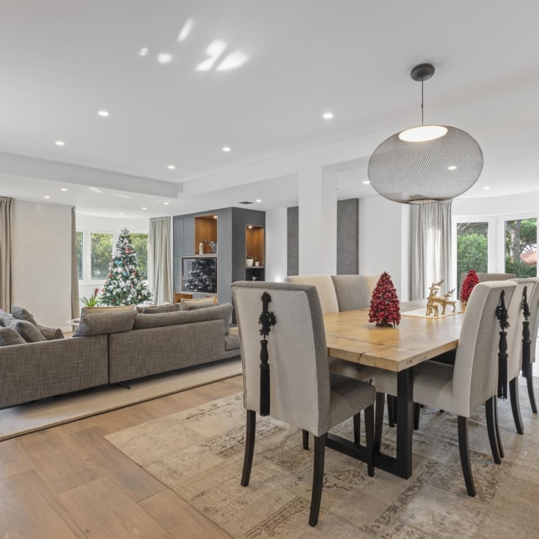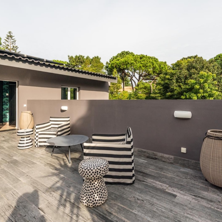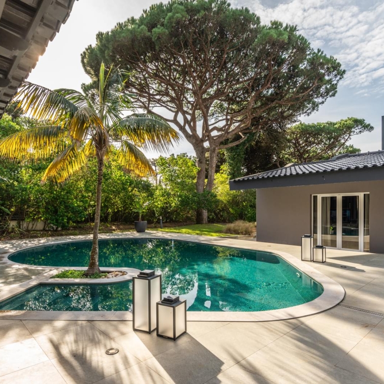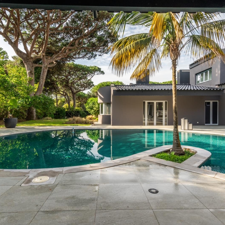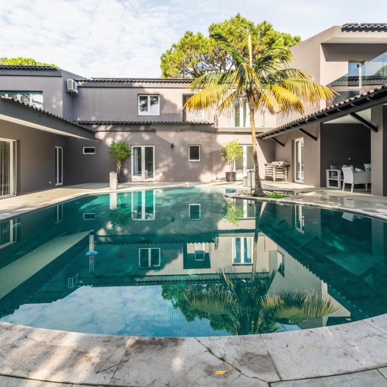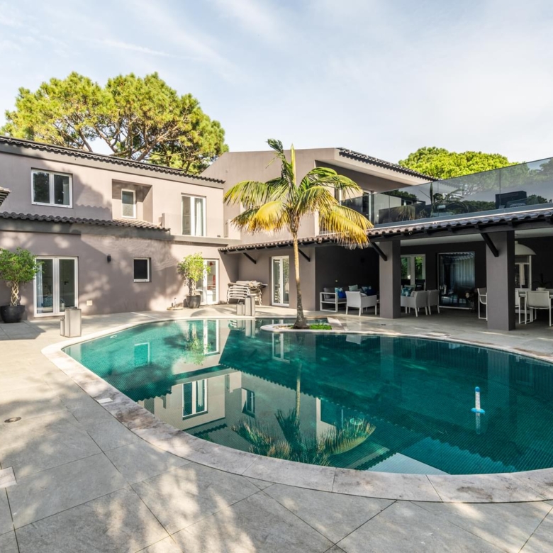 Villa in Quinta da Marinha Villa, located in Quinta da Marinha, in the south area, in a very quiet street and with plenty of privacy. Inserted in a 1507 sqm plot and with an around 560 sqm area of construction, the villa was remodelled a few years ago with excellent and modern finishes. In addition, the villa presents large dimensioned areas, ensuring ample and comfortable spaces. Sun exposure is also a prominent feature, providing natural lighting throughout the day. On the ground floor: - Hall - Social bathroom - Living room with fireplace and access to the garden - Dining room with connection to kitchen - Kitchen in Island with plenty of light, Smeg household appliances and a dining area. - Television room - Two bedrooms - A support bathroom - Suite with access to the garden - With a small unevenness we find an ample living room with access to a cosy porch and the swimming pool’s area - Laundry area with bathroom First floor - Master suite with a walk-in closet and a fantastic private terrace. - Office - Two bedrooms - A support bathroom - Bedroom or small room with access to the ground floor. Outside there is a very well maintained garden with several leisure areas, including a cosy and private porch and the swimming pool. Barbecue area, ideal for outdoor dining. This villa is quite spacious and comfortable, with the highest quality finishes and modern design. The bedrooms are large dimensioned and bright, providing plenty of privacy and comfort. The location is also privileged, in a quiet and residential area, but with easy accesses to services and local business. The villa is equipped with radiant floor heating and in some areas hot and cold air conditioning, solar panels and includes a garage for two cars. Located 10 minutes away from Cascais and 20 minutes away from Lisbon and the international airport, Cascais is a Portuguese village famous for its bay, local business and its cosmopolitanism. It is considered the most sophisticated destination of the Lisbon’s region, where small palaces and refined and elegant constructions prevail. With the sea as a scenario, Cascais can be proud of having 7 golf courses, a casino, a marina and countless leisure areas. It is 30 minutes away from Lisbon and its international airport. Porta da Frente Christie’s is a real estate agency that has been operating in the market for more than two decades. Its focus lays on the highest quality houses and developments, not only in the selling market, but also in the renting market. The company was elected by the prestigious brand Christie’s – one of the most reputable auctioneers, Art institutions and Real Estate of the world – to be represented in Portugal, in the areas of Lisbon, Cascais, Oeiras, Sintra and Alentejo. The main purpose of Porta da Frente Christie’s is to offer a top-notch service to our customers. Property ID: PDF-PF32317 Price: €5,950,000 Property Size: 483.5 m2 Land Area: 1507.0 m2 Bedrooms: 5 Bathrooms: 5 Property Type: House Property Status: For Sale