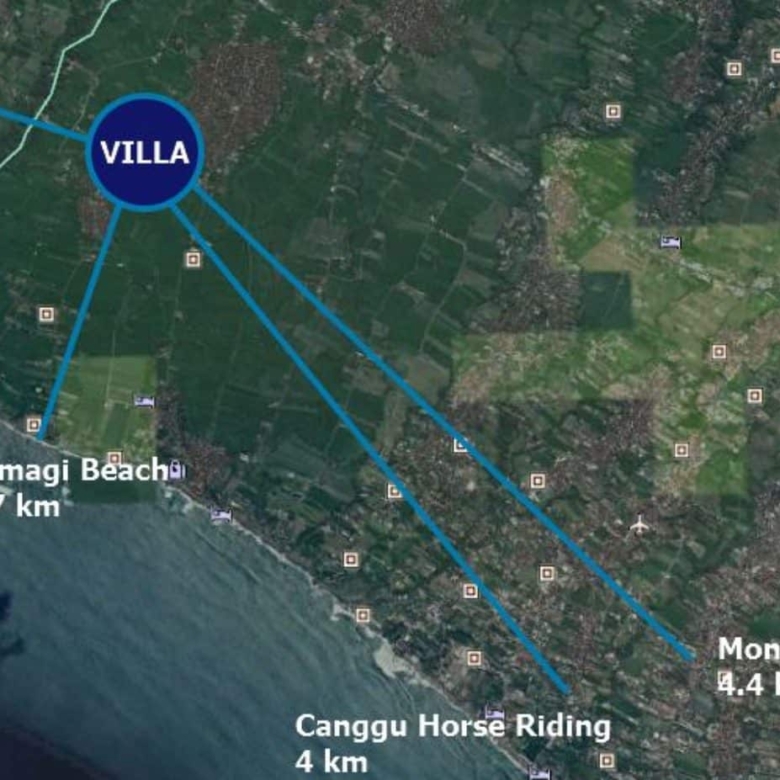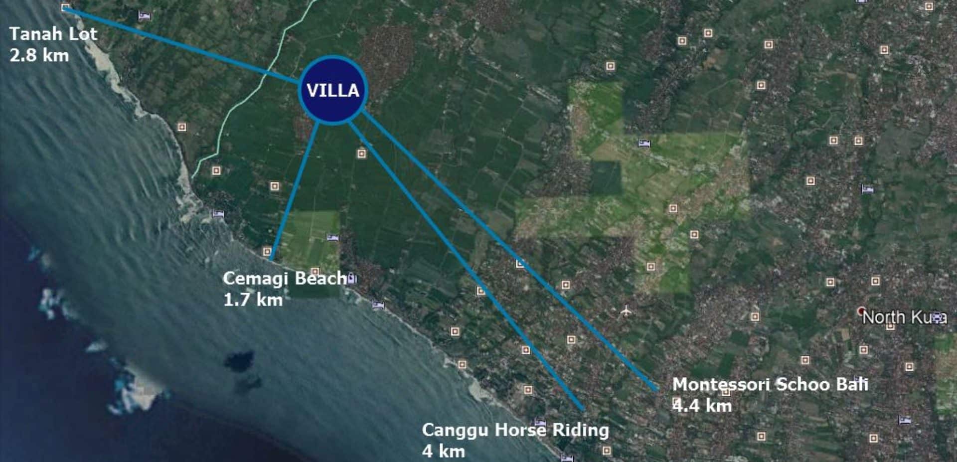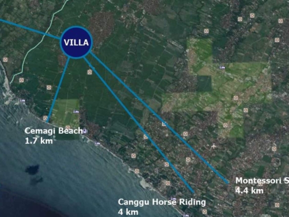 The villa’s location offers more than just peace; it offers convenience. You’re a stone’s throw away from Cemagi Beach, perfect for sunset walks, and just 1.75 km from Pepito Supermarket for quick grocery runs. Montessori School is 4.2 km away, ideal if you’re planning a family. For beach lovers, Pererenan Beach and Canggu Beach are 2.7 km and 3.8 km away, respectively. if you’re into sports, Jungle Padel is just 3.2 km from the villa.