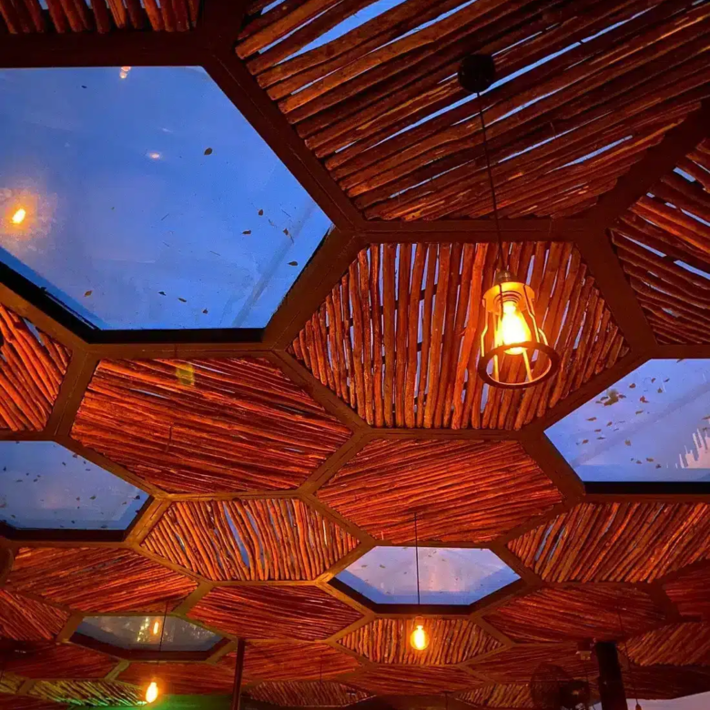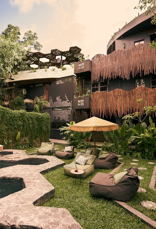 Key features include a rooftop area with capacity for 250 guests, equipped with a DJ booth, dance floor, and seating for 65. A restaurant on the main level includes a 20-seat communal table made from Parota wood, plus space for 32 more guests. There is also a ground-floor smoothie bar.