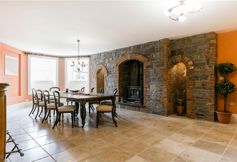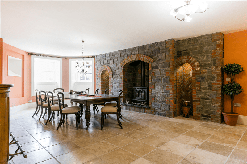 Formal Dining Room: 10.31m/ 33.8 ft. x 5.31m/ 17.5 ft. Natural Stone flooring, dual aspect windows, curved wall, bespoke crafted curved curtain rail, sash windows overlooking the colourful garden. Feature spot lighting built into the impressive masonry brickwork and double arches, solid fuel stove.