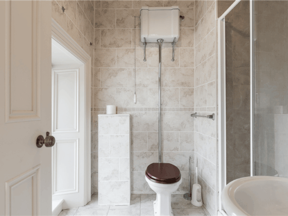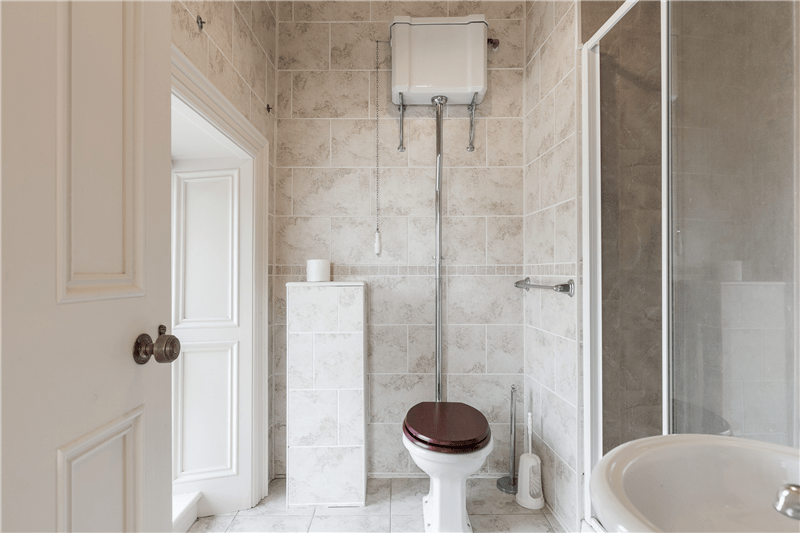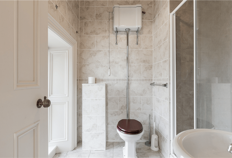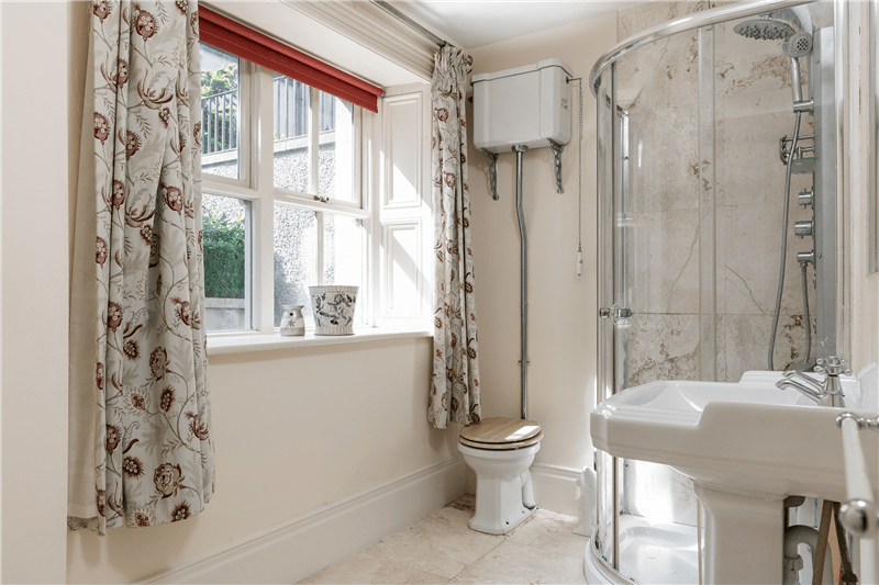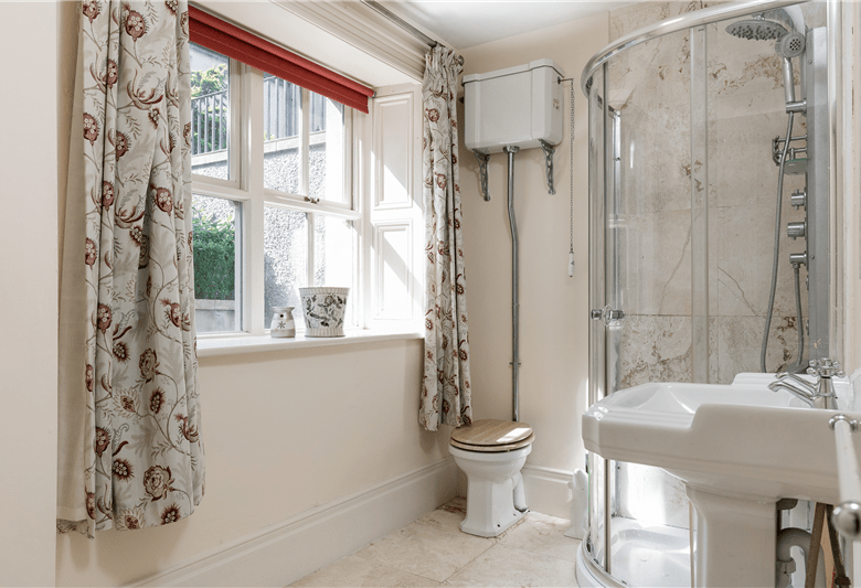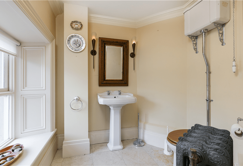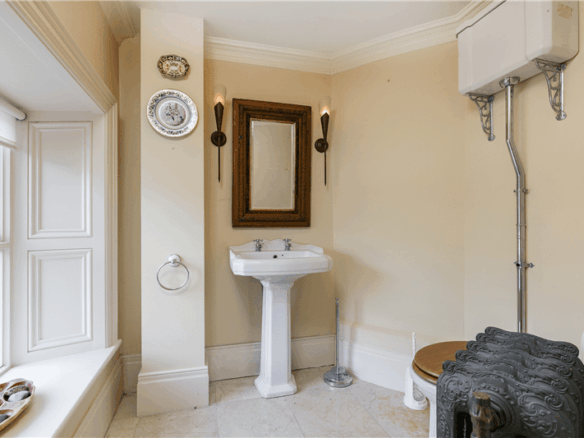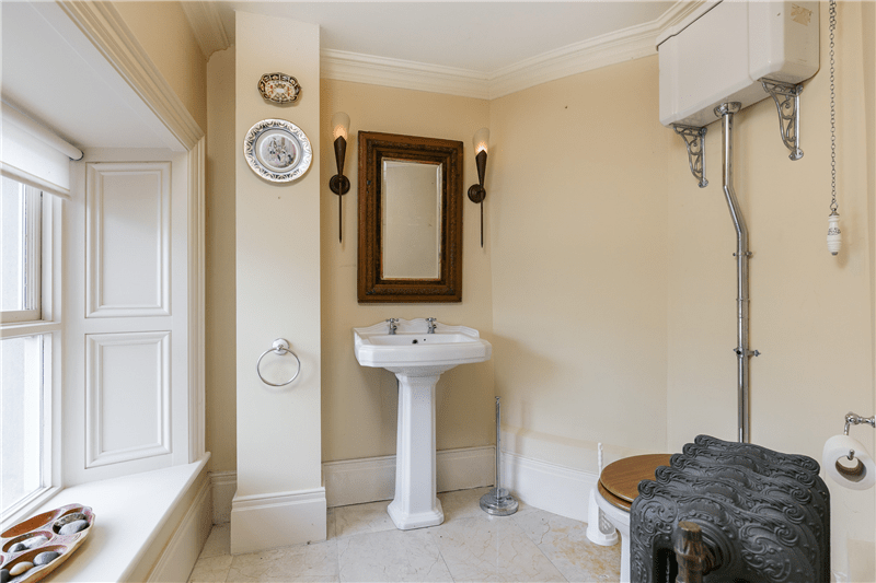 (Two Steps Down) Guest Bathroom: 1.98m/ 6.5 ft (max) x 1.98m/ 6.5 ft. (max) Antique style wash hand basin and WC, with traditional pull leaver, marble flooring, cast iron radiator, sash window overlooking the courtyard.