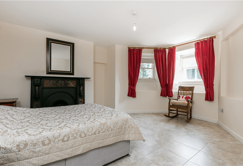 Bedroom 3: 4.94m/ (max) x 4.70m Marble flooring, feature bay sash window on curved wall, open fireplace framed with a black mantle with burnt orange and green Welsh slate inbuilt and black plated insert (not for use). TV point, multiple power points.