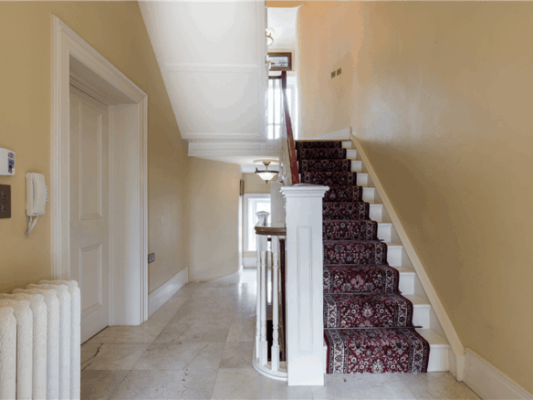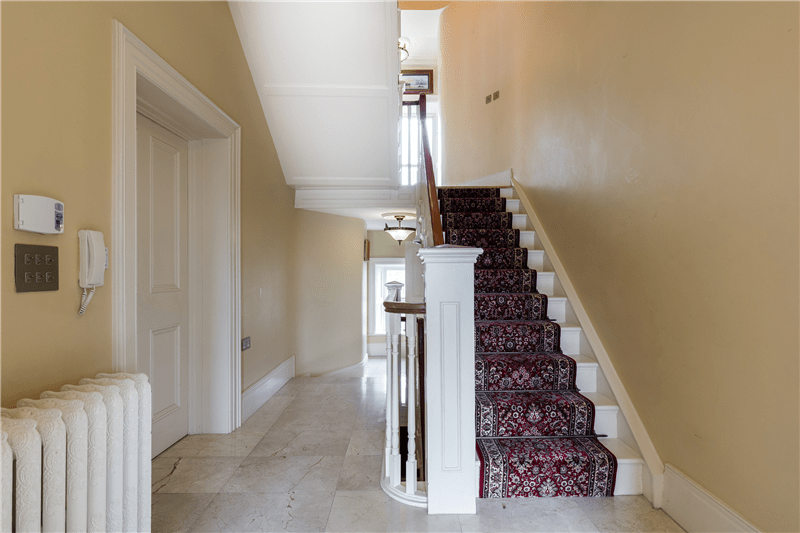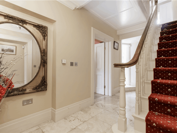 Entrance Hallway: 10.40m/ 34.1 ft. x 2.74m/ 8.10 ft. Marble flooring with centre marble cut mosaic feature, the preserved four arched alcoves built into the surrounding walls, cast iron radiators, gate intercom and alarm.