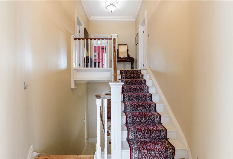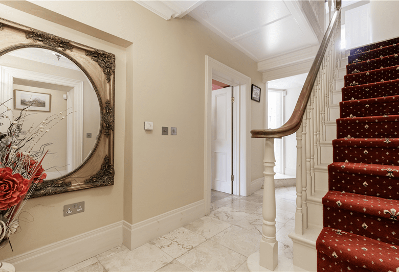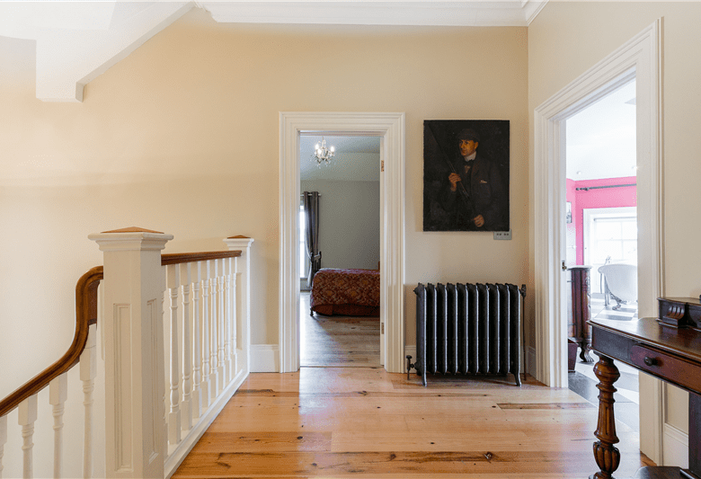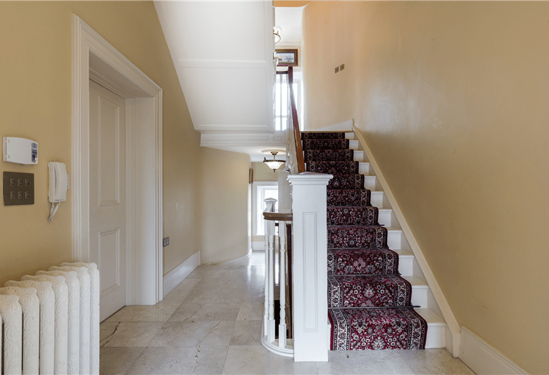 Immediately ahead of the main entrance hall reception area is found the main hallway. The outstanding feature of this area is the fantastic period staircase that leads to the upper levels. Built in a style that compliments the age of the property, the staircase is complete with a stunning mahogany carved monkey tail handrail and carpeted stair runner with brass retaining rods. To the left on arrival at the first landing is found the library/ gallery area. Flooded with light from three sash windows overlooking the rear courtyard and distant fields, this area would also be the ideal space from which to work from home. Opposite on the same landing is the guest bathroom.