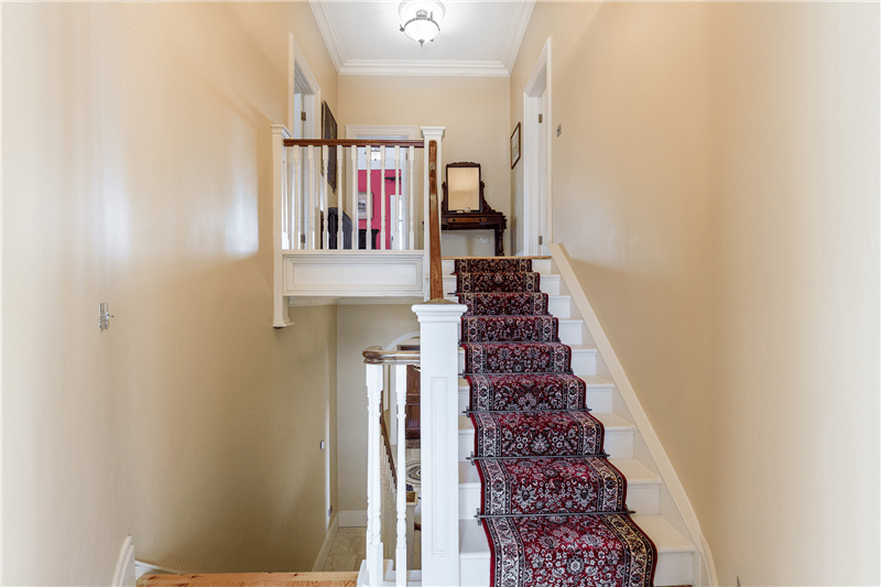 Staircase to the first floor: Mahogany handrail and carpet runner with brass rod fixtures to…