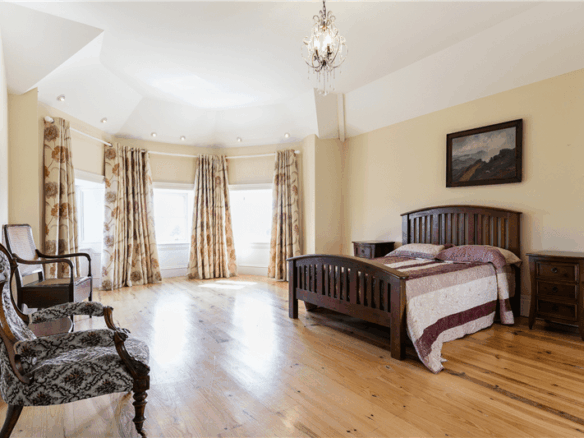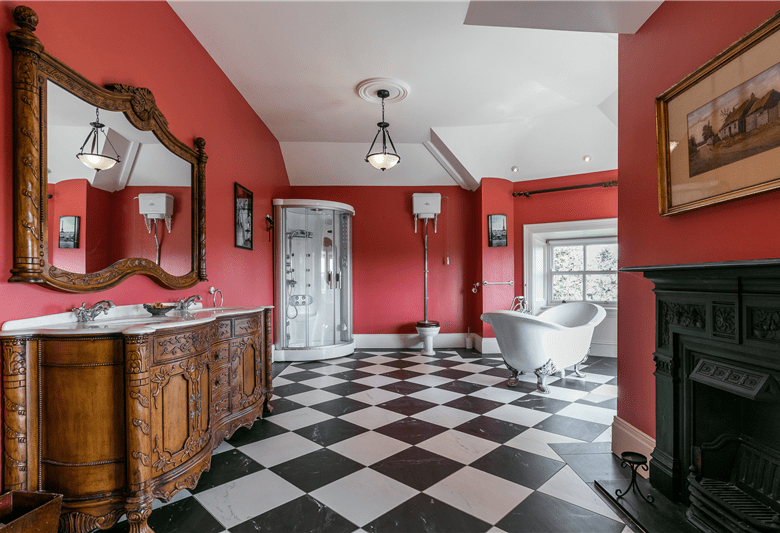 Immediately adjacent to the Master Bedroom Suite is the large family bathroom complete with an antique style standalone roll-top cast iron bath, cleverly positioned to overlook the same countryside views whilst bathing in extreme luxury by the glow of the fire surrounded by the amazing antique cast iron fireplace. The large AGI corner shower unit with multi head jet shower, music system and lighting controls make bathing a long and luxurious process. The W.C is an antique style pan that has a raised cistern with pull chain. By far the crowning glory of this room is the unique antique mirror back dresser that has been remarkably and professionally repurposed into a one-off antique furniture piece. This takes the form of a double vanity sink unit with marble top and wall mounted mirror with intricately carved matching frame. Adjacent to this bathroom is another large bedroom with feature curved walls and two sash windows overlooking the fields and distant hills.
