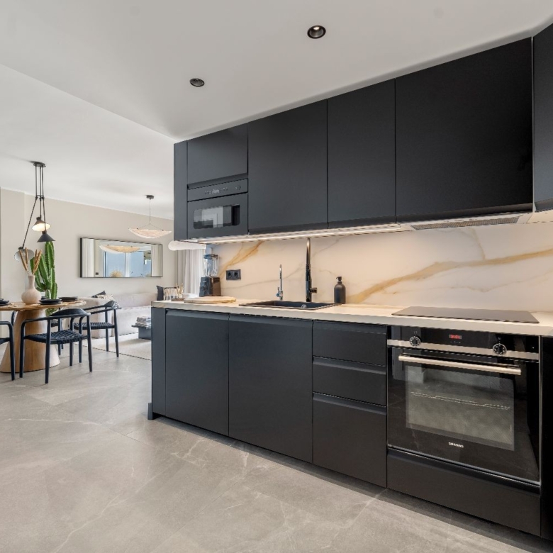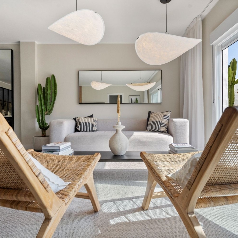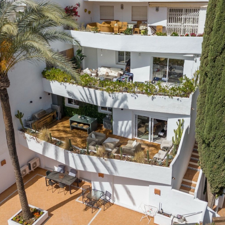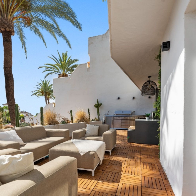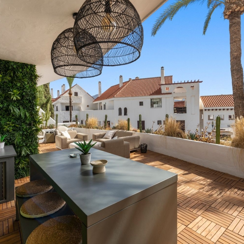 Nestled in the beautiful Nueva Andalucia valley, this property is a true jewel and undoubtedly one of the best newly remodeled homes available. Subdued luxury and Scandinavian minimalist elegance come together to create a home that guarantees comfort everywhere. The amazing apartment captivates you with its tranquil surroundings right away. The kitchen is sleek and contemporary, open concept, and completely furnished with the newest appliances and technology as you enter through the corridor. Plenty of closet space allows for generous use of surface area. The dining area, which is elegant yet understated, is visible from the kitchen and is located next to it. The dining room and living room both have direct access to a large terrace, and the area is filled with shadows and reflections thanks to the clever placement and use of mirrors. There are two bedrooms that are accessible from the living room. Each room exudes calmness as you enter because to their exquisite combination of natural materials, such as pinewood, and their impeccable white attire mixed with delicate grey and neutral stone. Again, clever mirror placement makes space appear to double and light refracts everywhere in each of the bedrooms. Finished in sleek white and pewter stone, the bathrooms are both elegant and striking. The master bedroom’s en suite is sophisticated and in style, with shower cubicles and black-framed glass doors that subtly complement the black accents on the lights, faucets, and other accessories. The main patio, which has wooden flooring the entire length of it, is equally beautiful. This expansive terrace features a dining area with seating at one end, complete with a living wall, and is adjacent to the outdoor kitchen and barbecue. It invites you to come have a seat and enjoy a cocktail before dinner. Additionally, there’s a lounge area with comfortable couches and armchairs for lounging. Nestled in a gated community, this exquisitely furnished house is only a short stroll from Puerto Banús and its most beautiful beaches. It’s also conveniently located just a short drive from Marbella and San Pedro, as well as some of the region’s top golf courses. For extra security, the unit also has a separate parking space available.