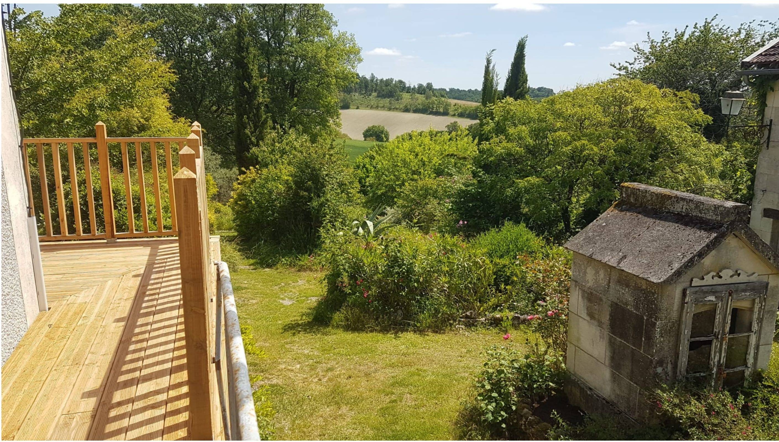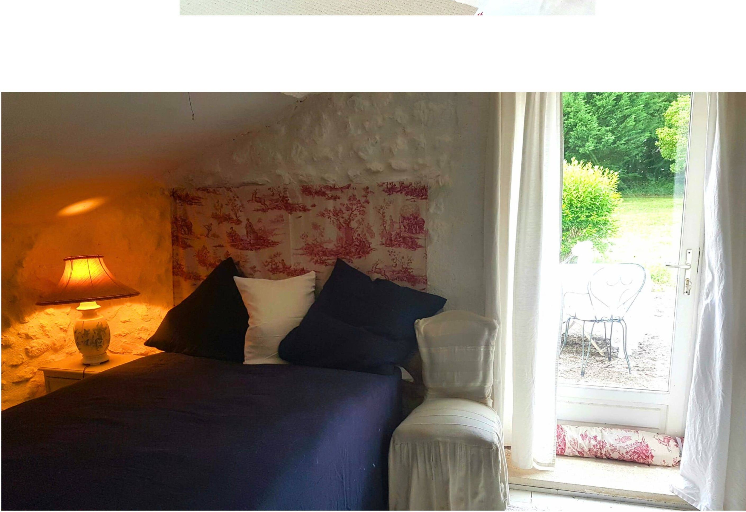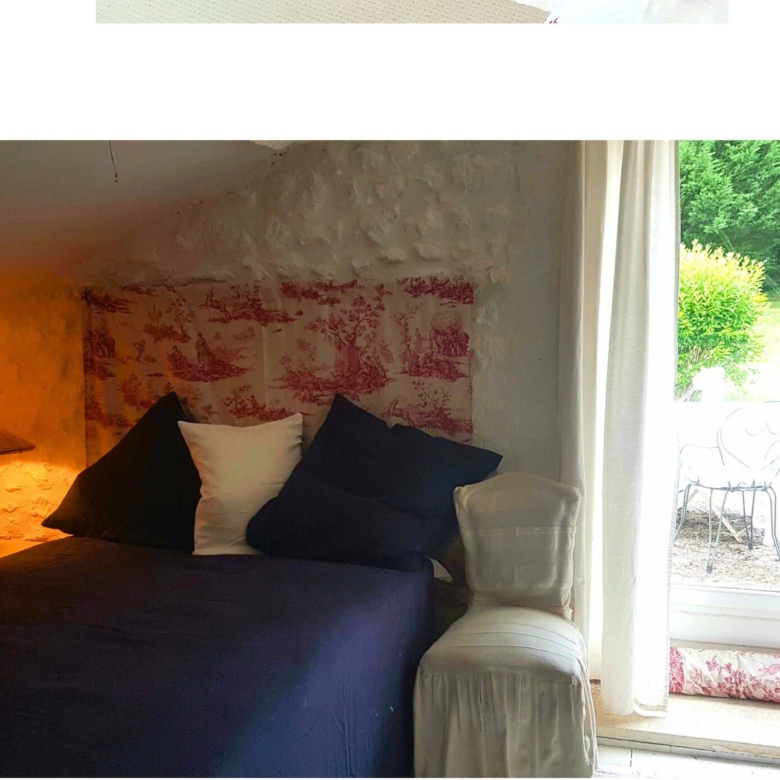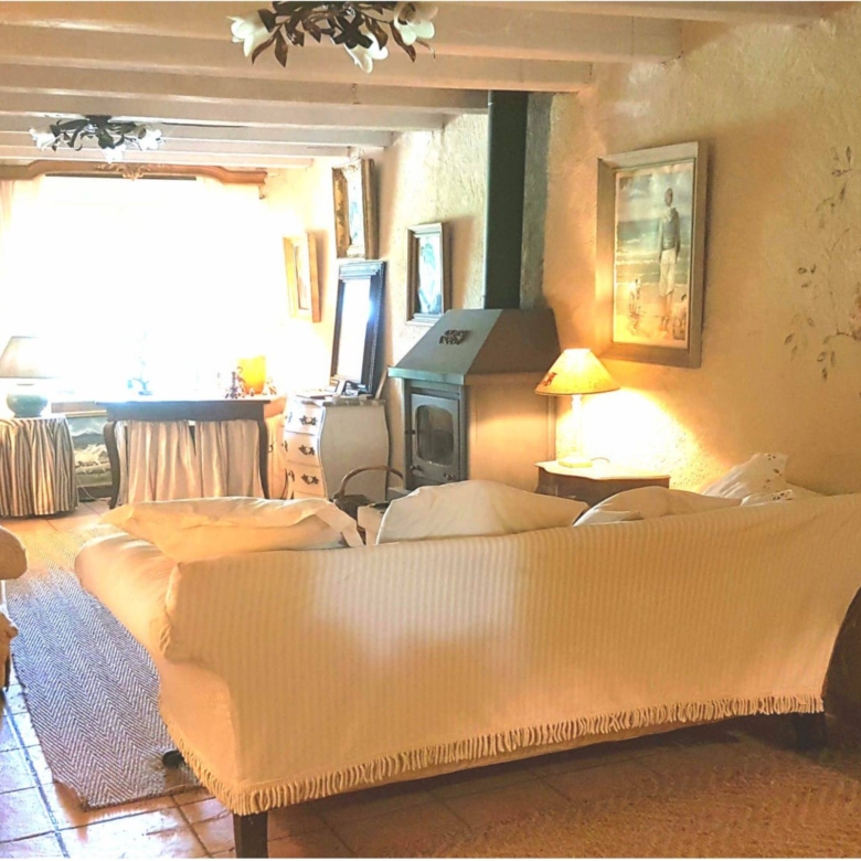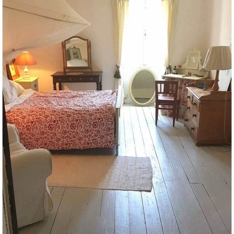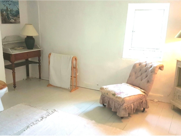 Attached to the main house is the original farmhouse, which has been sensitively integrated to expand the living space. This section features 2 additional bedrooms, sharing a convenient Jack and Jill bathroom. A highlight of the farmhouse is its charming balcony, which offers further beautiful views of the surrounding countryside, perfect for enjoying quiet moments or an evening aperitif. The combined six bedrooms and three bathrooms ensure that guests or family members have ample space and privacy, making Chillaveau ideal for hosting gatherings or accommodating visitors for extended periods.