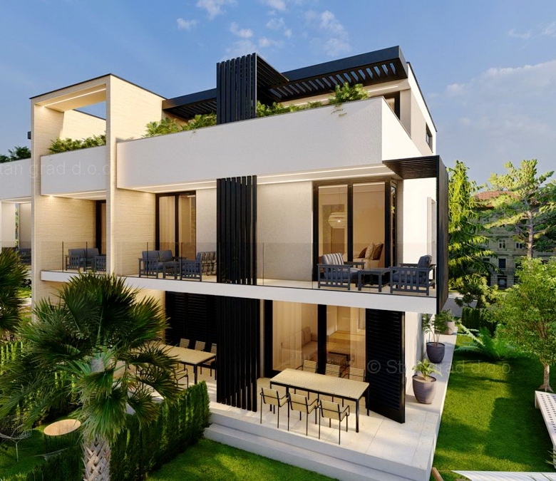 NEW CONSTRUCTION – KRK ISLAND!! The town of Krk, in a good location 300 m from the sea, an apartment for sale in a quality new building. This beautiful luxury apartment extends over three floors. On the ground floor there is an entrance area, kitchen, dining room, terrace with access to the garden, toilet and a staircase leading to the first floor. On the first floor there are two bedrooms, one of which has access to a balcony, a bathroom and a staircase to the second floor. On the second floor there is a gallery with a bathroom and a terrace with a jacuzzi. This exceptional apartment will be equipped with top-of-the-line equipment such as underfloor heating, air conditioning and a smart home system. This functional concept allows the new owners a view of the city of Krk and the sea. The owner of this apartment will have one garage space and one outdoor parking space. Near this property there are all necessary facilities for a pleasant vacation: beach, shop, promenade. The price includes VAT, which means that the buyer is exempt from paying any tax and the seller guarantees clean ownership documents. Visit us on the island of Krk and we will make sure that you feel the satisfaction of all our clients. If you decide for us, the agency Stan Grad Immobilien will be happy to help you transfer ownership of the property, as well as electricity, water and utility bills to your name. The planned completion of the works is December 2023.
