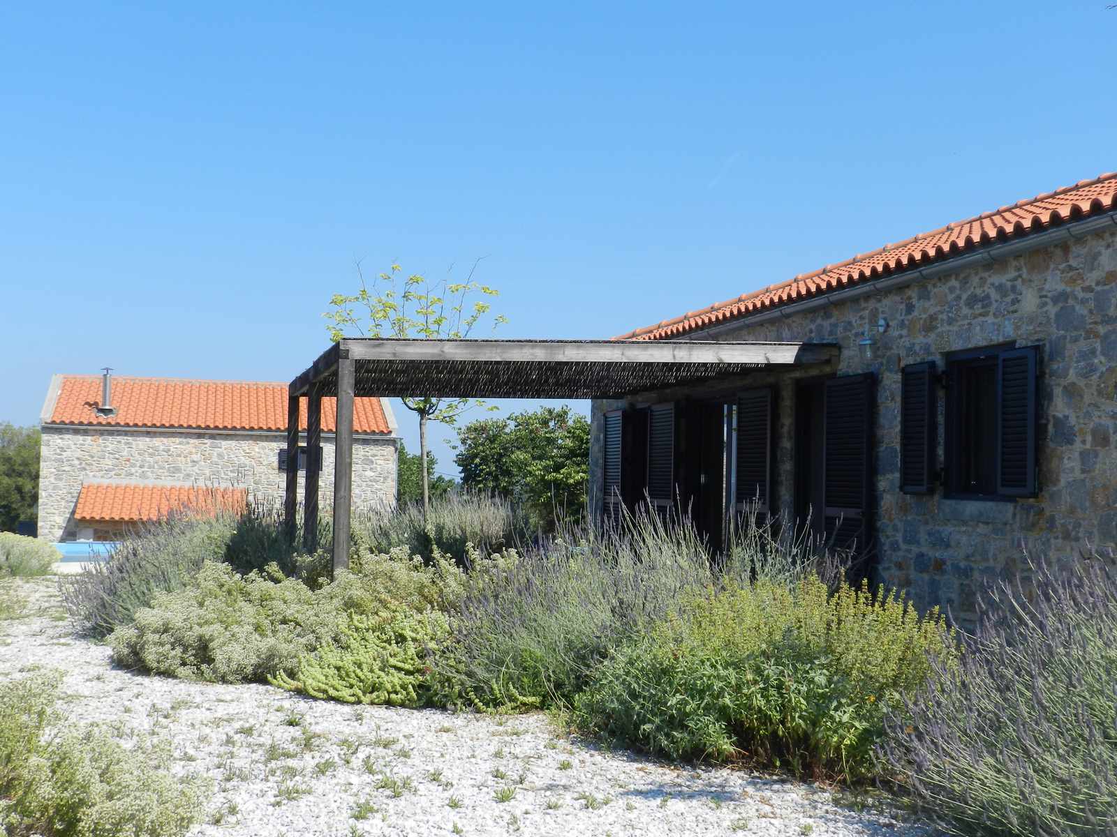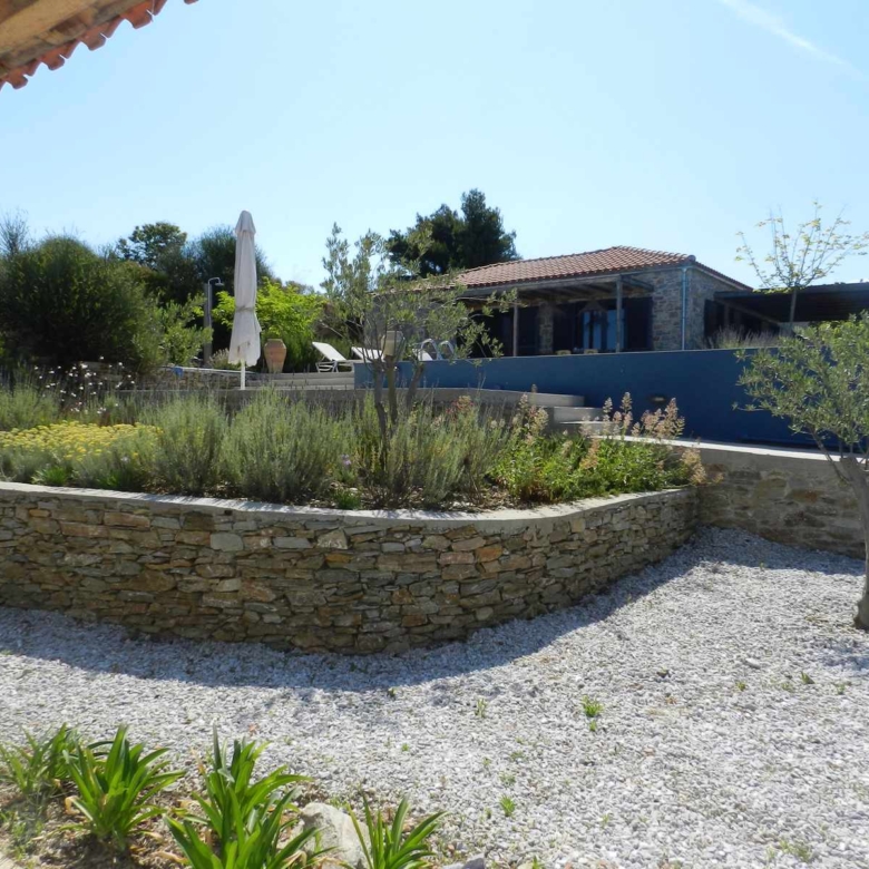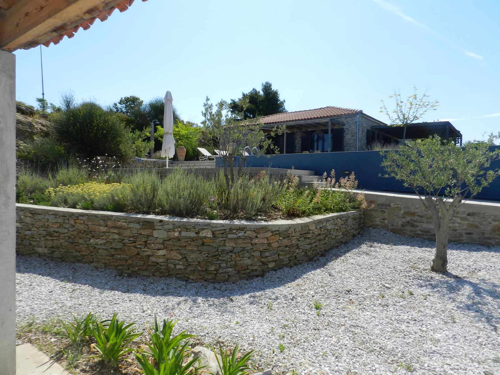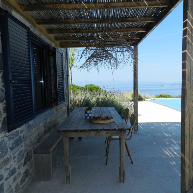 The plot is spacious and has many terraces in different levels. All with splendid views to the sea, the neighboring island of Skiathos and beyond to Evia. The garden is alive with Mediterranean plants and flowers. The swimming pool is sizeable and the terraces around are spacious with stone made walls. There is an outside shower on the pool area and an outside W.C.