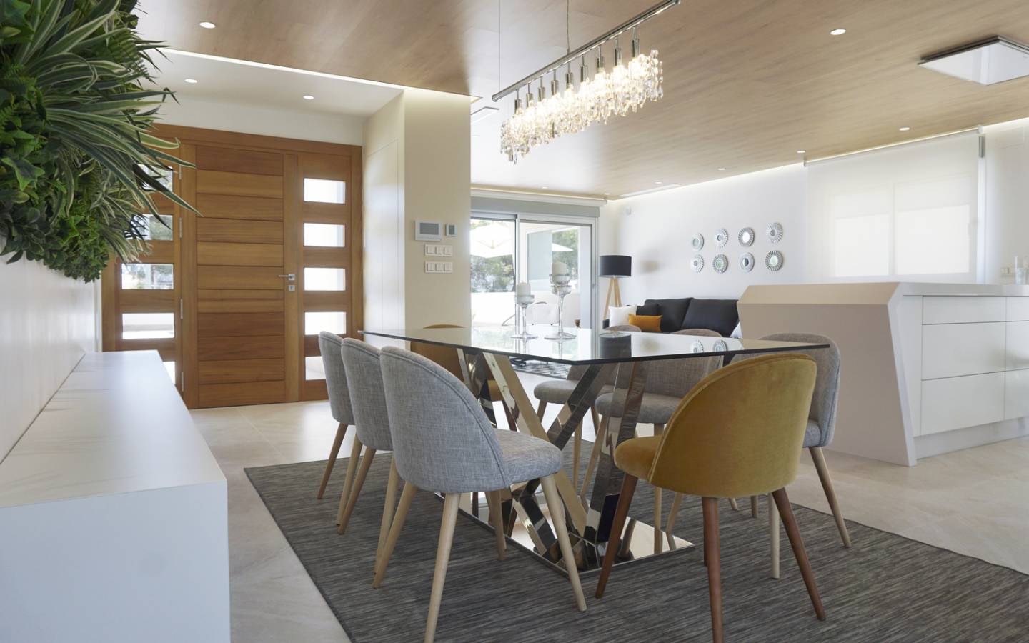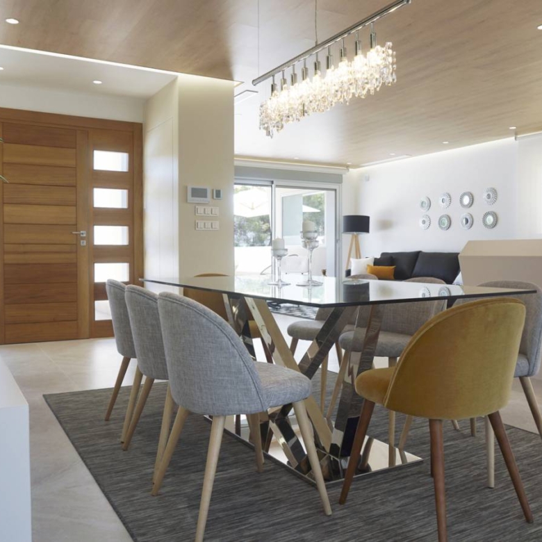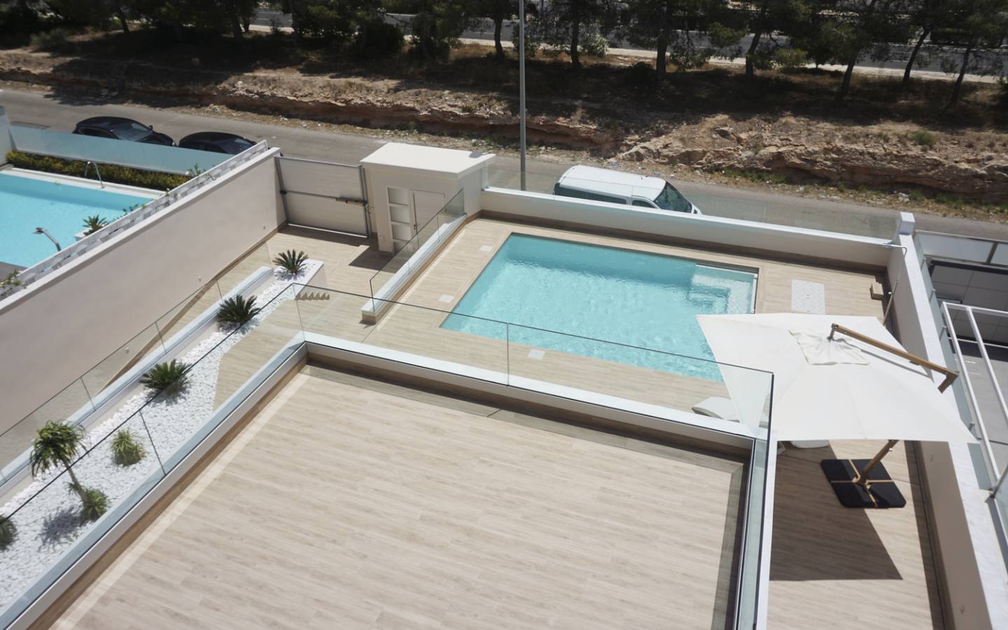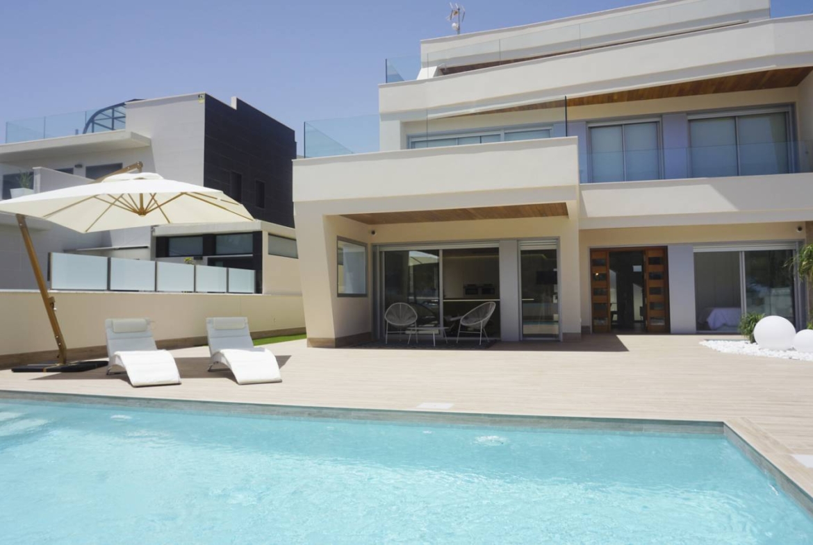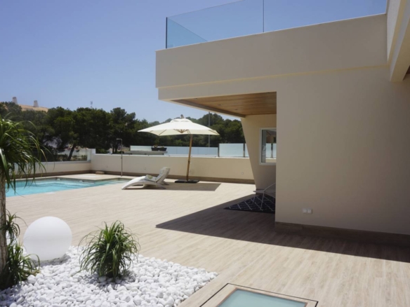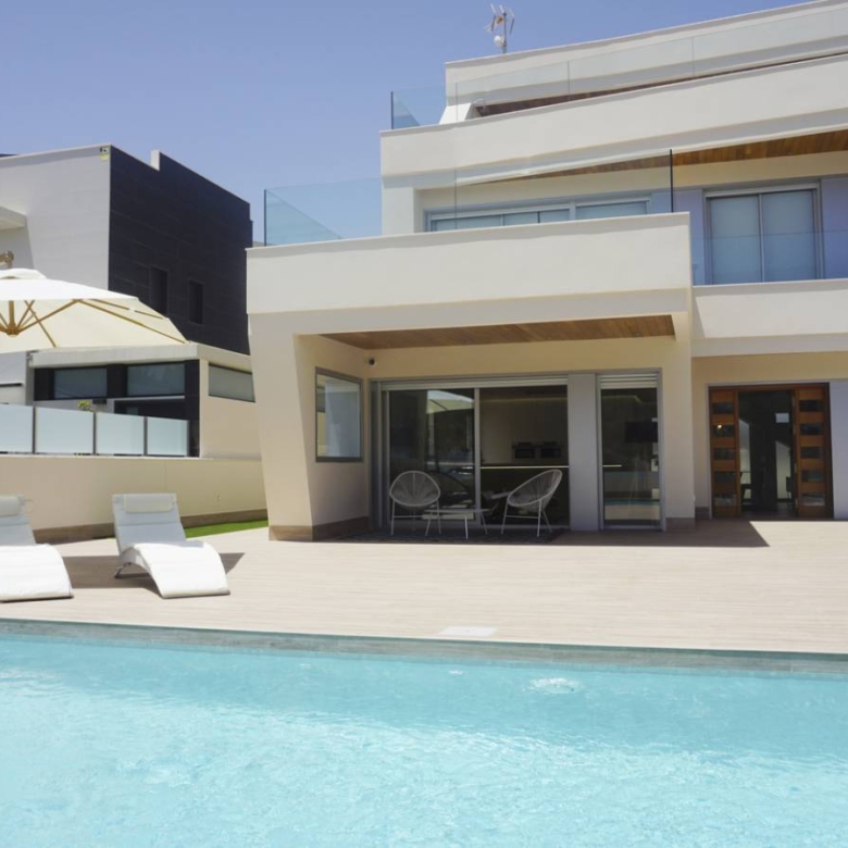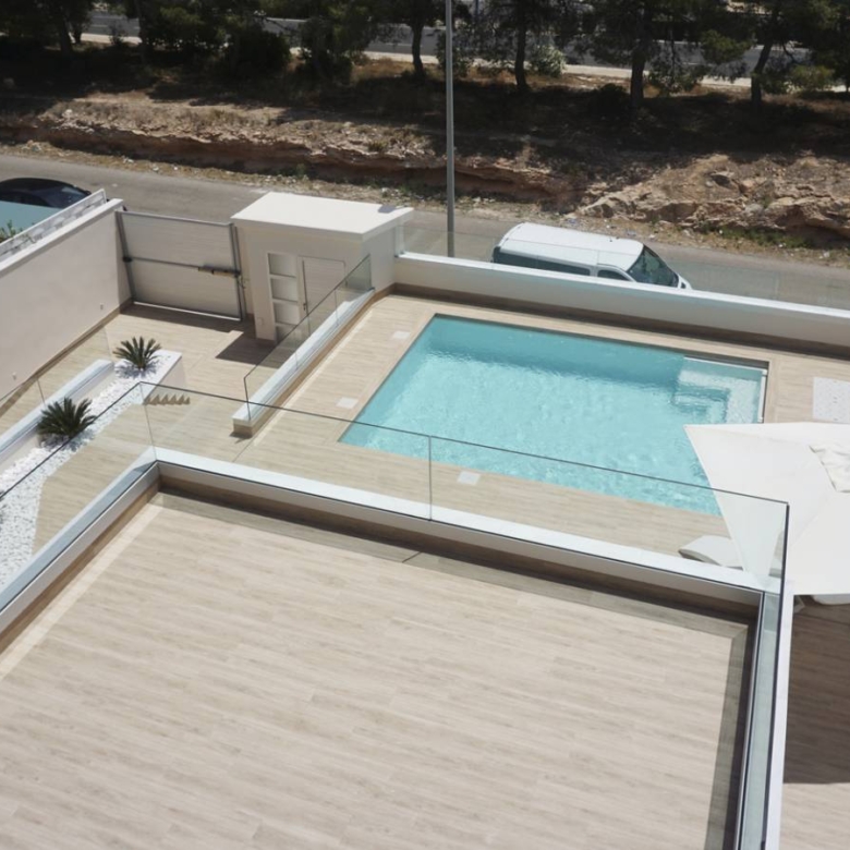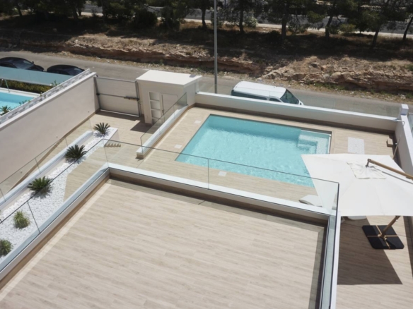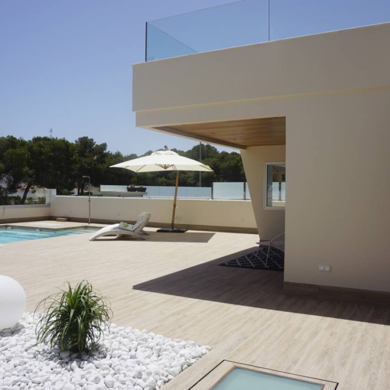 Luxury villas in Dehesa de Campoamor, Costa Blanca Homes with 4 bedrooms and 4 bathrooms, with more than 500m2 of plot, large terraces, gardens, private pool and basement for garage. They are located in Campoamor, a place envied for its pleasant and healthy climate that has wonderful beaches such as ‘La Glea’ and ‘Aguamarina’ with long promenades and marinas. With 5 Golf Courses within walking distance, Shopping Centers such as ‘Zenia Boulevard’, the proximity to the airports of Alicante and Murcia, the extensive offer of leisure, health and sports will make you fall in love with our privileged environment. * Appliances included: ceramic hob, extractor hood, washing machine, dishwasher, oven, microwave and refrigerator.* Elevator from basement* Central air conditioning system, underfloor heating by water and air conditioning by ducts.* Private pool* Basement with laundry room and bathroom* LED lighting and portholes included* Glass screens in showers* Water softener machine* Alarm pre-installation* Security shutters* Recessed interior and exterior housing lighting included* Bar-kitchen with small fridge in the solarium Property ID: GH-307357 Price: €1,430,000 Property Size: 336 m2 Land Area: 502 m2 Bedrooms: 4 Bathrooms: 4 Property Type: Villa Property Status: For Sale