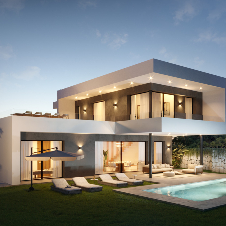 Discover excellence in every detail with the construction qualities of this project. These villas pride themselves on offering you the best of the best. High-quality finishes are a distinctive feature of these residences. We use porcelain flooring and tiling from renowned brands such as Porcelanosa, ensuring lasting elegance. With rectified formats of 80 x 80 for floors and 45 x 120 for tiling, each space exudes sophistication and style. Security and energy efficiency are top priorities in our designs. Therefore, we use aluminium enclosures from leading brands like Strugal, with thermal break, double glazing, low-emissivity solar control, and safety glass. Your peace of mind and comfort are guaranteed. Our solid passage doors, veneered around their entire perimeter and lacquered in white, add a touch of elegance to each room. Built-in wardrobes, with drawers in bedrooms, offer practical and functional storage. Comfort is paramount, so we equip all areas with air conditioning through the Airzone system, ensuring a perfect environment at all times. In addition, hot water supply through aerothermal energy and underfloor heating in the living room, bedrooms and basement provide exceptional comfort and energy efficiency. To provide you with maximum control and convenience, we include pre-installation of home automation, allowing you to customize your home according to your needs and preferences. In these residences, every detail is designed to offer you an unparalleled living experience.