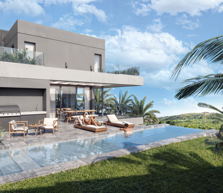 * Chill-Out Area and Pool: A semi-covered space with pergolas and a private 37 m² pool, ideal for enjoying the Mediterranean climate.