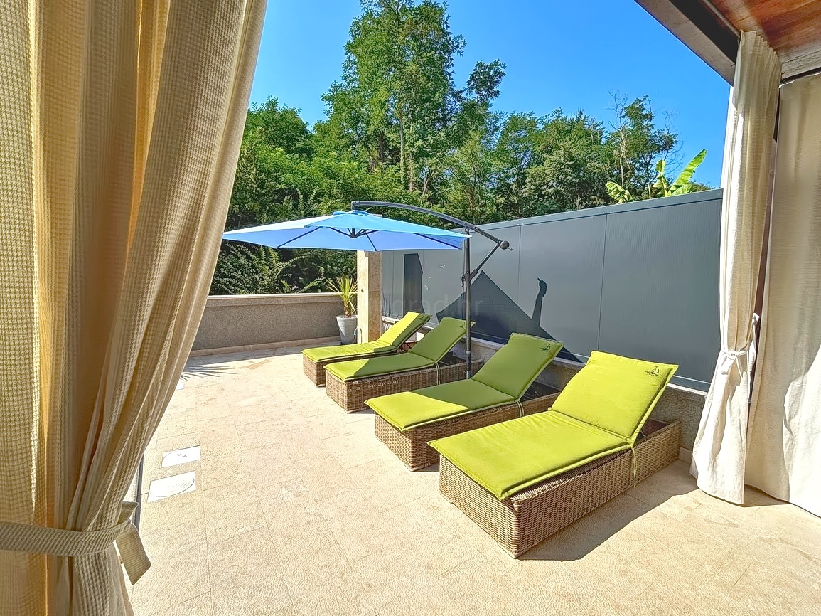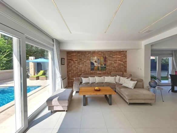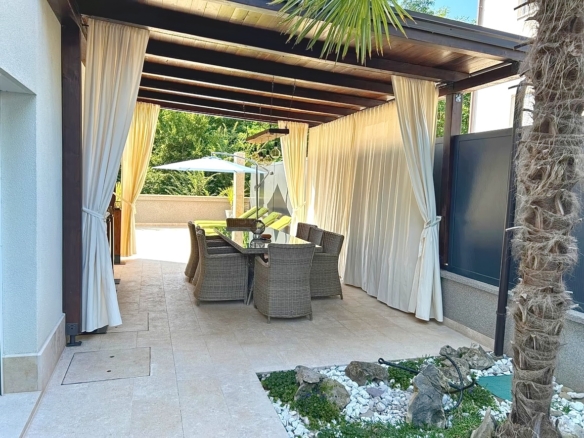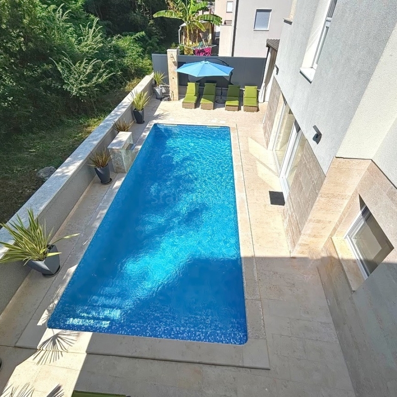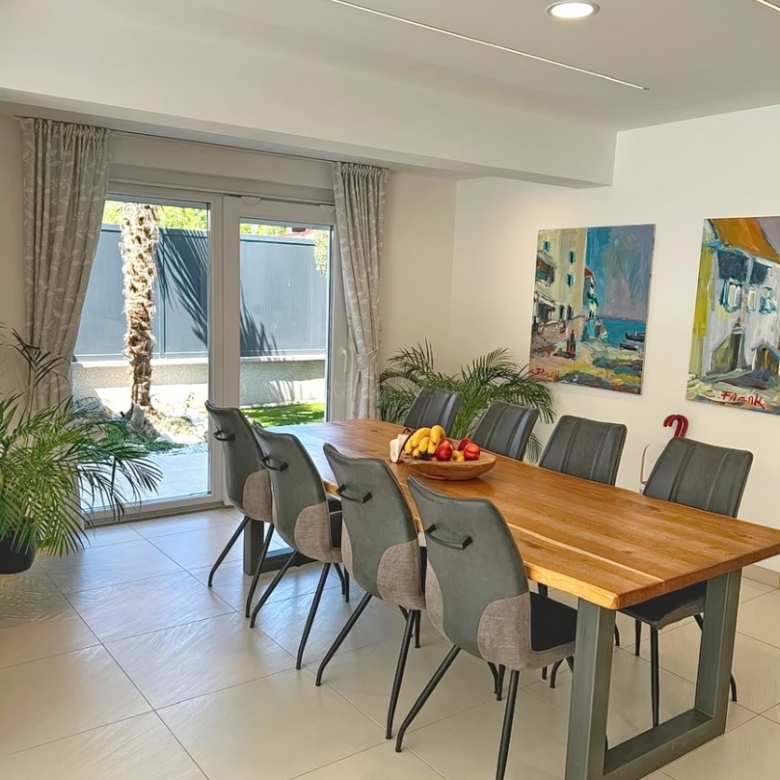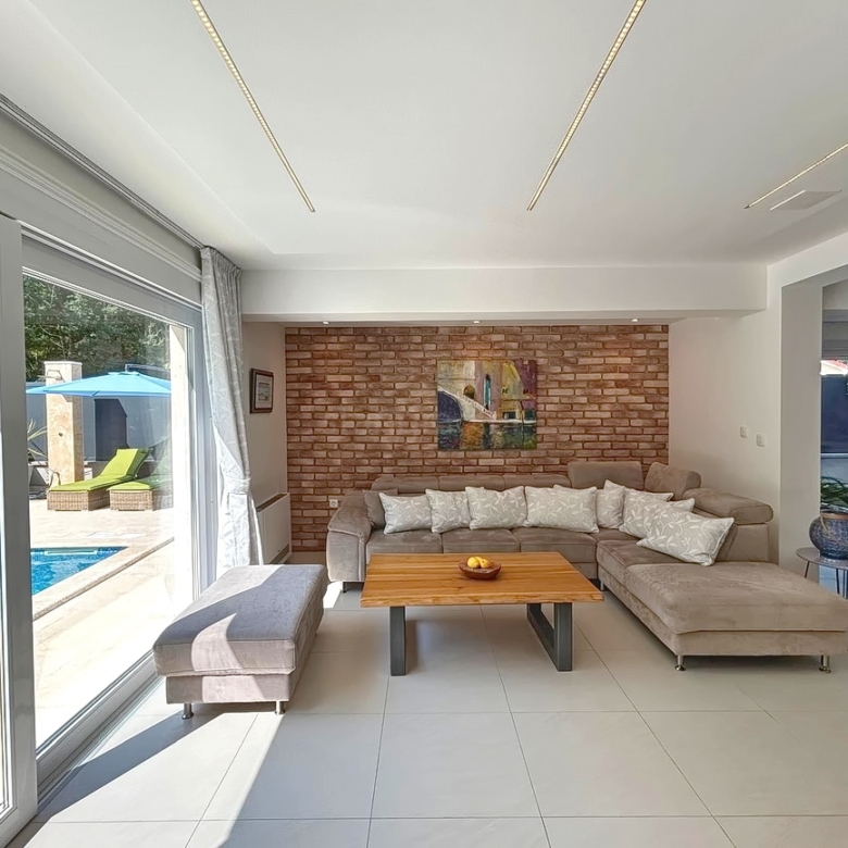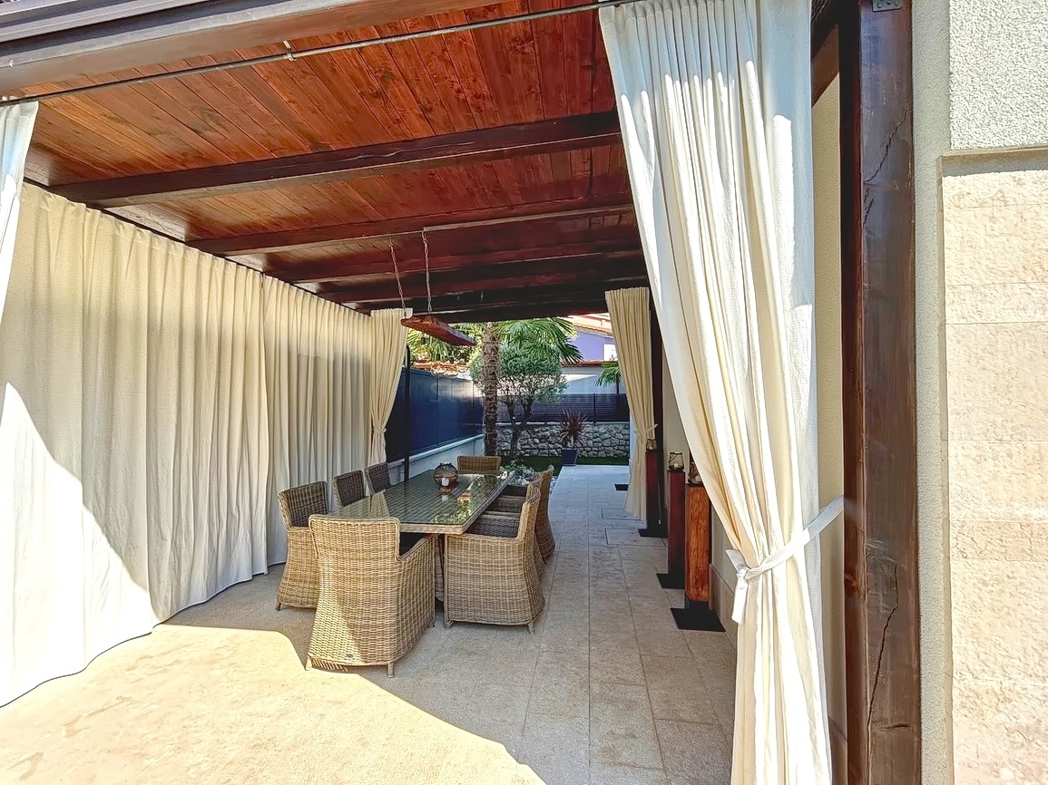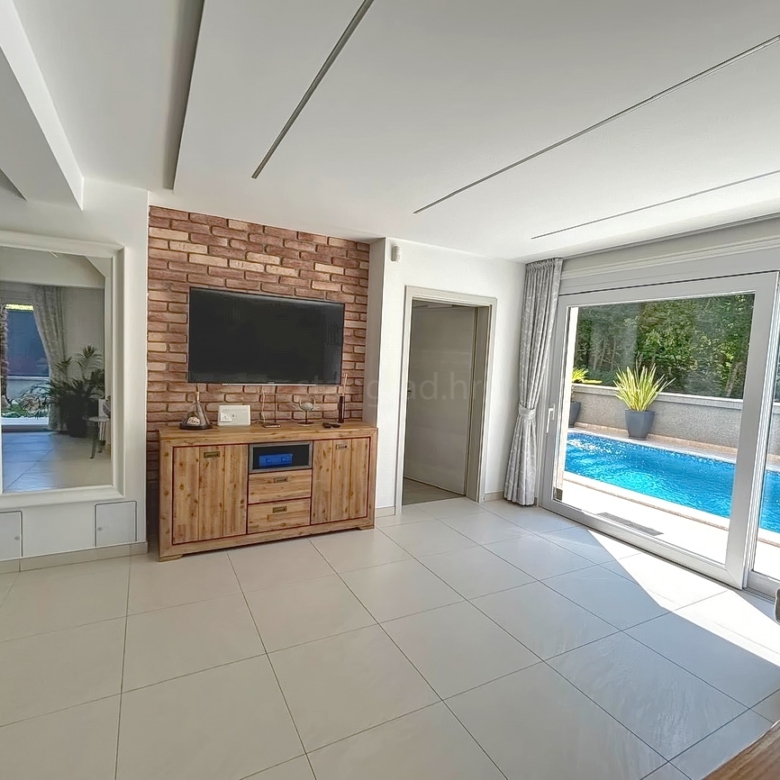 As part of the attractive Kvarner real estate offer by Stan Grad Immobilien, a designer-designed and modernly built tourist villa is for sale in the Mediterranean region of the northern Adriatic, on the island of Krk. This beautiful property is located in a peaceful area near Dobrinj, not far from the sea, yet far enough to ensure privacy and tranquility. It is a detached house spread across three levels, offering top-level comfort.