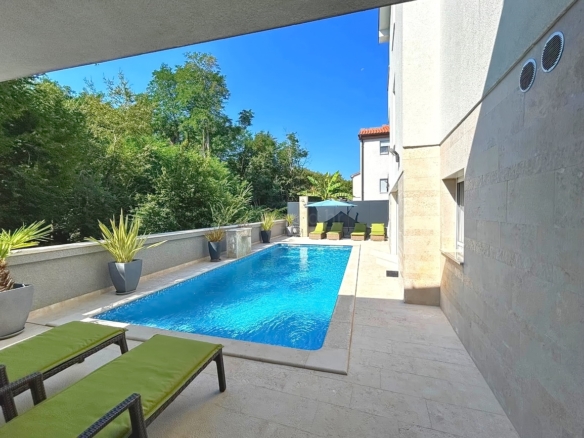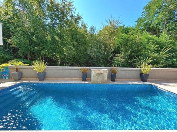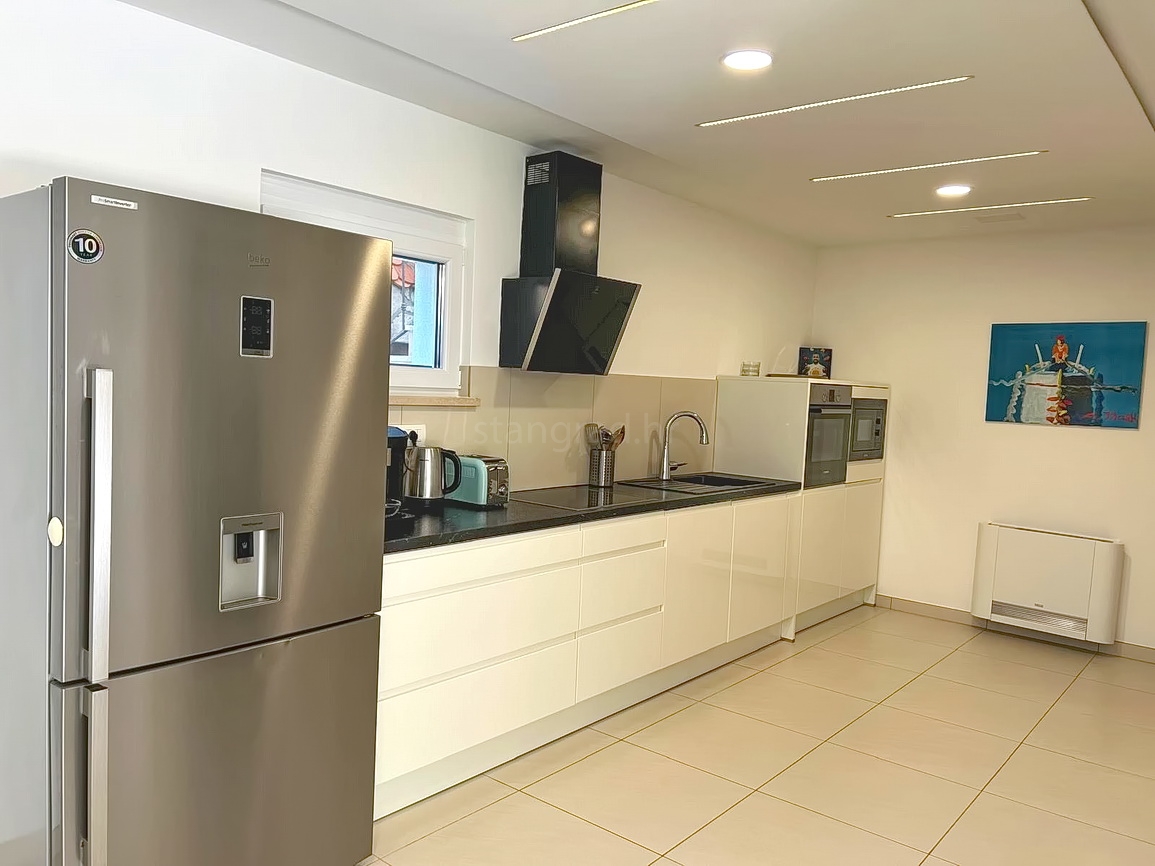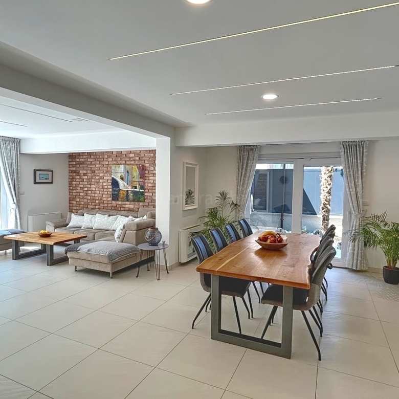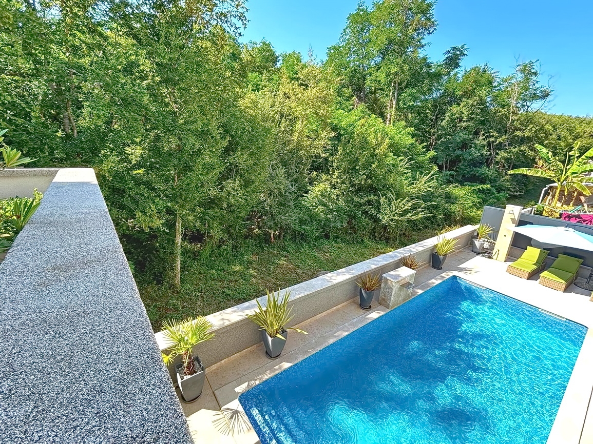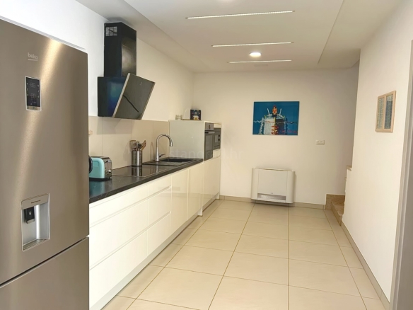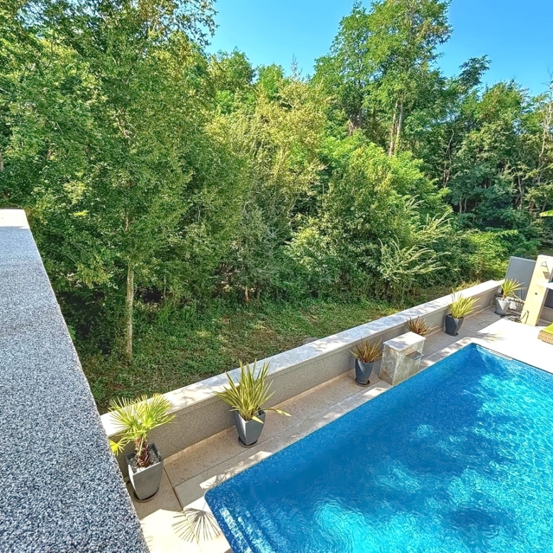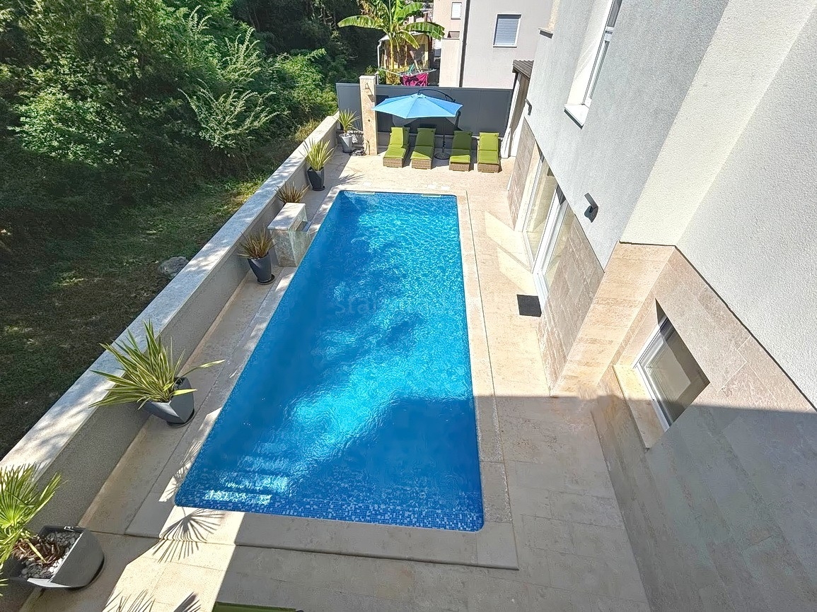 As part of the attractive Kvarner real estate offer by Stan Grad Immobilien, a designer-designed and modernly built tourist villa is for sale in the Mediterranean region of the northern Adriatic, on the island of Krk. This beautiful property is located in a peaceful area near Dobrinj, not far from the sea, yet far enough to ensure privacy and tranquility. It is a detached house spread across three levels, offering top-level comfort.
