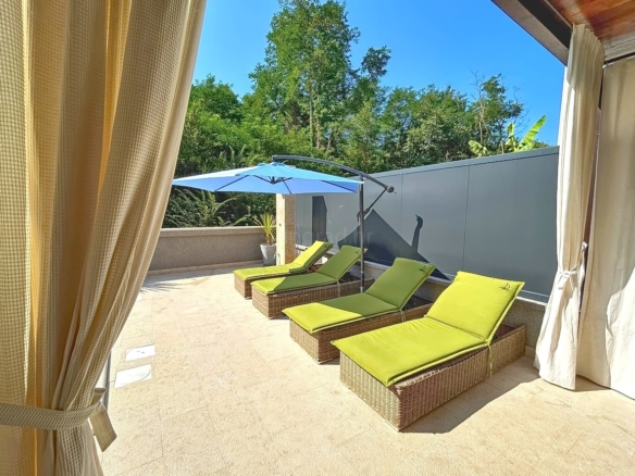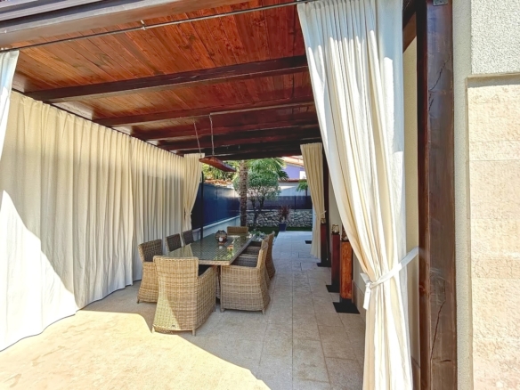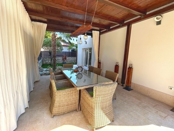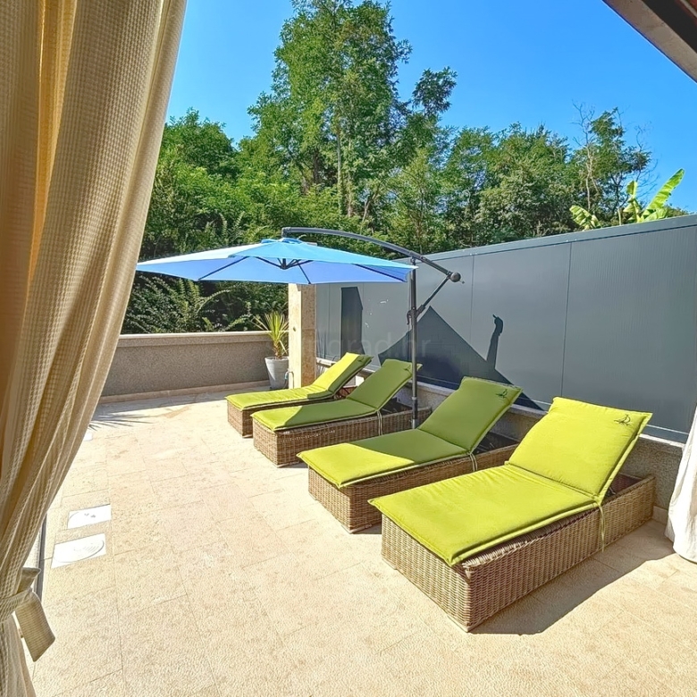 The total surface area of the house is 280 square meters. The ground floor features a living room, a kitchen with a dining area, a bathroom, and access to a terrace. On the first floor, there are two bedrooms, each with its own bathroom and access to a balcony. The second floor offers two additional bedrooms, also with private bathrooms and exits to a spacious terrace. The interior is exceptionally well maintained, luxuriously furnished, and equipped with modern appliances of the latest generation, providing a high standard of comfort. The beautifully landscaped garden with a swimming pool and sun deck adds significant value to the property, and the villa also includes a sauna and a fitness area.