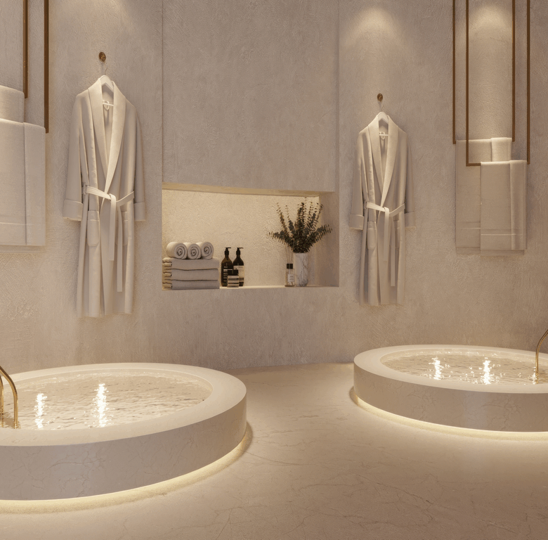 Bathrooms: Spa-inspired, with mosaic wall tiles, smart lighting, and premium sanitary ware