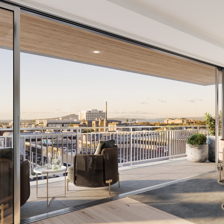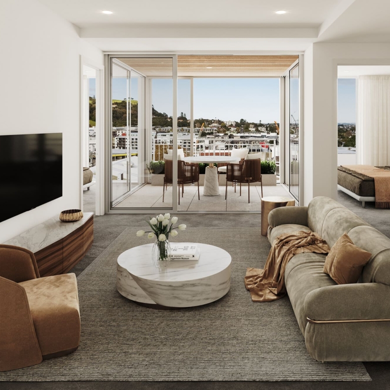 Living & Dining:An open-plan living/dining area flows seamlessly into a loggia (winter-garden) — a versatile space with sliding/folding glazing that merges indoor comfort with outdoor beauty. Enjoy sweeping views of Rangitoto, Mt Eden, and the Auckland skyline, perfect for alfresco lounging or entertaining.