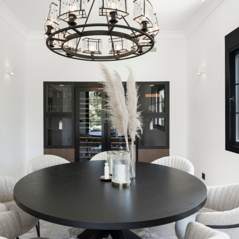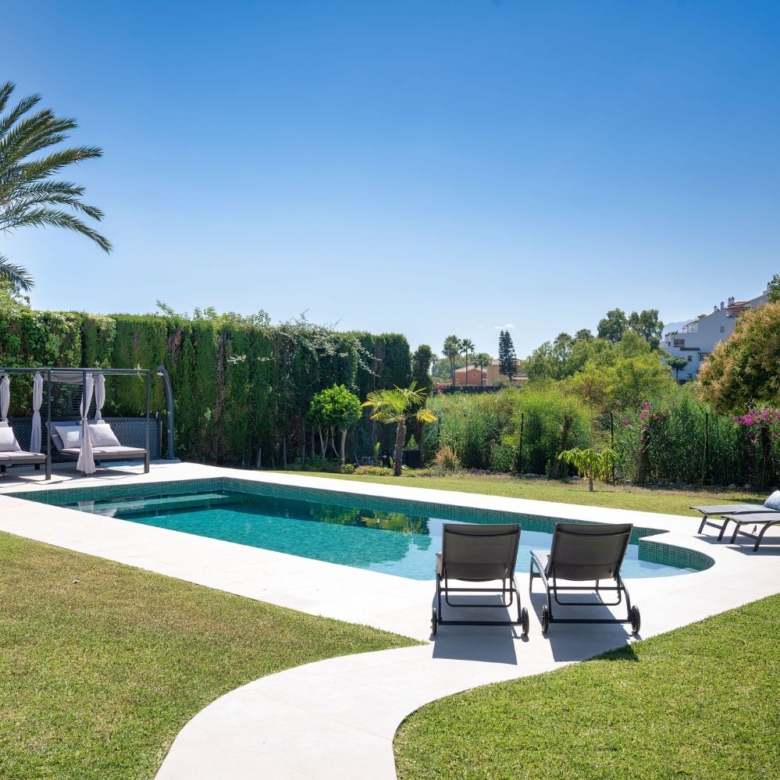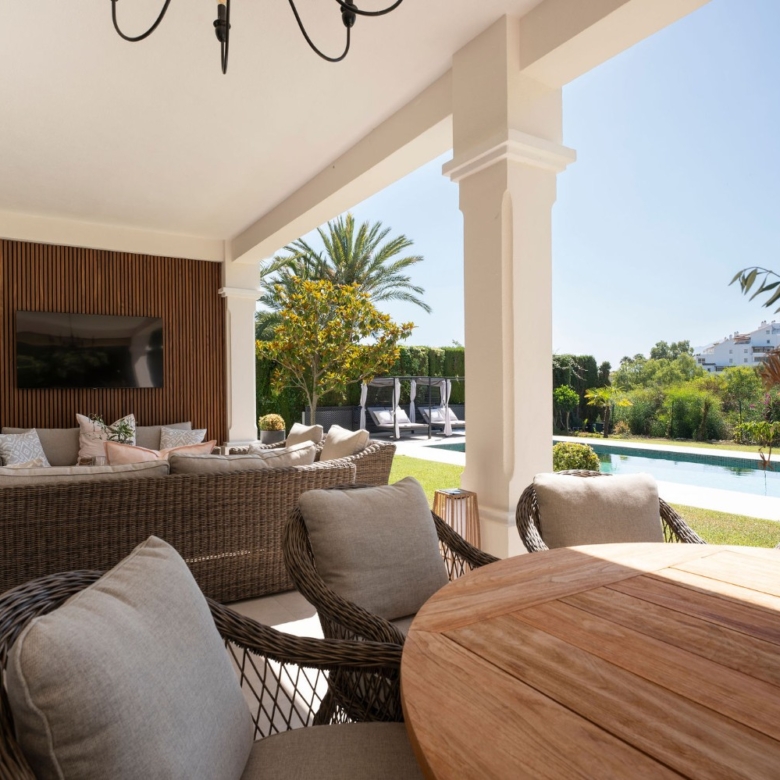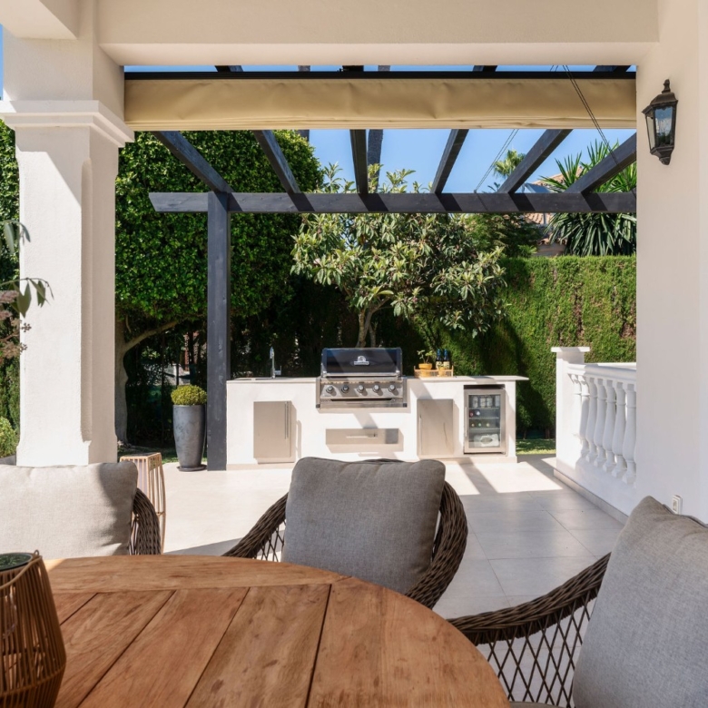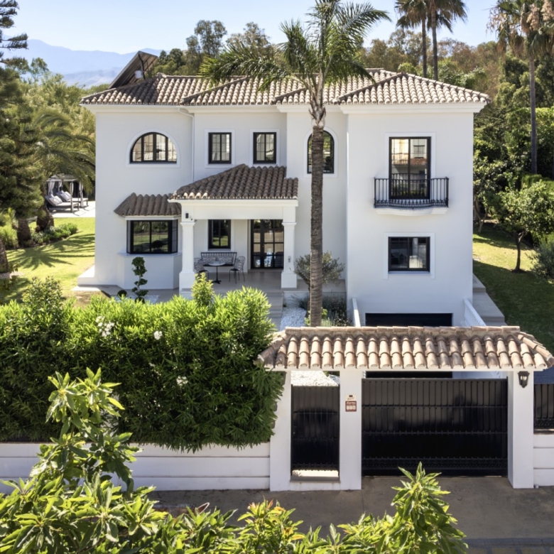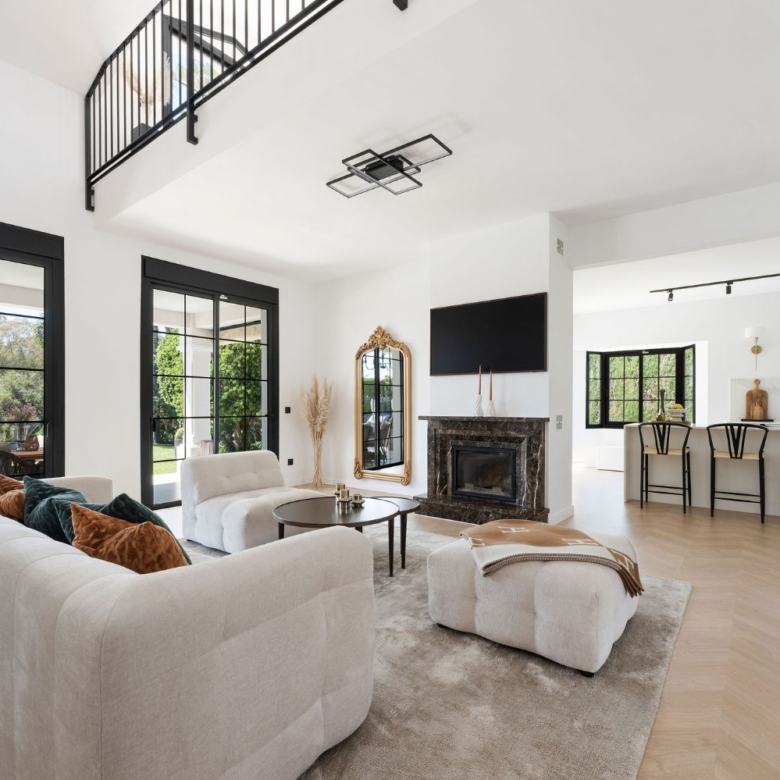 Welcome to this exquisite villa, recently transformed through a complete renovation, where modern elegance meets Scandinavian design. Upon entering, you’re welcomed by an abundance of natural light and an open, airy ambiance, perfectly complemented by carefully selected materials. The spacious ground floor boasts an open-plan layout, featuring both formal and informal dining areas, a dedicated office space, and a stylish en-suite bedroom. Expansive terrace doors seamlessly connect the indoor and outdoor spaces, leading to a covered terrace, a BBQ area, and a beautifully landscaped garden with a heated pool—ideal for year-round enjoyment. Upstairs, the serene master suite offers a private retreat, accompanied by a cozy relaxation area and two additional bedrooms sharing a well-appointed bathroom. The basement level is designed for ultimate comfort and entertainment, featuring a home cinema, a large laundry area, a family bathroom, and a fifth bedroom. From here, you also have direct access to the garage. Located in a prestigious residential area between Puerto Banús and Estepona, this villa offers a prime location just a short drive from Marbella and the Golden Mile. With amenities close by and the beach within easy reach, this is a true gem of a property!
