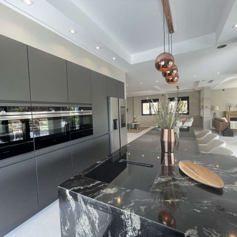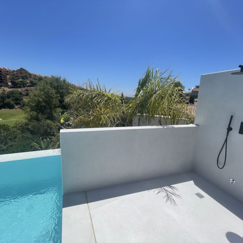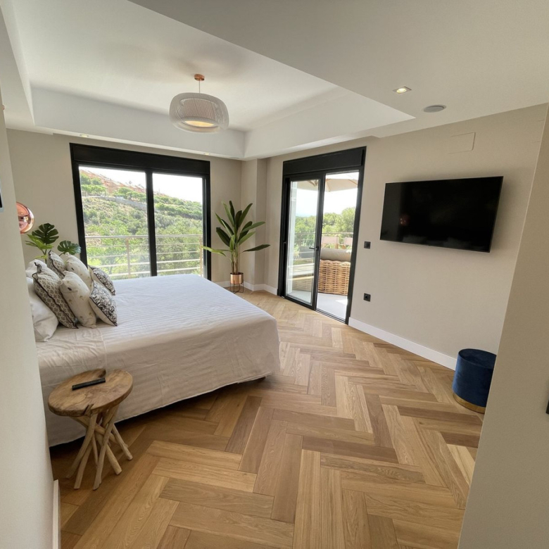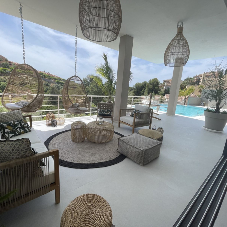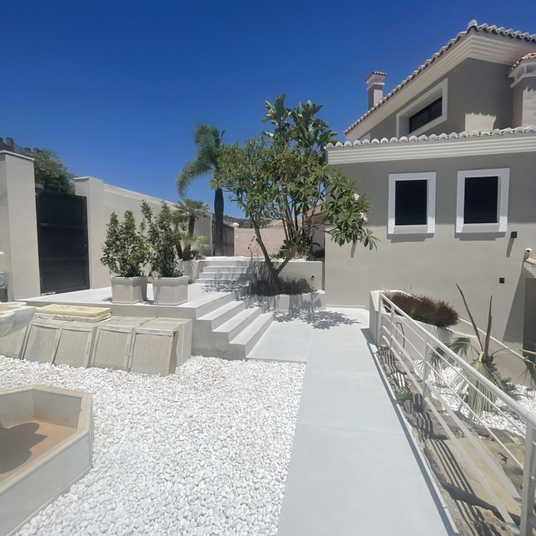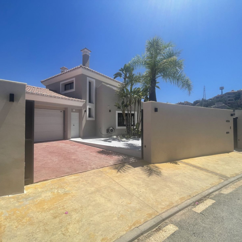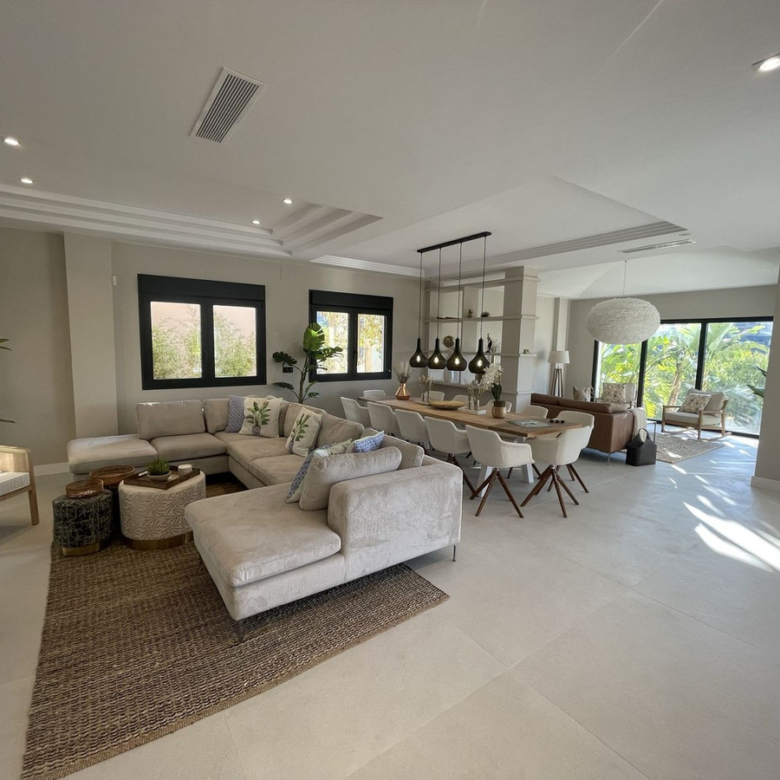 A luxurious villa with breathtaking sea and golf views. Will be fully finished by end of June. This unique property located on the first line golf of the Santa Maria Golf Course in Elviria Marbella was fully renovated to the highest standards. It offers 7 bedrooms, an office and 7,5 bathrooms, home cinema, gym and spa with Turkish steam bath and sauna. The villa is divided into 5 floors which are accessible via the indoor elevator. The private garage for 2 cars is equipped with an electric car charger. The villa was completely reconstructed. The plumbing offers 2 solar boilers with 600L capacity, a water filter/softener and recirculation pump. All appliances are new and energy efficient. The windows have been replaced by aluminum isolated windows with electric shutters. The villa is equipped with the maximum allowed amount of solar panels. All bathrooms and the living room and kitchen are equipped with floor heating. The bathrooms are modern and equipped with Grohe taps. Both inside as outside the same greige large tiling is applied and the bedrooms have wooden floors. The kitchen is fully equipped with an island, a hotplate with build-in extractor, 2 wine fridges, an interactive (Samsung) American Fridge, a steam oven, oven and microwave, plate warmers, a dishwasher, all of Siemens IQ line. The Quooker watertap has instant boiling water. Furthermore the house is equipped with Siemens light switches and Fibaro demotica home automation. The villa is equipped with a UniFy WiFi network as well as all a multiroom streaming audio system with Bose speakers and an alarm system with cameras for maximum security. The entrance door is equipped with Doorbird and opens automatically. The Mitshubishi airconditioning is divided per floor and equipped with Airzone. The lush garden will be full of bamboo, palm trees, a waterfall and a marble fountain. The garden is equipped with an irrigation system and contains a private vegetable garden. The garden (and the outside) of the house will be beautifully lighted. The bright-colored interior will be the icing on the cake of this modern villa with the Andalusian feeling. You just have to grab your bags and you are ready to move in your dream home. Property ID: MLH-R4070134 Price: €3,790,000 Property Size: 579 m2 Land Area: 1335 m2 Bedrooms: 7 Bathrooms: 7 Property Type: Detached Villa Property Status: For Sale