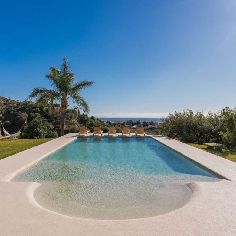 This newly completed, luxurious property in Estepona is set in the mountains with panoramic sea and Sierra Bermeja mountain views. Located just 2 km from the historic center, it offers full privacy on a 3058 m2 plot. The property includes 6 bedrooms, 2 closed kitchens, an outdoor kitchen, infinity pool, sauna, and petanque court. The main house has 4 ensuite bedrooms, a custom walk-in closet, sea-view living areas, and a large terrace. Additional features include a guesthouse, service area, sustainable elements like solar energy, and options for wellness activities or year-round rentals. Ideal for those seeking a premium property in Estepona’s growing and vibrant area, this residence is a true masterpiece and a remarkable opportunity for those seeking a high-end property in Estepona.