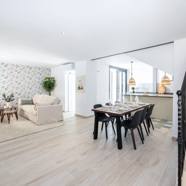 This quaint and distinctive home is situated in the center of the popular Estepona’s old town and historic district and is fully renovated and presented ready to move into. Excellent location on a peaceful street with easy access to the beach, the new promenade, dining options, and other facilities with only a short stroll. The townhouse has three bedrooms spread across three floors. A large, light-filled open concept living room and dining area with a contemporary, fully furnished kitchen featuring a central island can be found on the ground floor, entrance level. An interior patio that adds Andalusian character and charm floods this level with natural light. There are two extremely roomy bedrooms and a large bathroom with a patio on the first level. The third bedroom and a second bathroom are located on the third floor. A sizable solarium offering lovely views of the Bermeja mountain range and Estepona’s historic town may be accessed from this point. It is strongly advised to view this opulent townhouse that is ready for keys.
