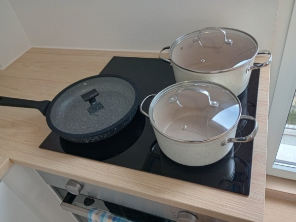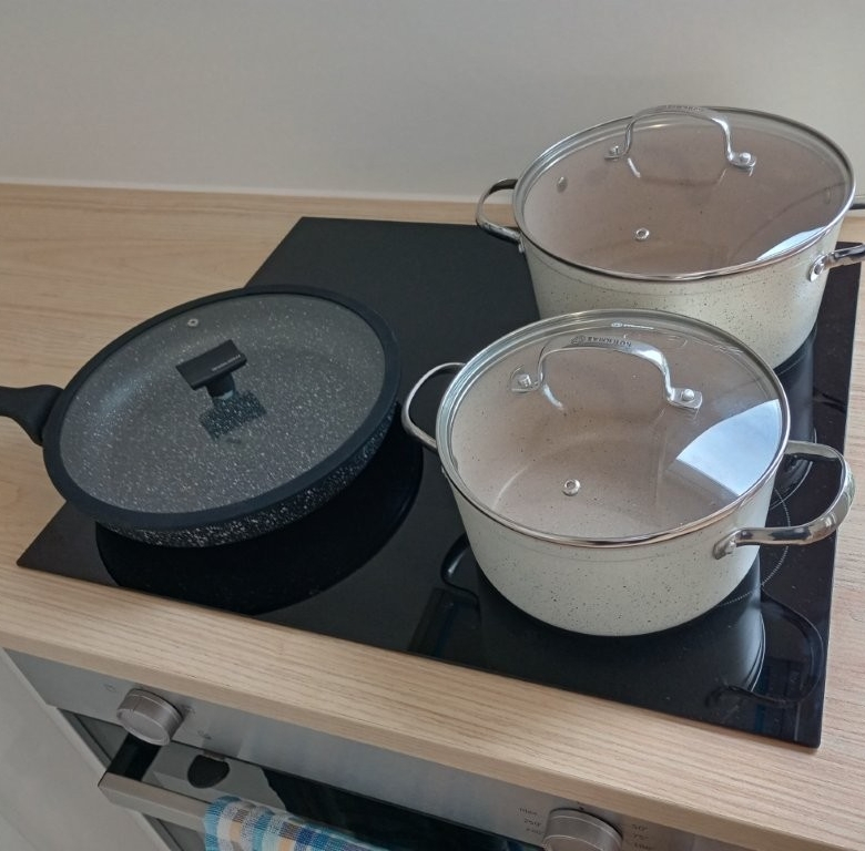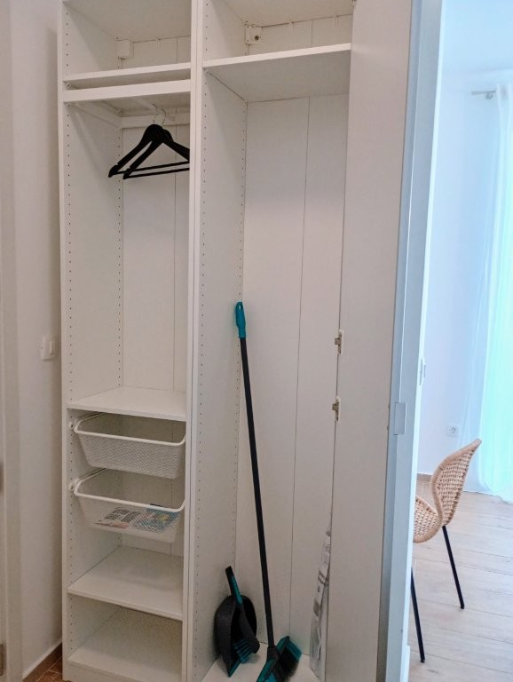 The living area is furnished with comfortable seating, including a pull-out sofa bed, providing flexible accommodation for guests. A flat-screen television offers entertainment, while a coffee and tea maker provides essential comforts. The apartment is fully stocked with utensils, cookware, linens, and cleaning supplies, ensuring a seamless transition for new residents.