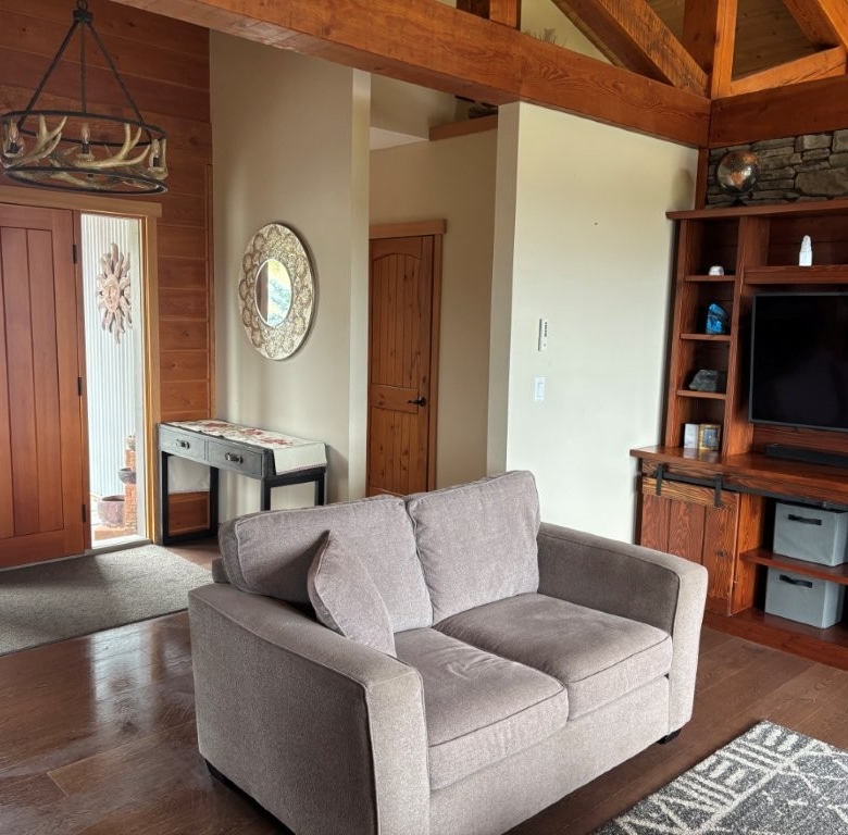 The property is anchored by two main structures: a beautifully crafted 1,400-square-foot timber-frame house, which serves as the primary residence, and a charming, standalone guest cabin. Both of these buildings are completely off-grid, a testament to sustainable and independent living. They operate on a robust solar system with lithium batteries and a generator backup, ensuring a reliable and eco-conscious power supply. This design does not compromise on functionality, with all systems working flawlessly to provide a comfortable and modern experience. The main residence and the cabin were recently appraised at a combined value of $1,800,000, highlighting the significant value and quality of this unique estate.
