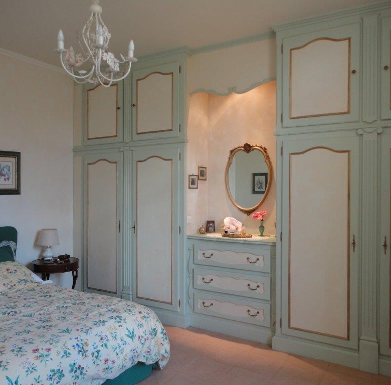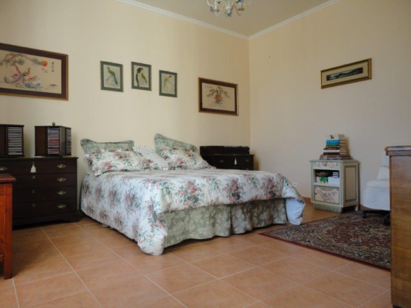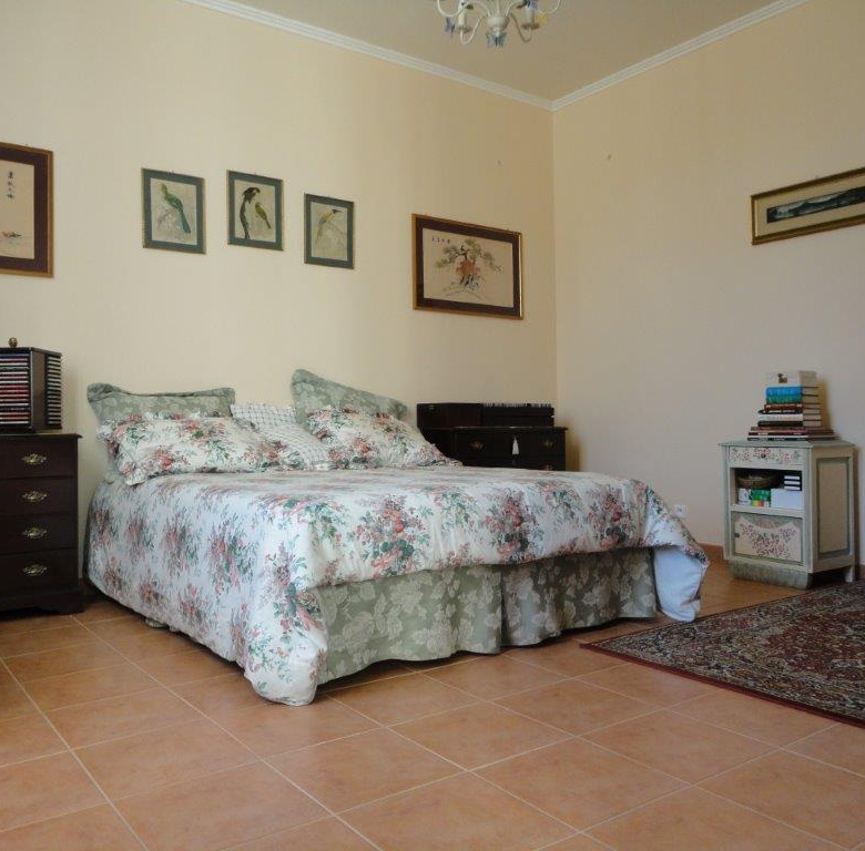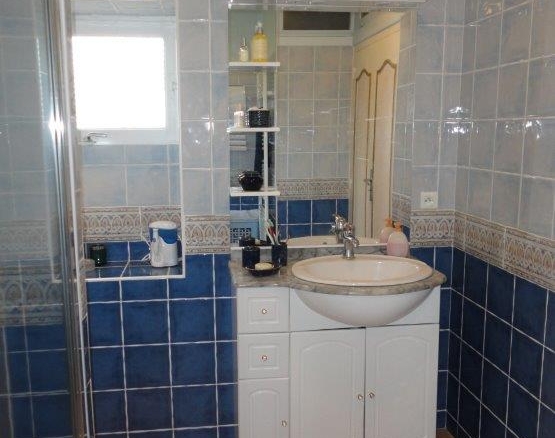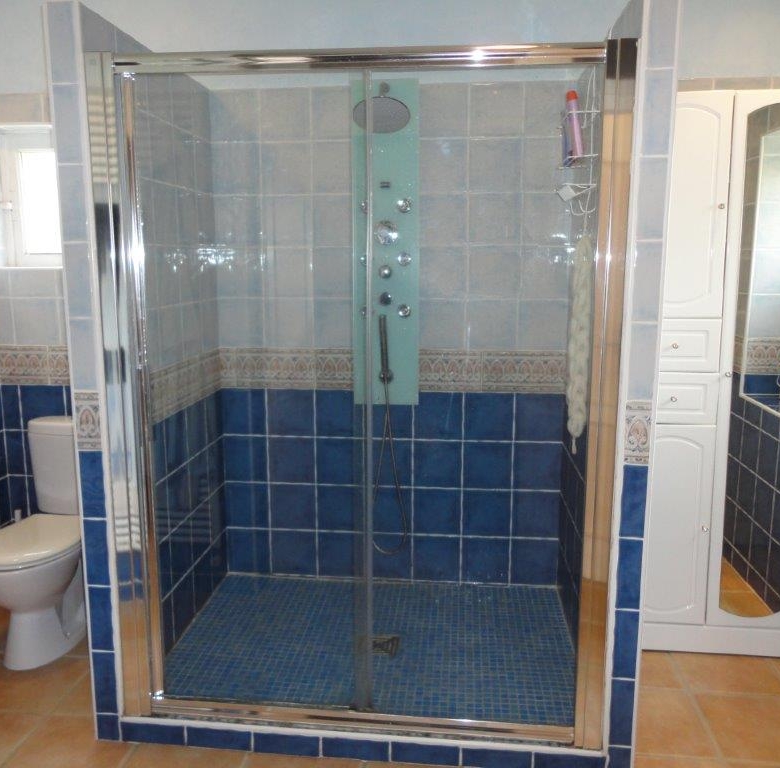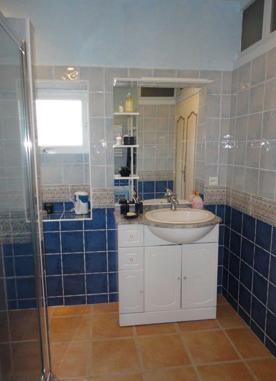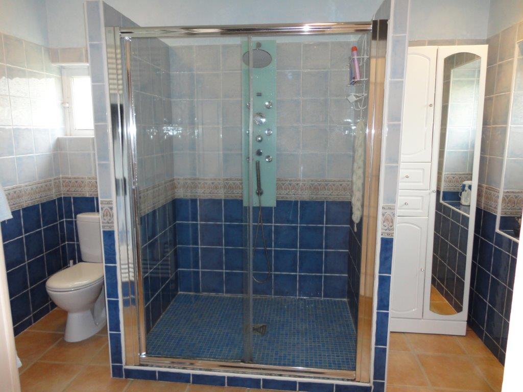 The main house is all on one floor, approximately 100 sq. metres. The accommodation includes two spacious double bedrooms (16 sq. m. and 18 sq. m.), one with a built-in closet which covers the length of the longer wall. Between the bedrooms is a very pleasant room (with working fireplace) of similar dimensions (17 sq. m.), currently used as a study/library, with French doors to the rose garden at the front of the house. A luxury bathroom features gorgeous Italian tile on the walls and floor. The super-spacious shower cubicle (1 x 1.4 m) is equipped with thermostatic taps, a rain shower-head and a telephone hand shower. The 200-litre hot-water heater is electric.