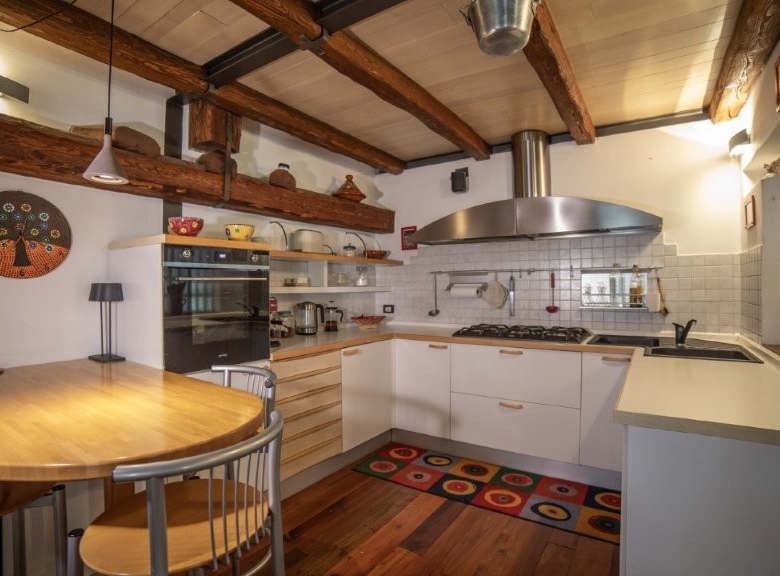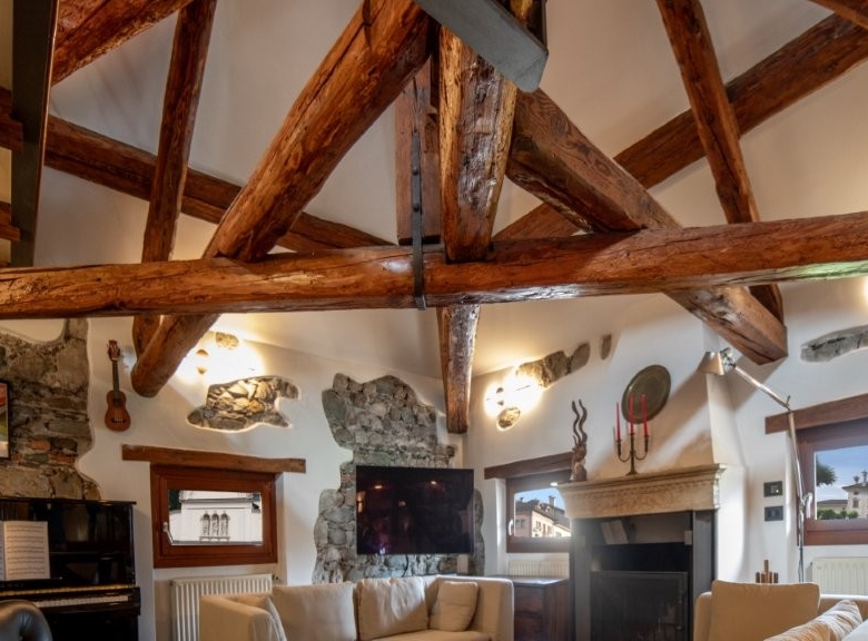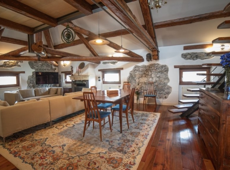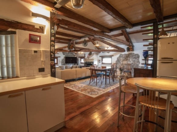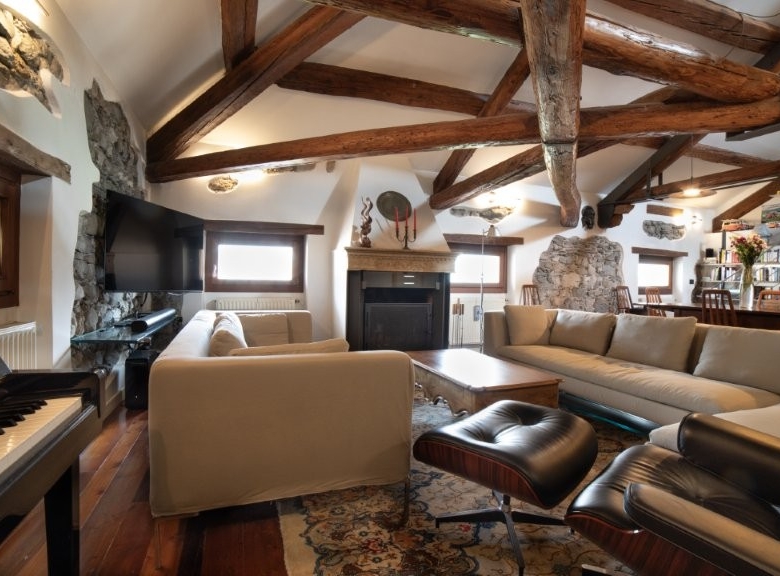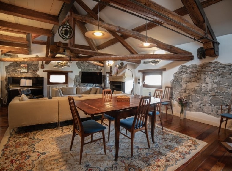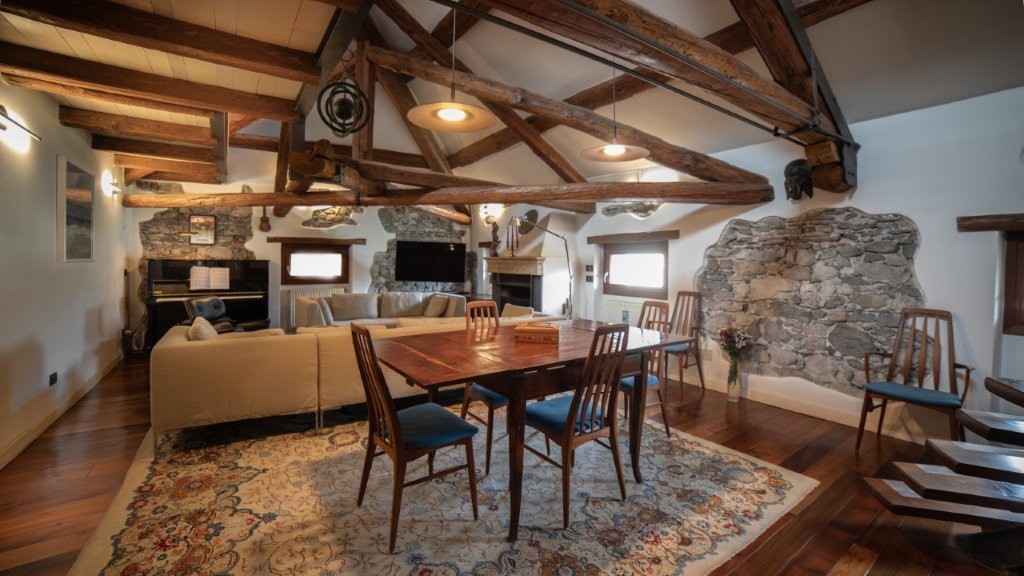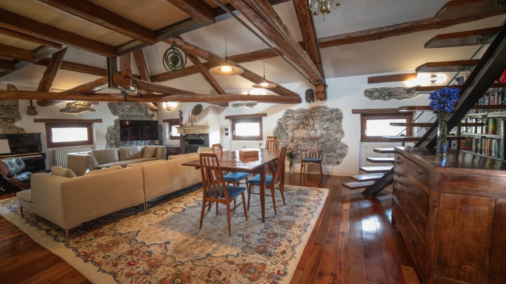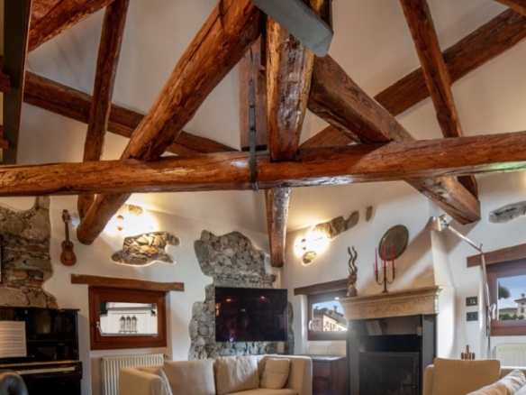 Step inside, and the heart of the home immediately captures attention: a vast living area designed for comfort and entertainment. This grand space is characterized by stunning exposed beams that highlight the architectural integrity of the building, a charming fireplace that promises cozy evenings, and an original stone wall that adds a touch of rustic elegance and historical authenticity. This blend of natural materials and classic design creates an inviting atmosphere, perfect for both intimate gatherings and larger celebrations.